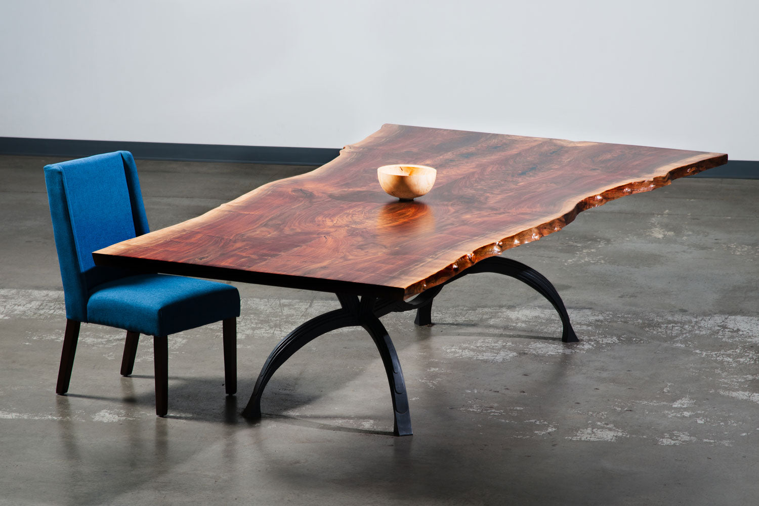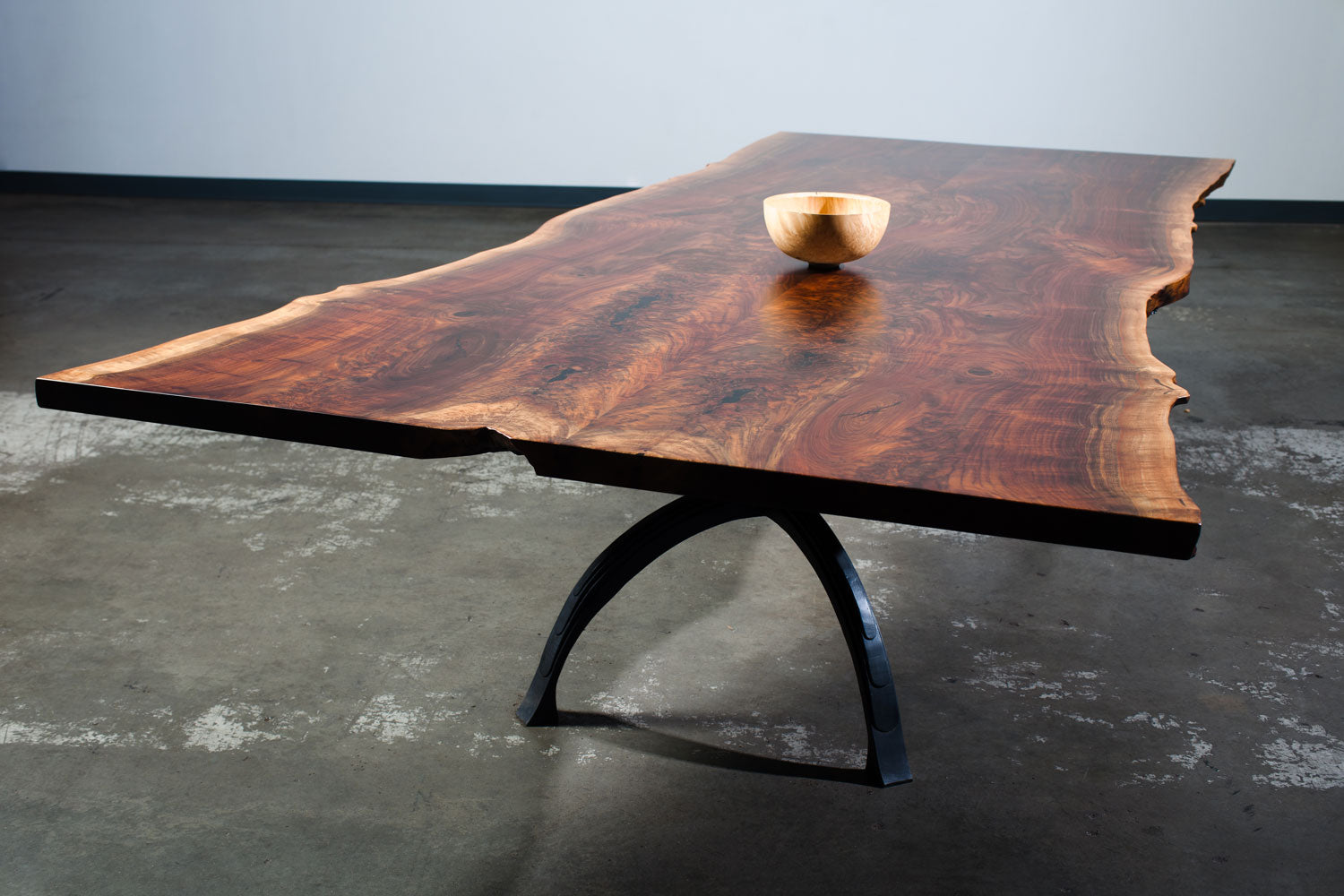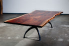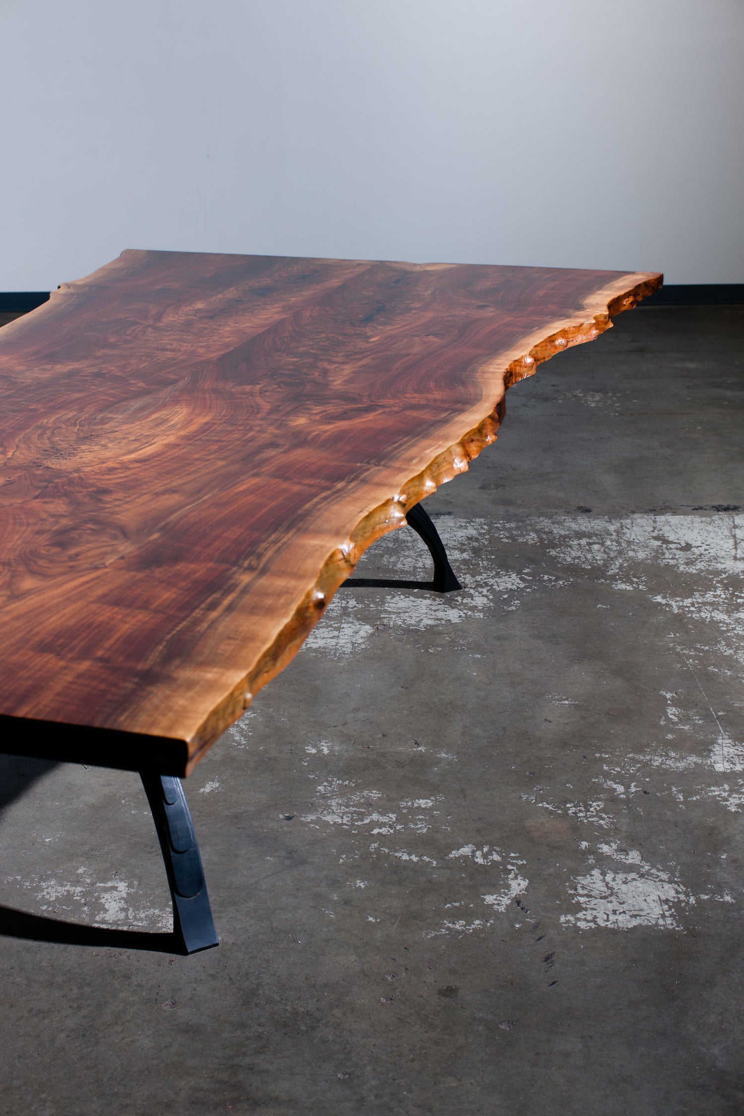 Large bookmatched claro walnut live edge table top perfect for business or entertaining. A great statement piece! We handcrafted this table from North American urban reclaimed slabs we hand-selected and had custom milled. We Rocky Mountain kiln dried them in Colorado. This table will comfortably seat 14. It is finished with a two part polymerized tung oil finish that enhances the grain definition while maintaining a natural, matte look. Durable and resistant to water and alcohol the surface is cleaned easily with water and mild soap. No other upkeep needed.