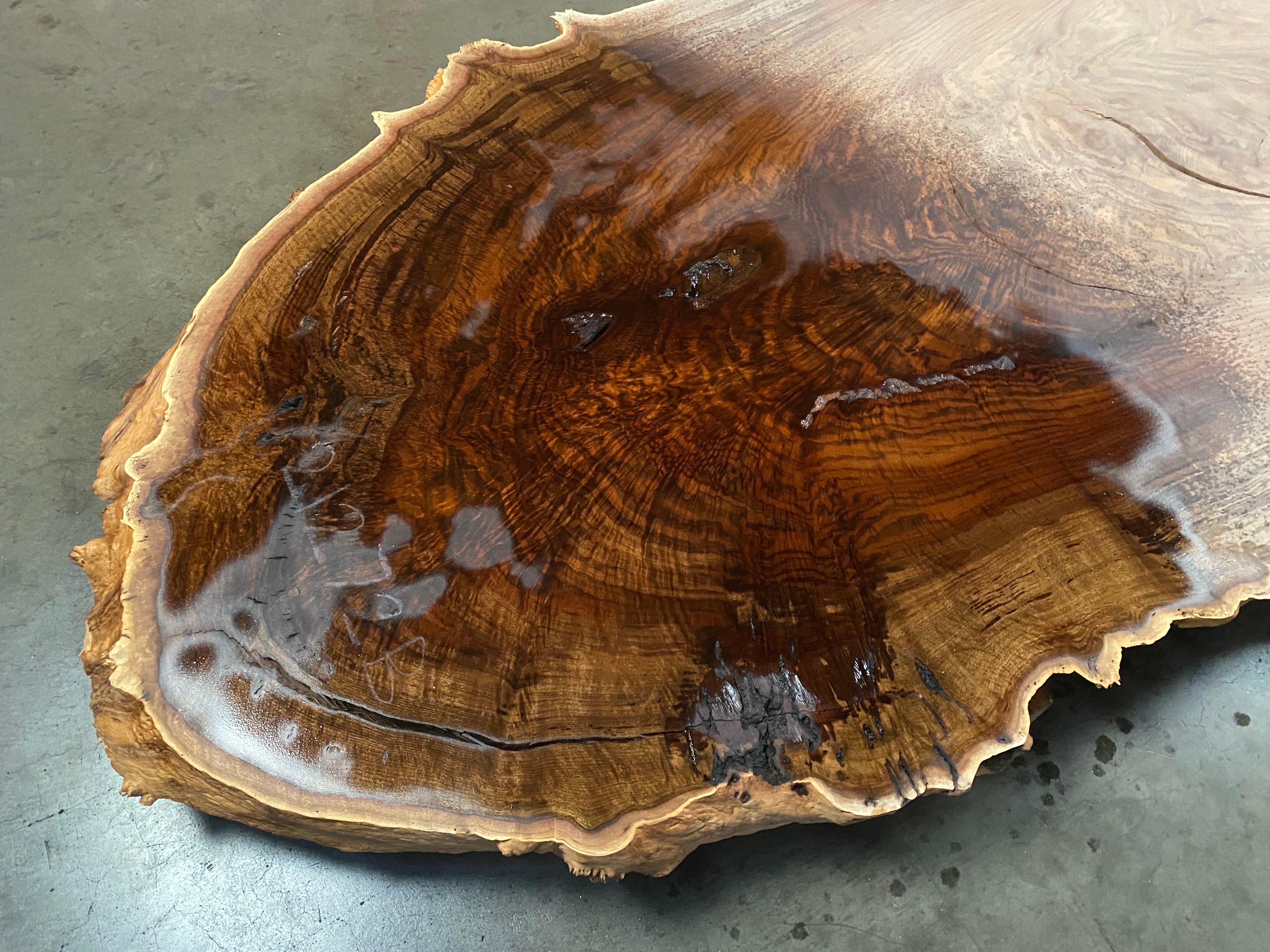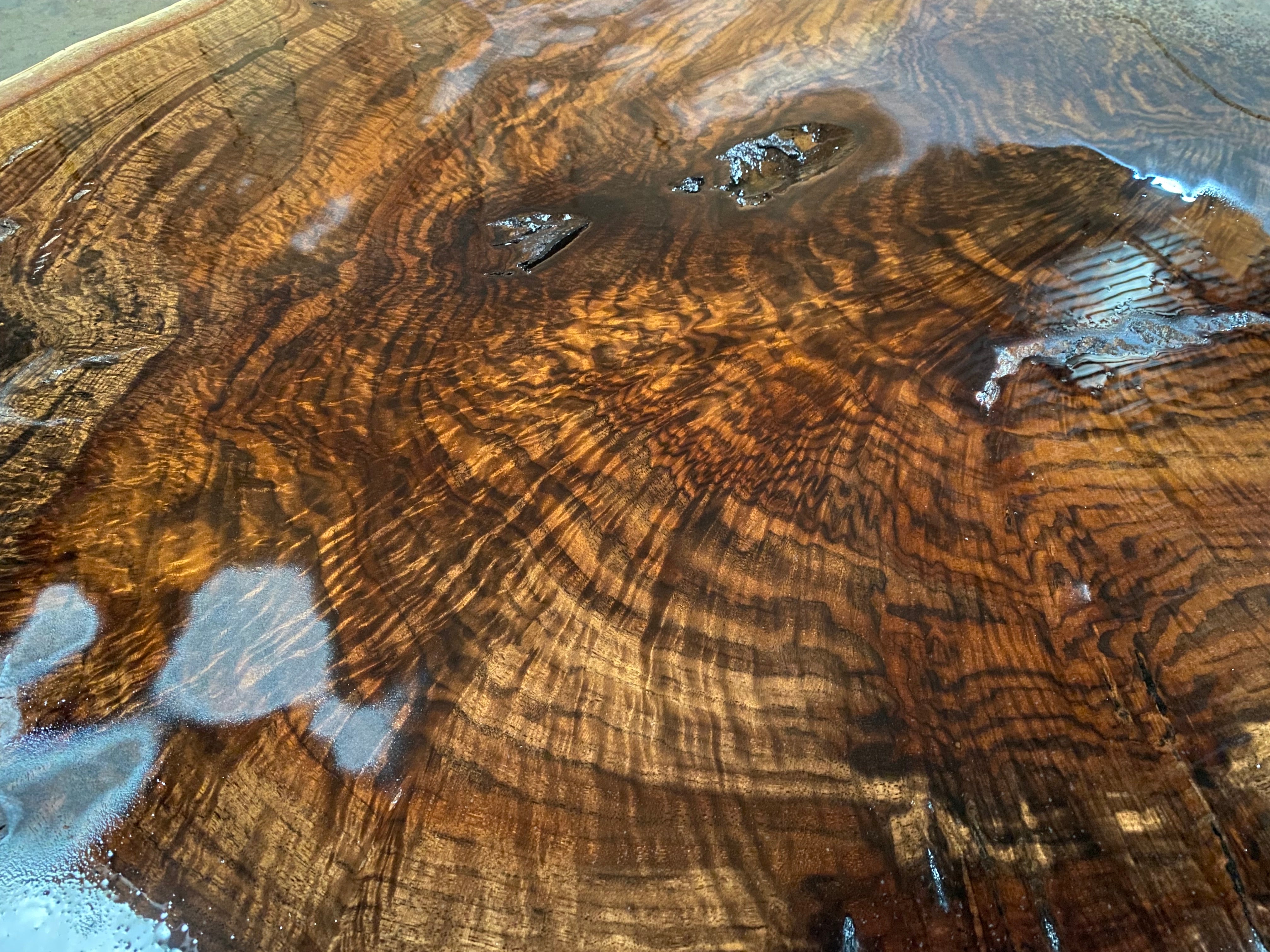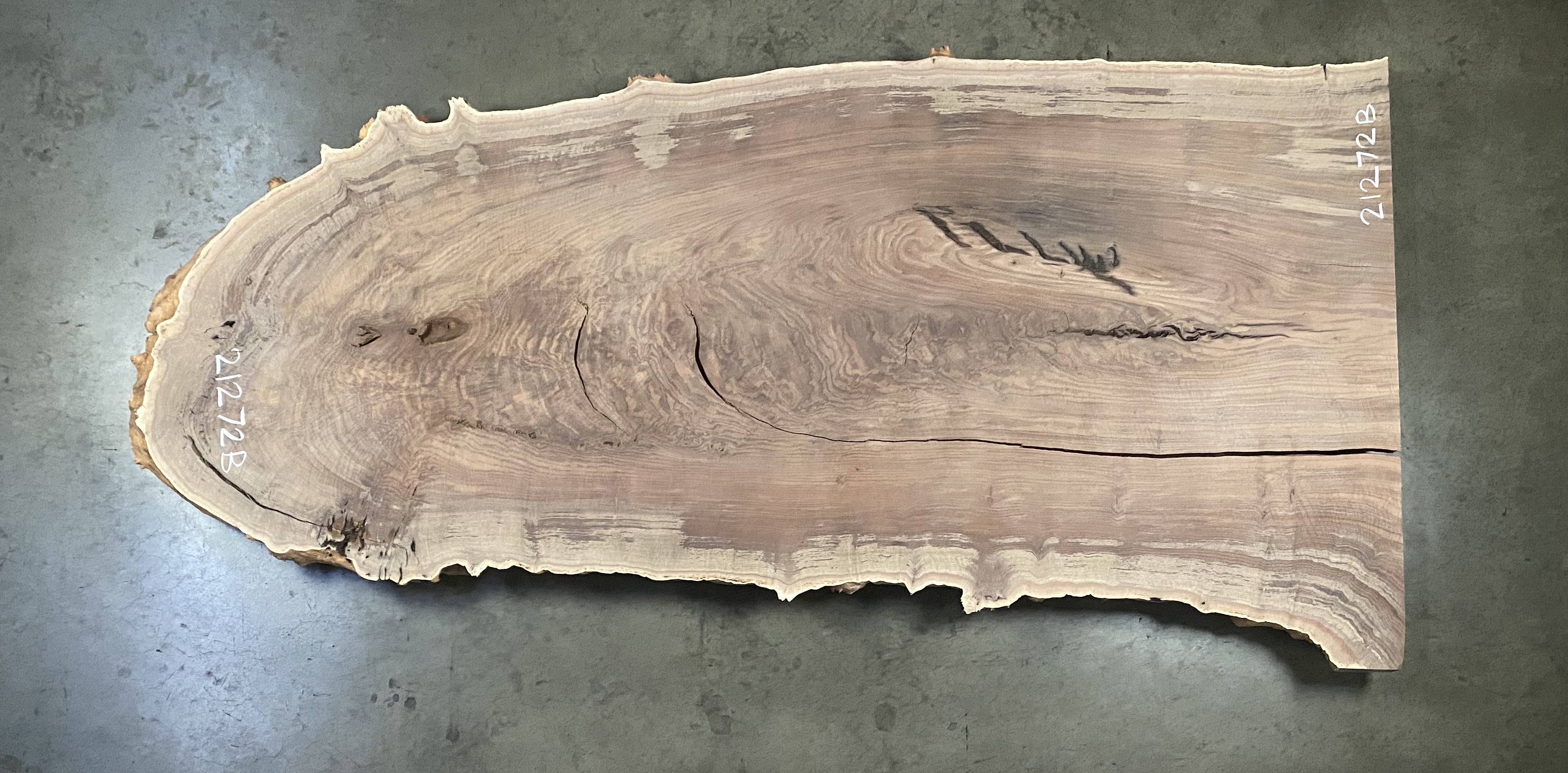 Leveled & gauged, sanded one side, large split, surface checks, burl clusters on edge, marbled coloration, highly figured