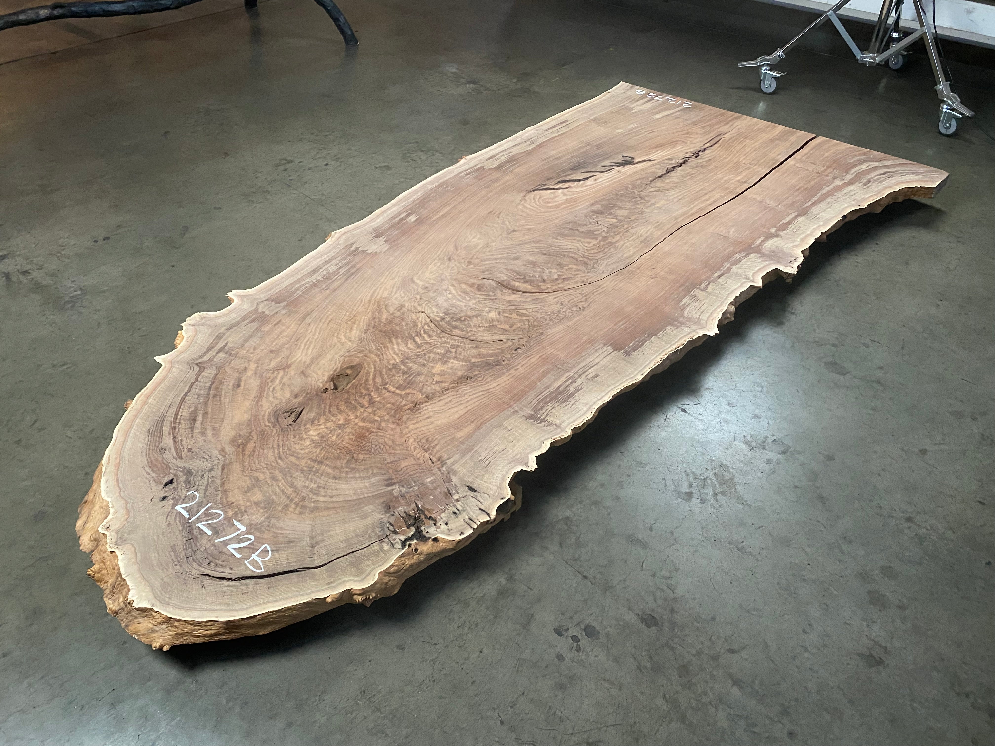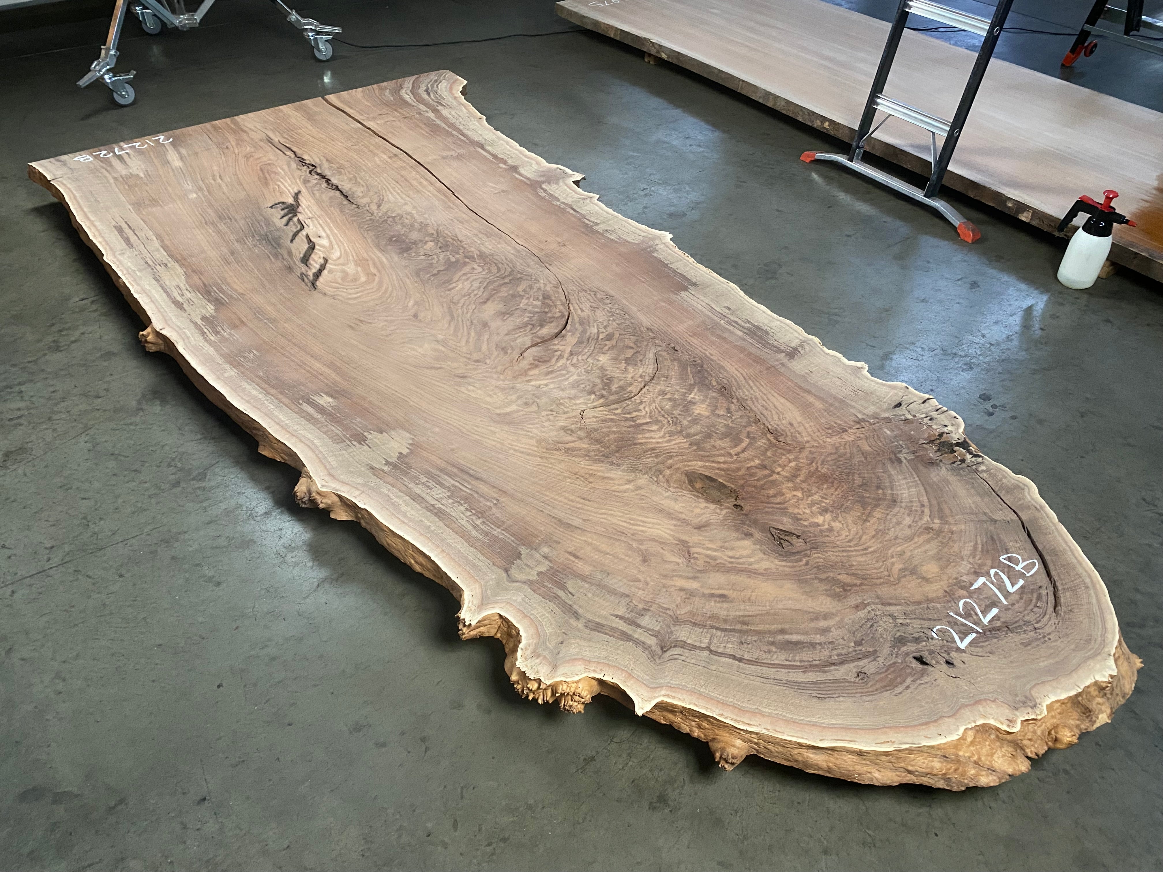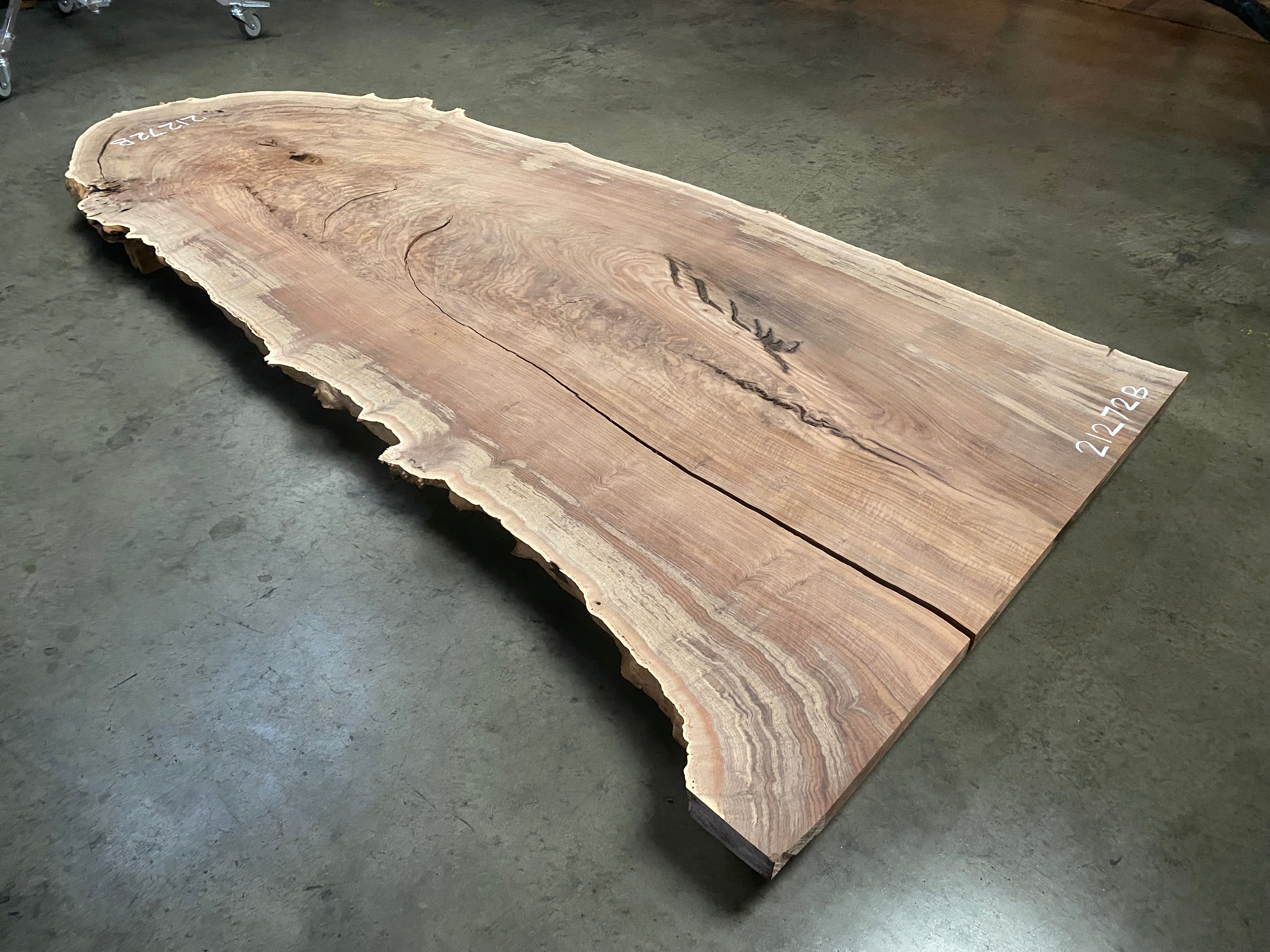 Leveled & gauged, sanded one side, large split, surface checks, burl clusters on edge, marbled coloration, highly figured