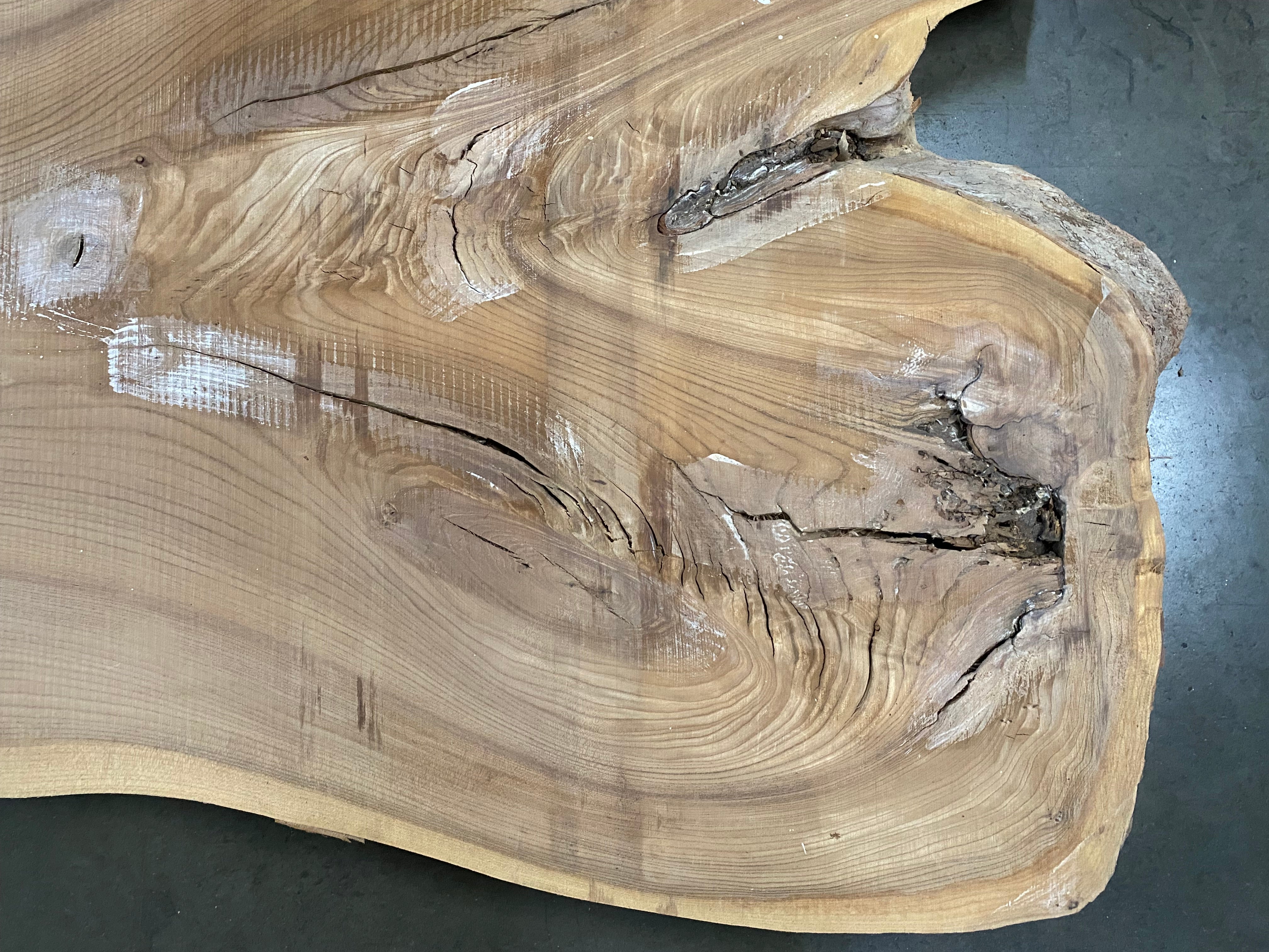 - Interlocking grain, almost 3 live edge crotch slab, blonde sapwood