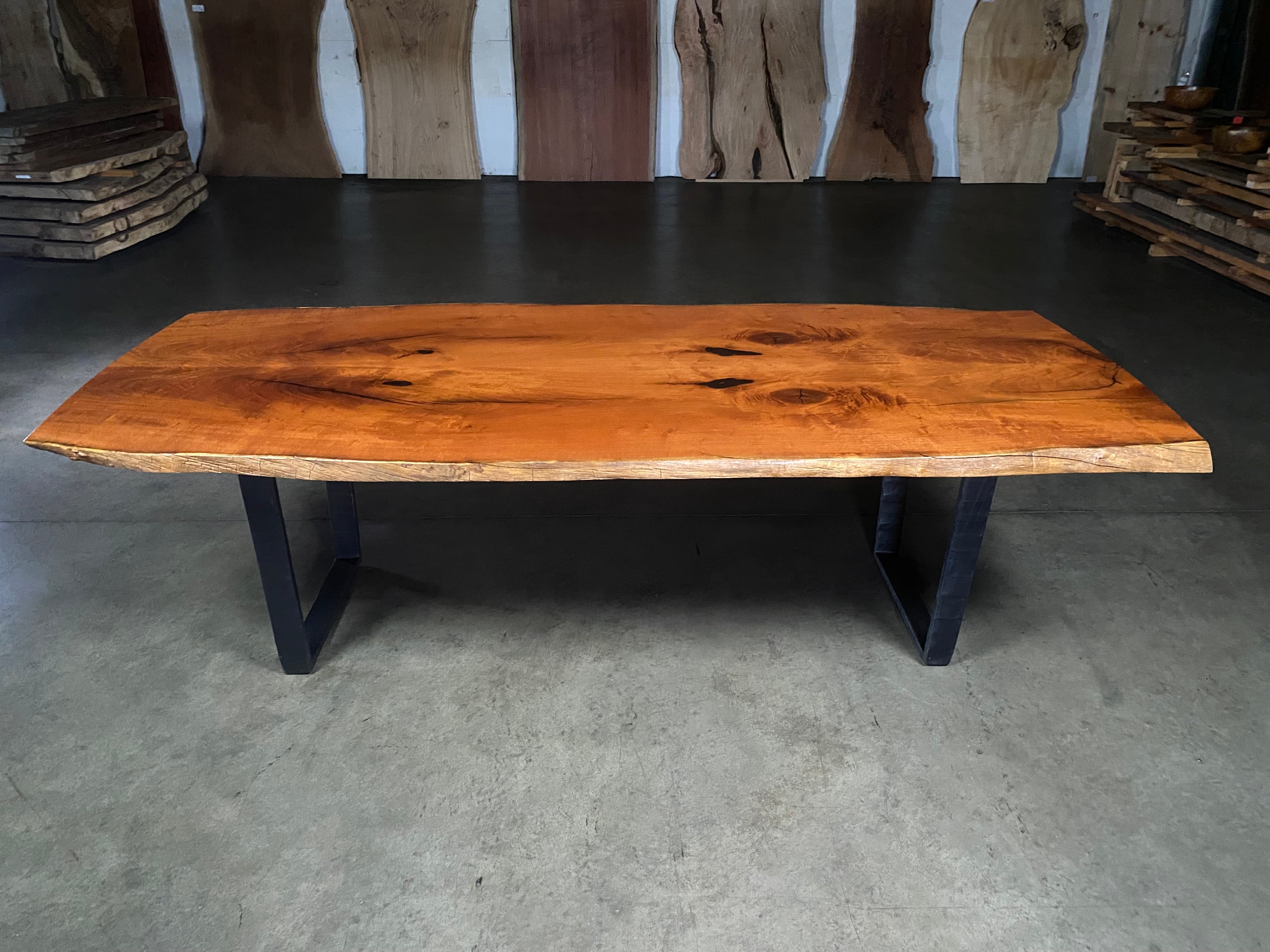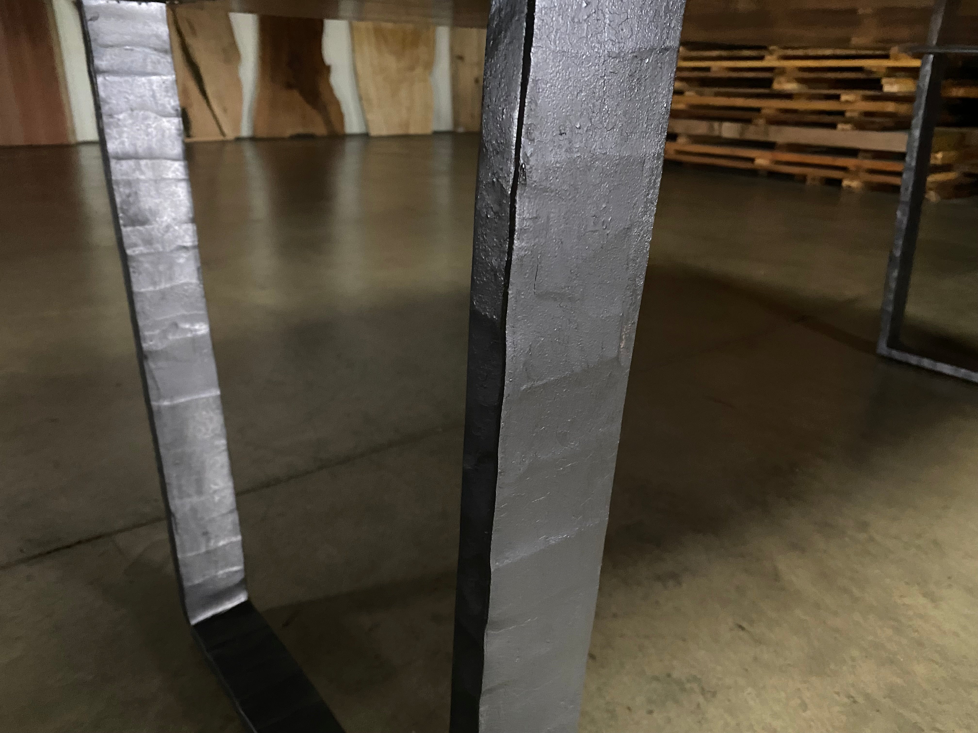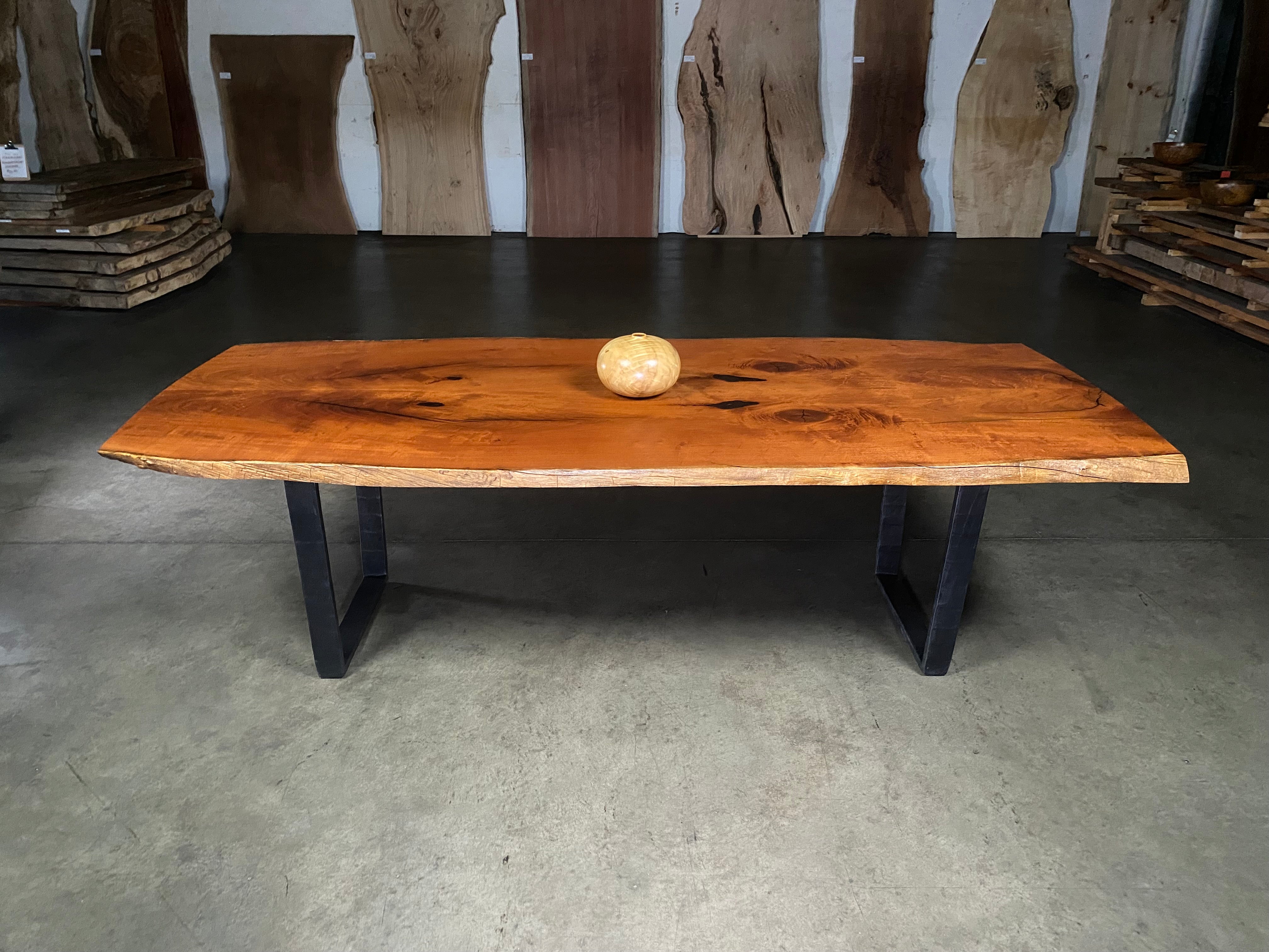 - Legs: Photographed with Forged Iron Trapeze Legs. Hand hammered texture. Crafted by artistic blacksmith David Norrie.