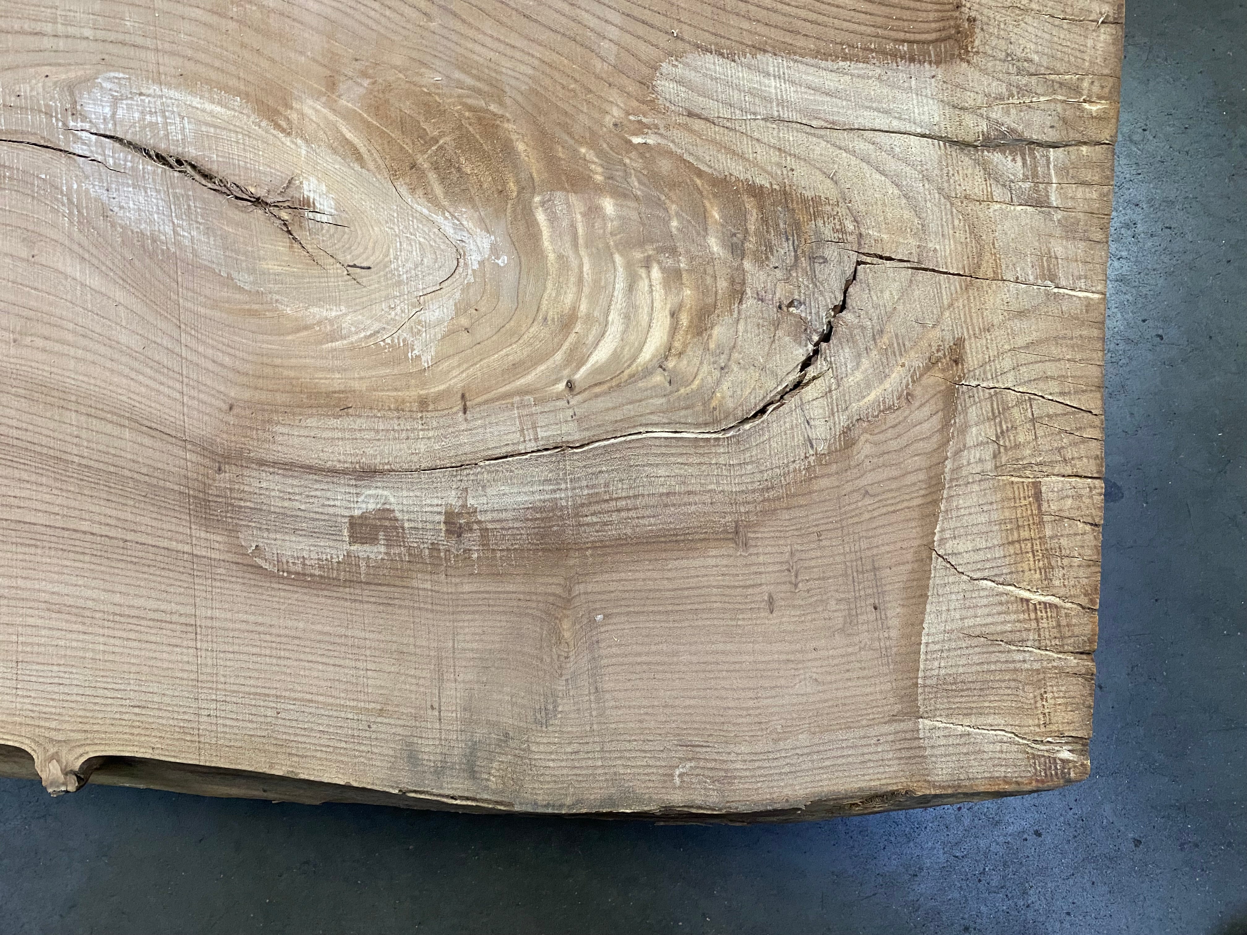 • Rough sawn, significant edge damage, end splits, large surface voids
