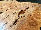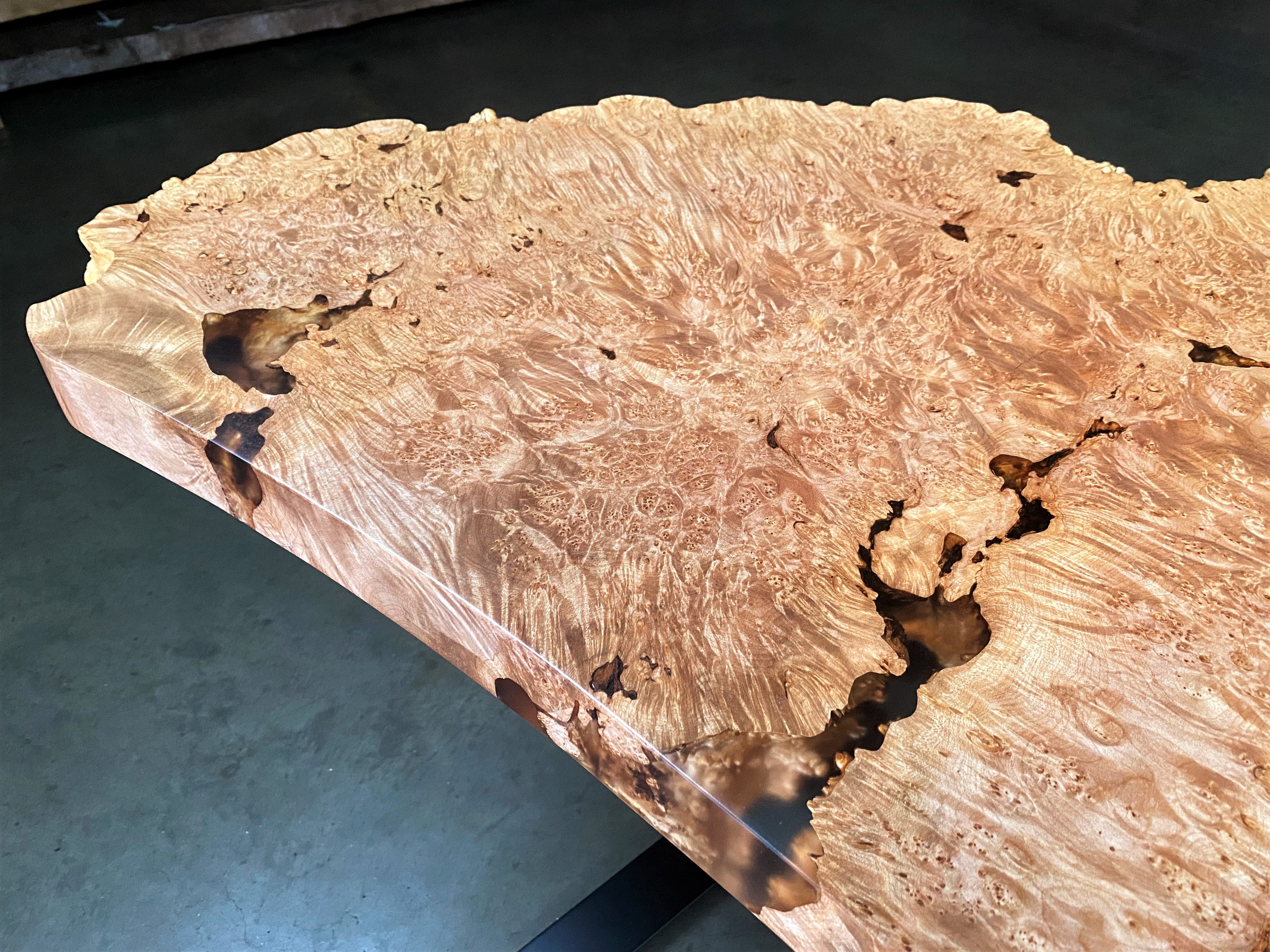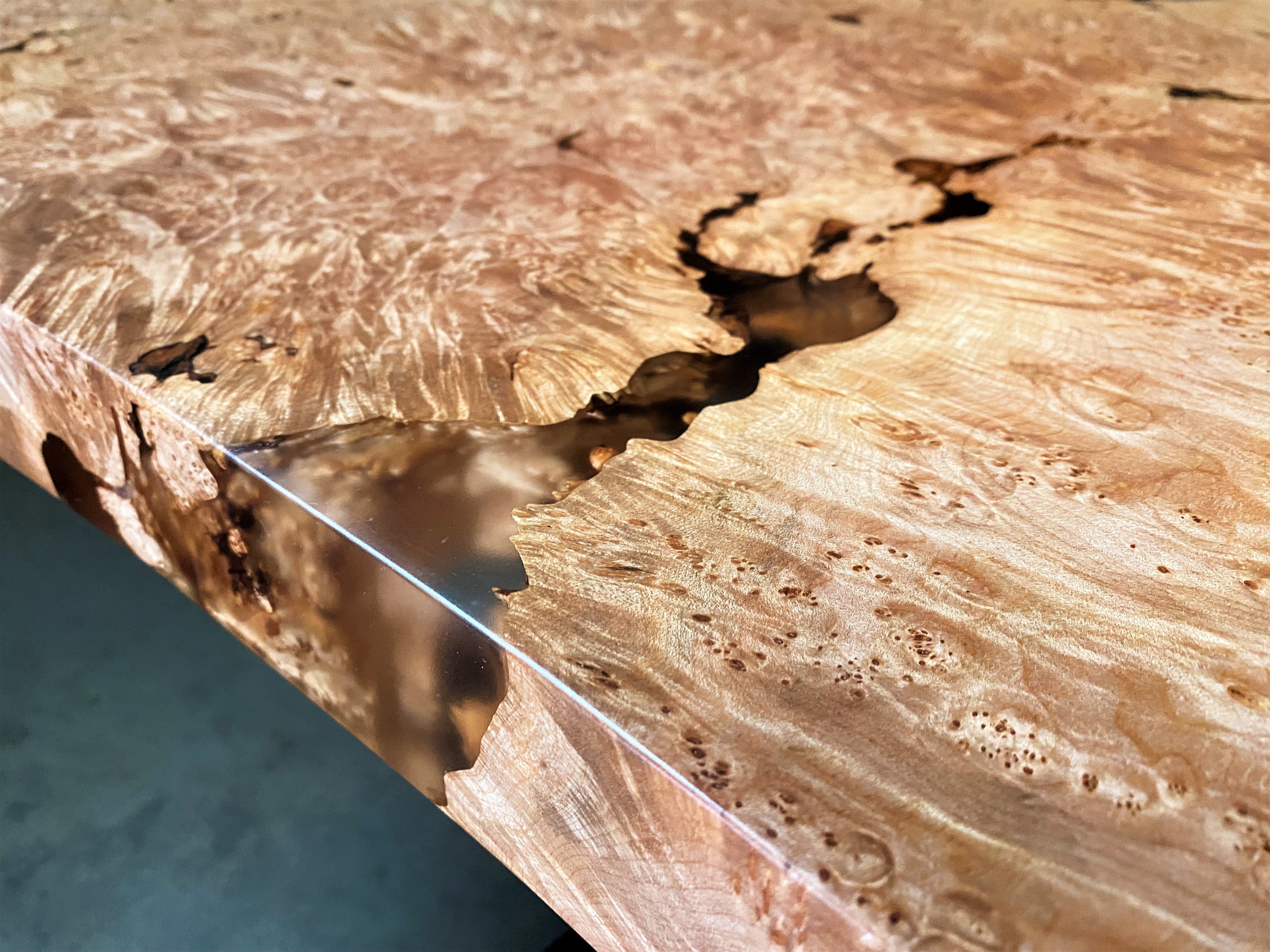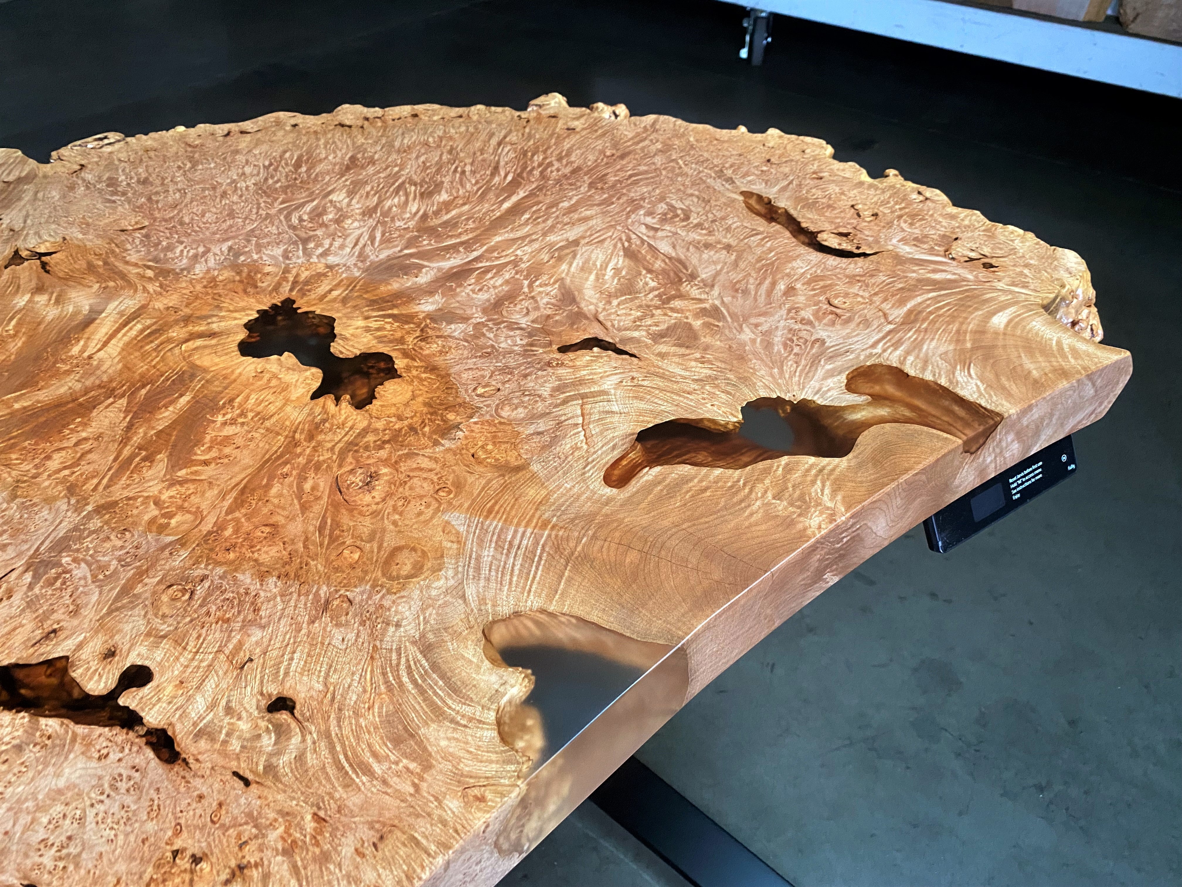 - Description - Natural burl edges with cut curved front edge. Highly figured burl with clear fills.