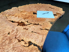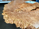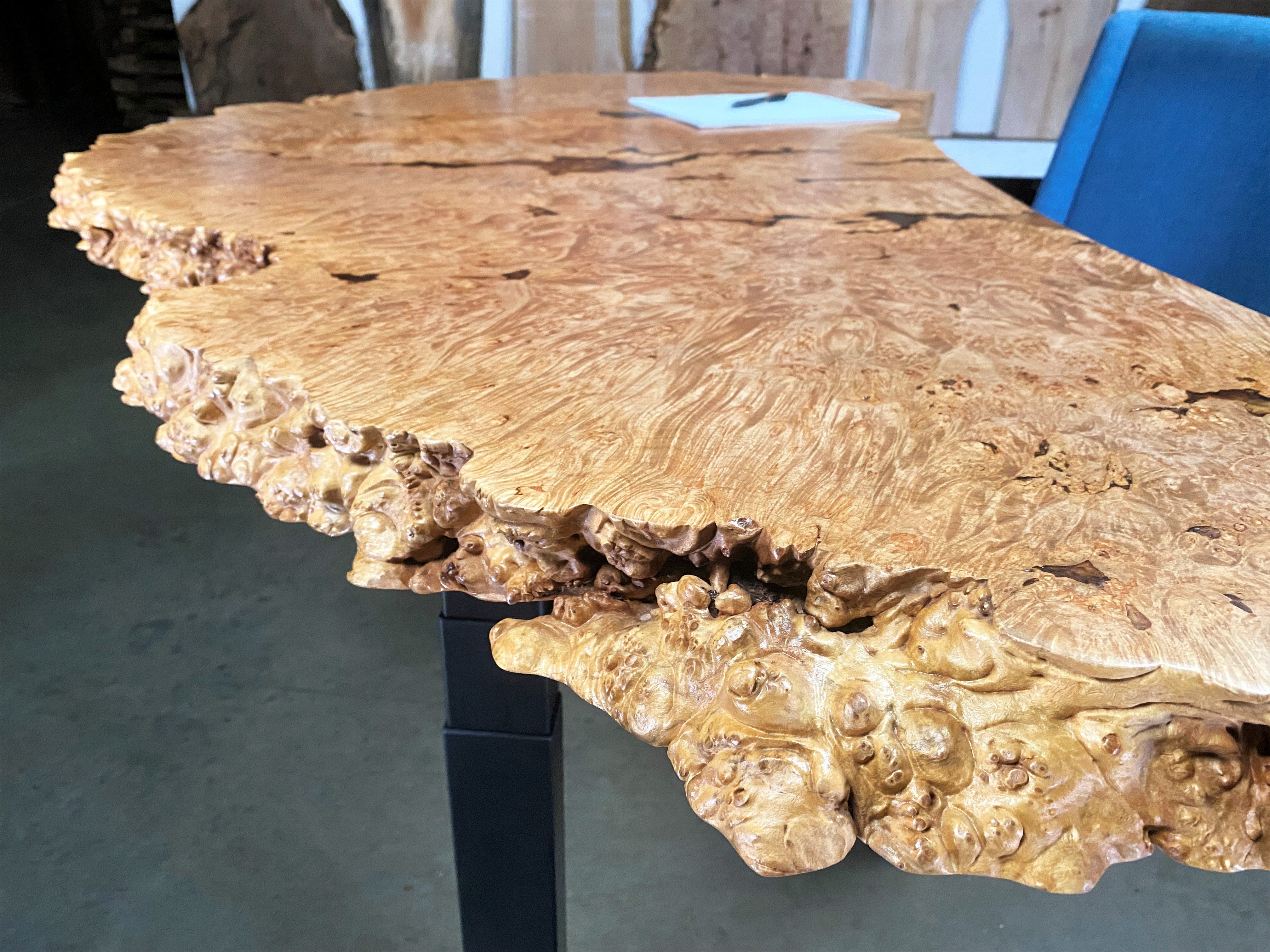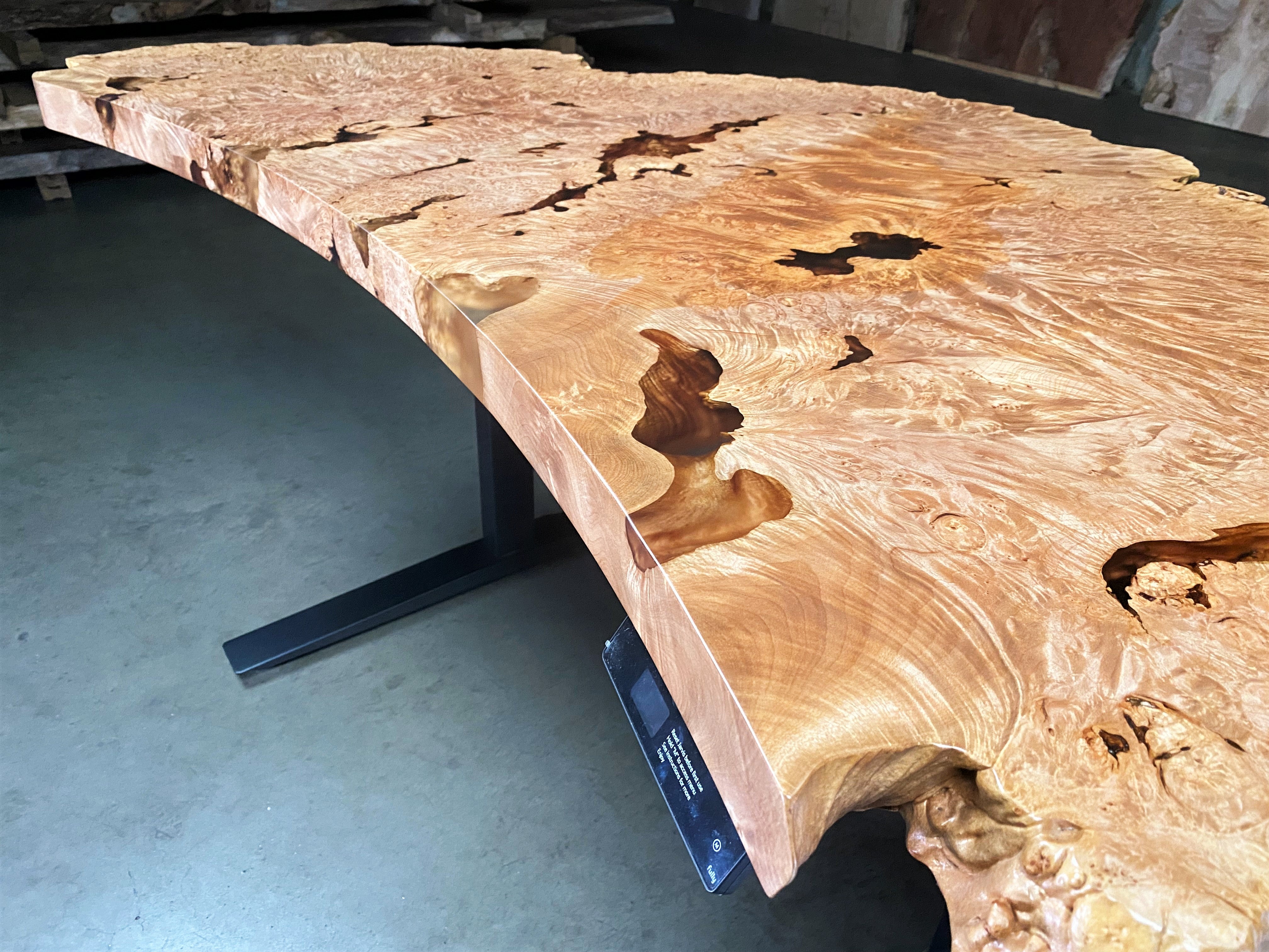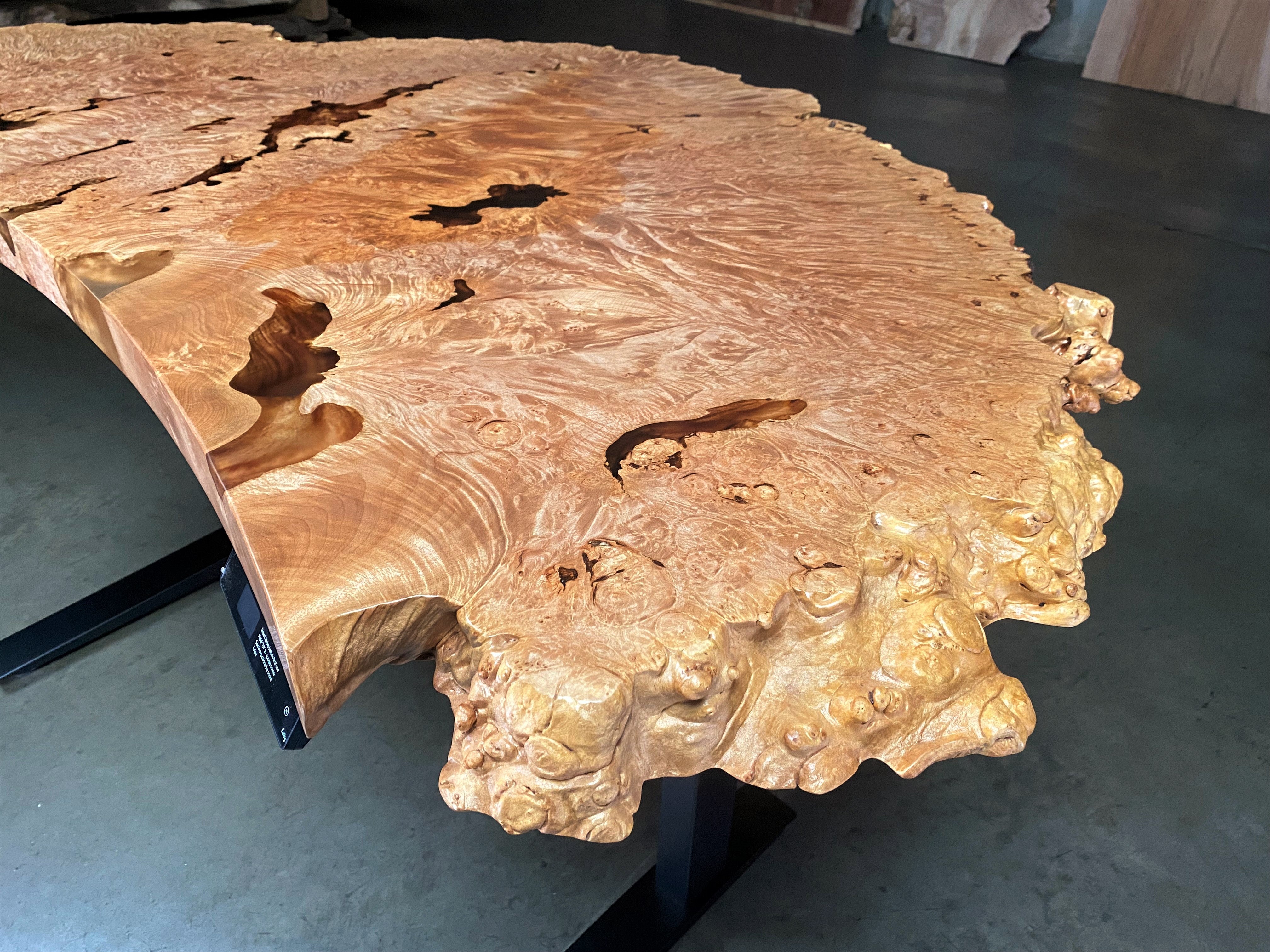 - Description - Natural burl edges with cut curved front edge. Highly figured burl with clear fills.