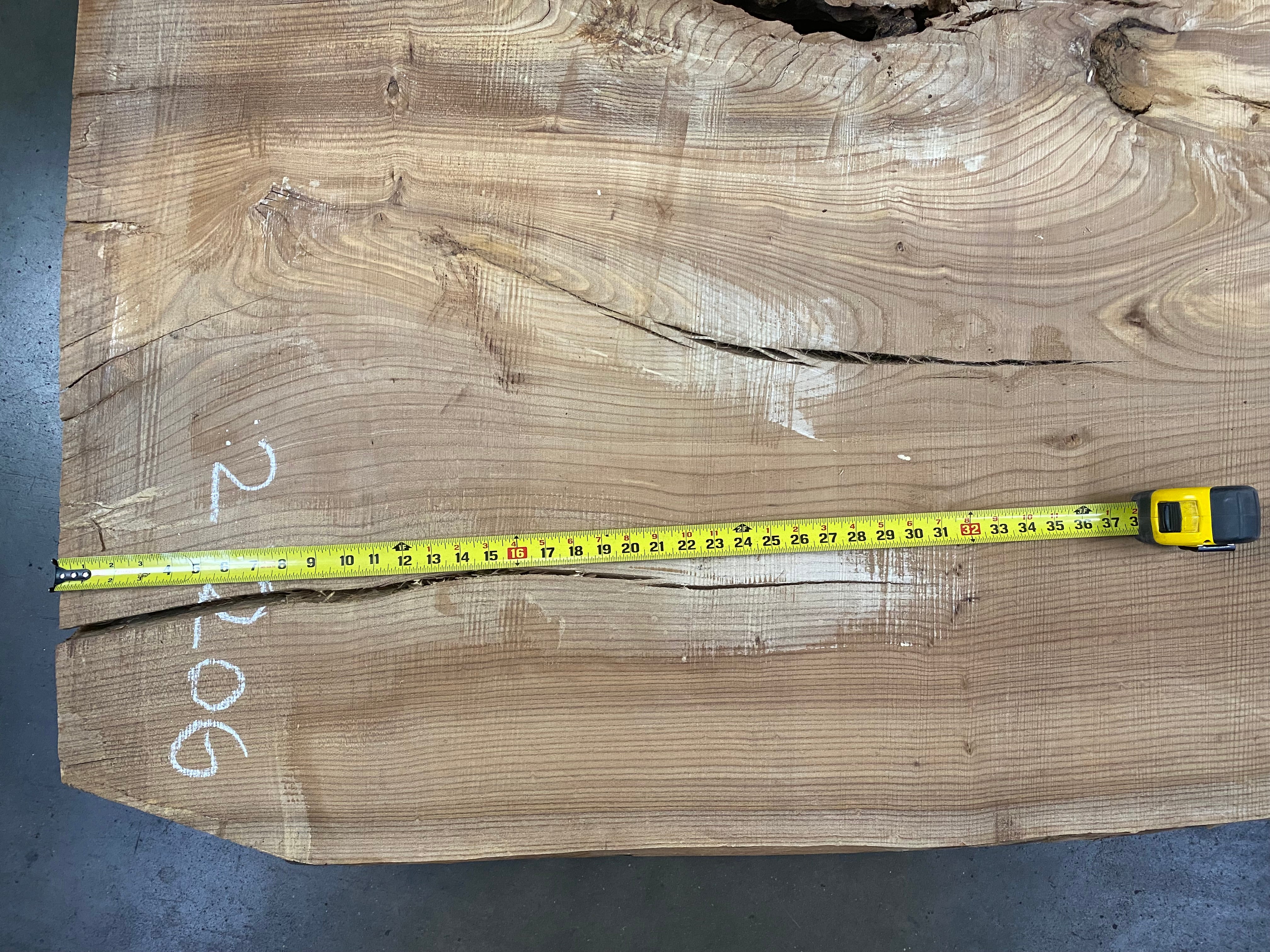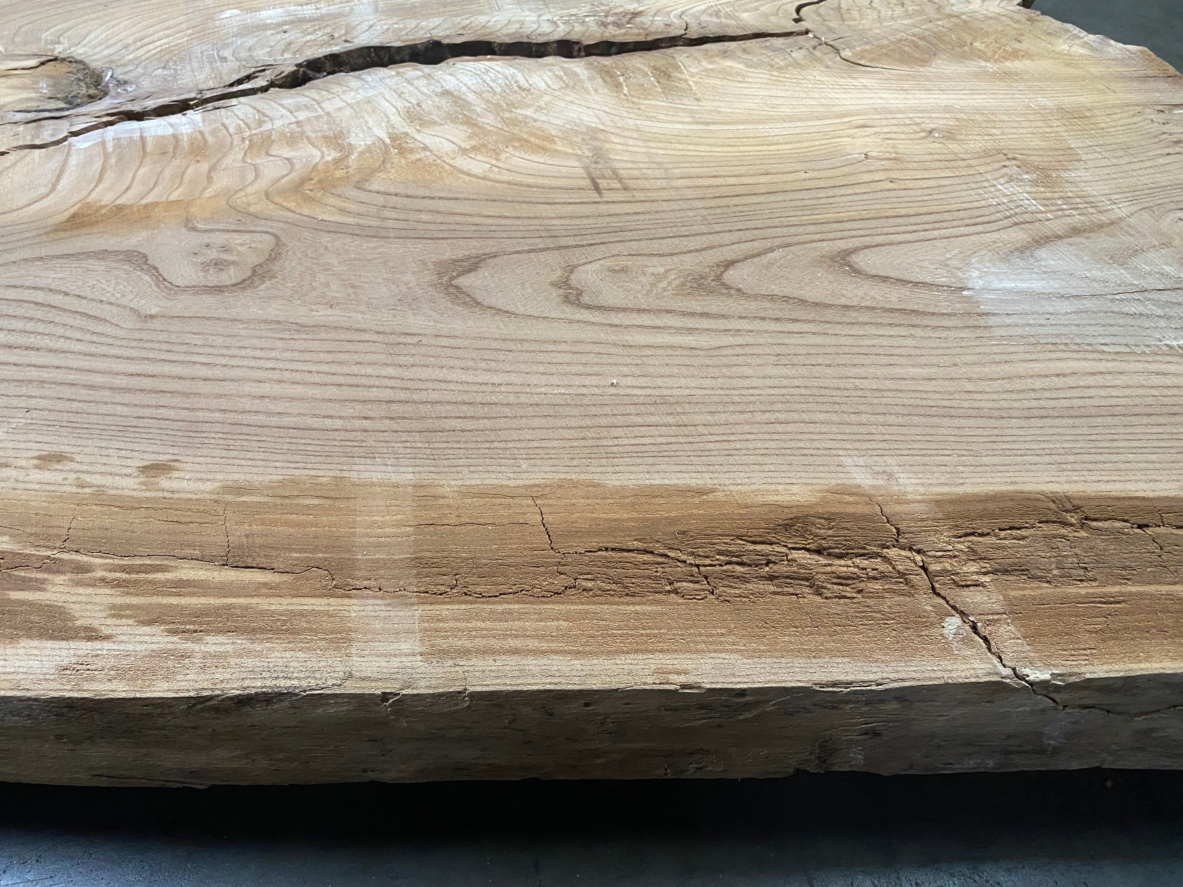 - Rough sawn, imbedded limb, edge damage, 30" end split, large surface voids, punky along one side