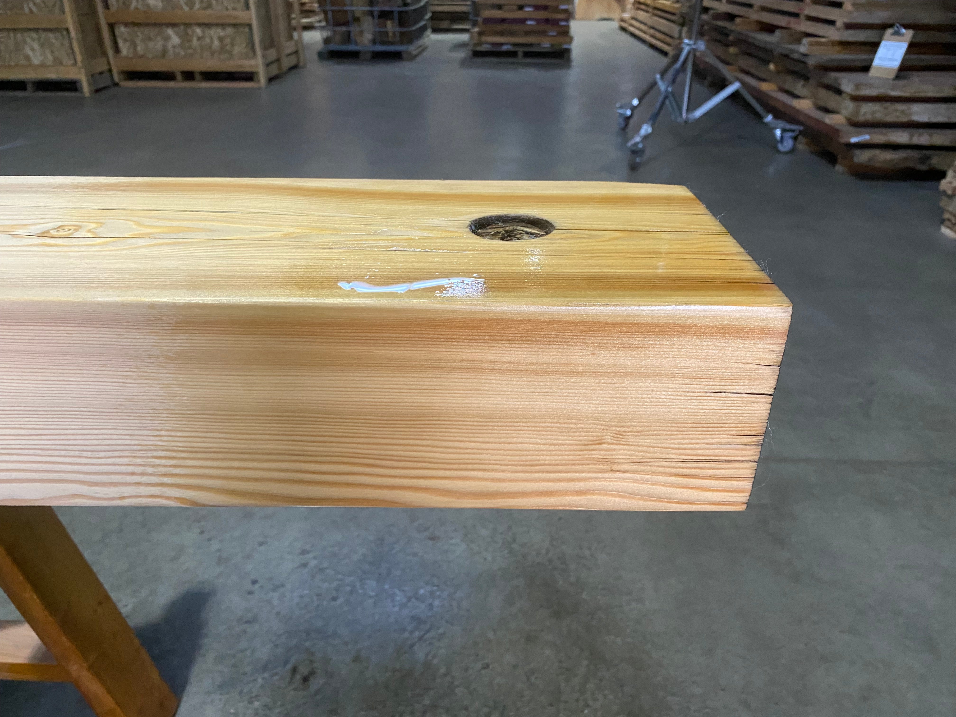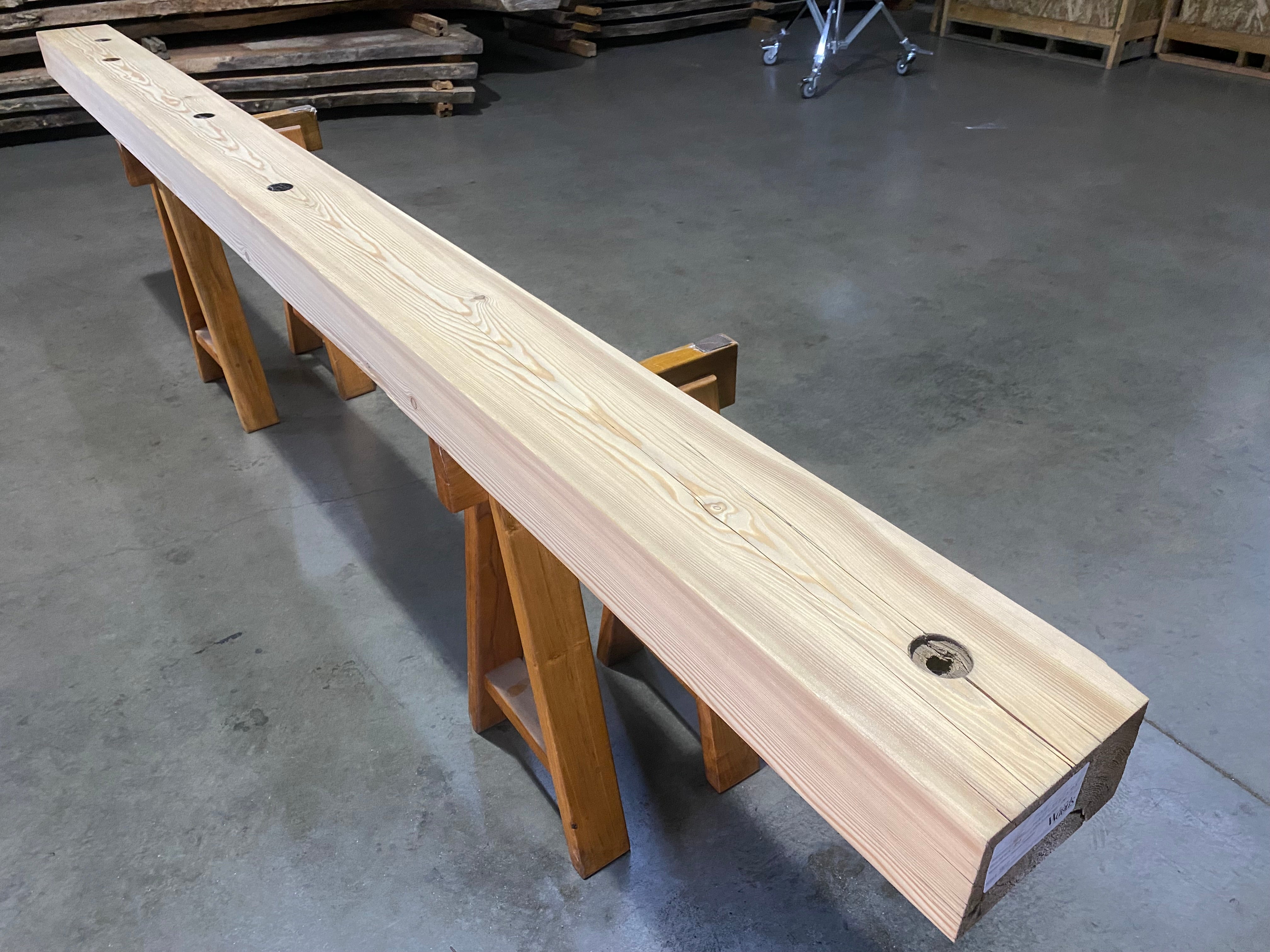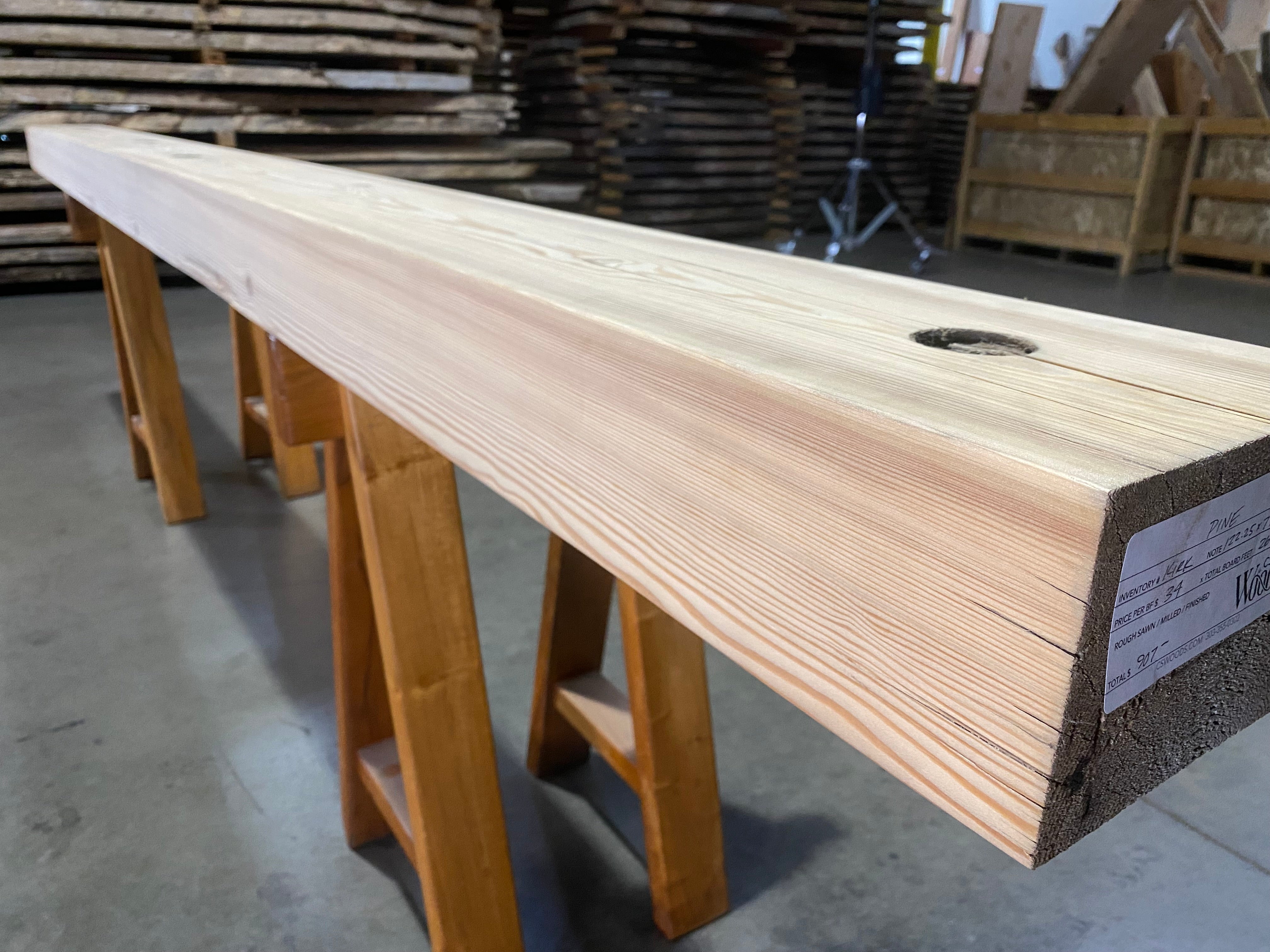- Description: Reclaimed pine beam with weathered holes. Jointed and planed, with ends left rough so it can be cut to length.