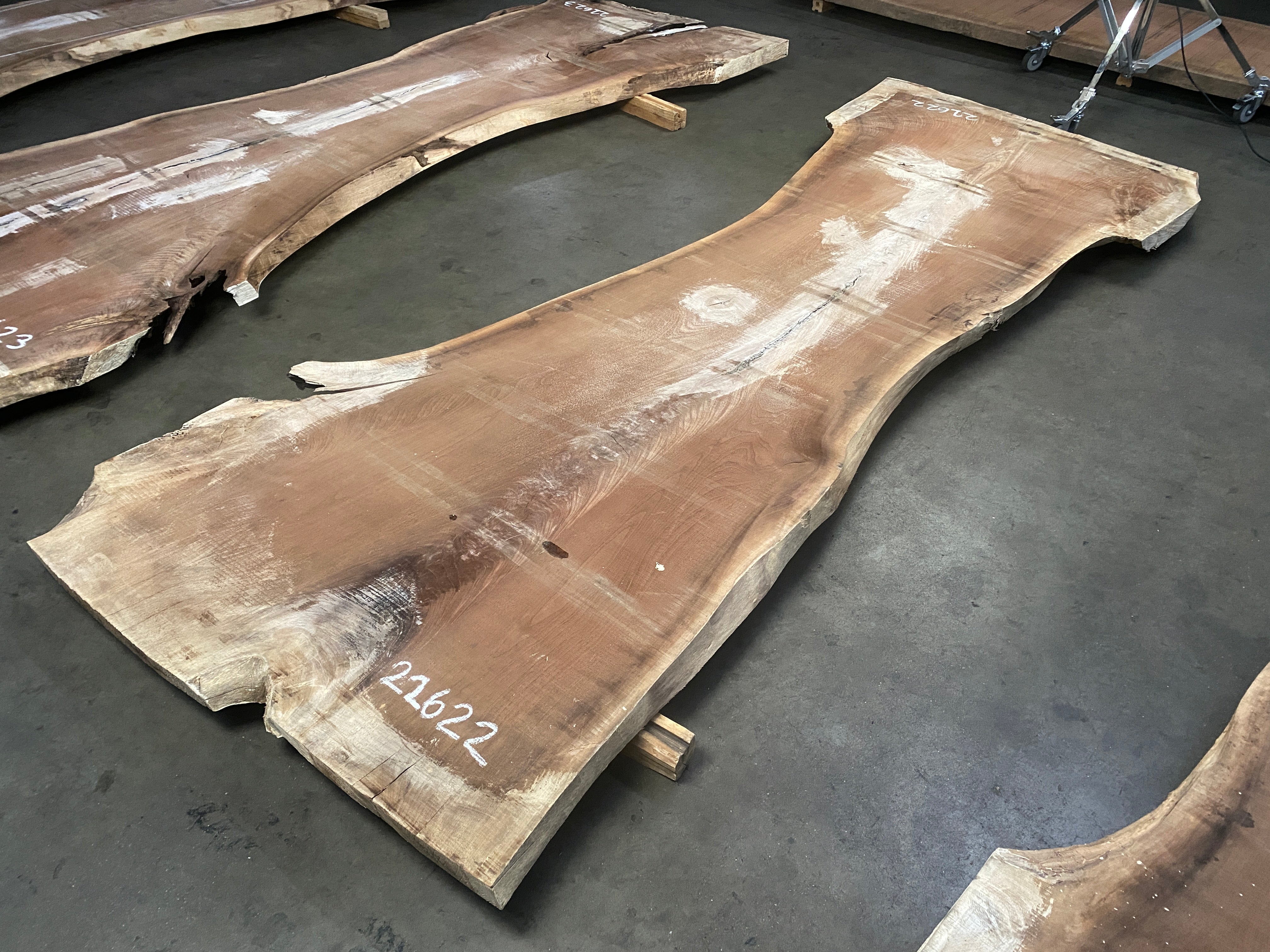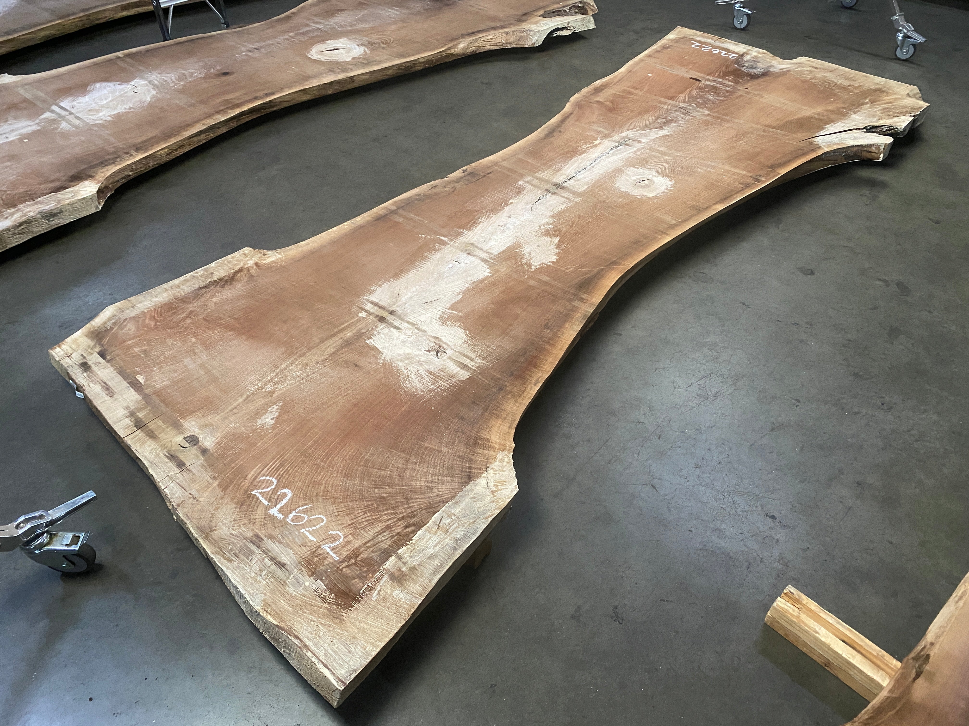 ● Rough sawn, slight twist, knots, end split, bark inclusion, minor edge damage, crotch figure