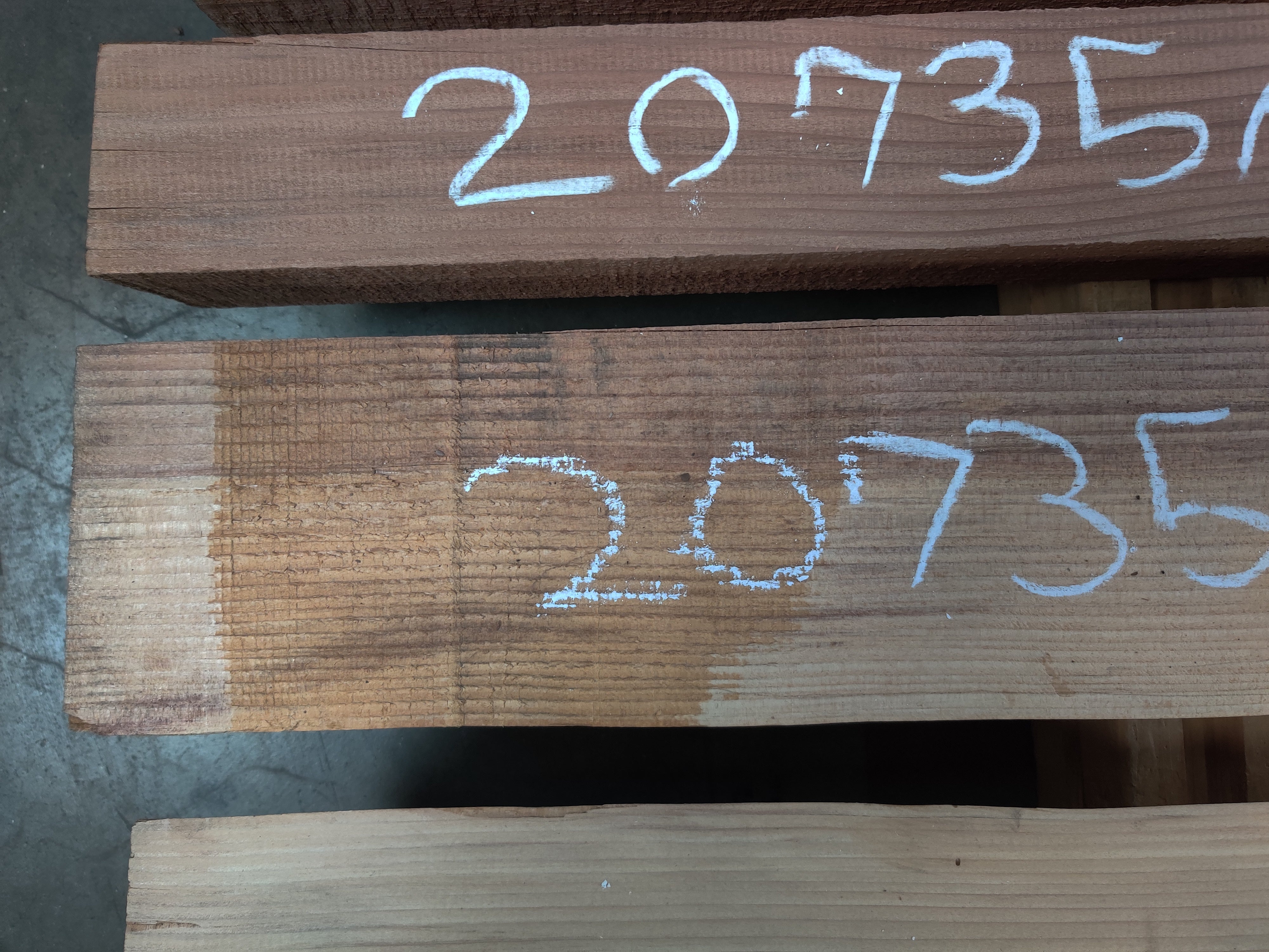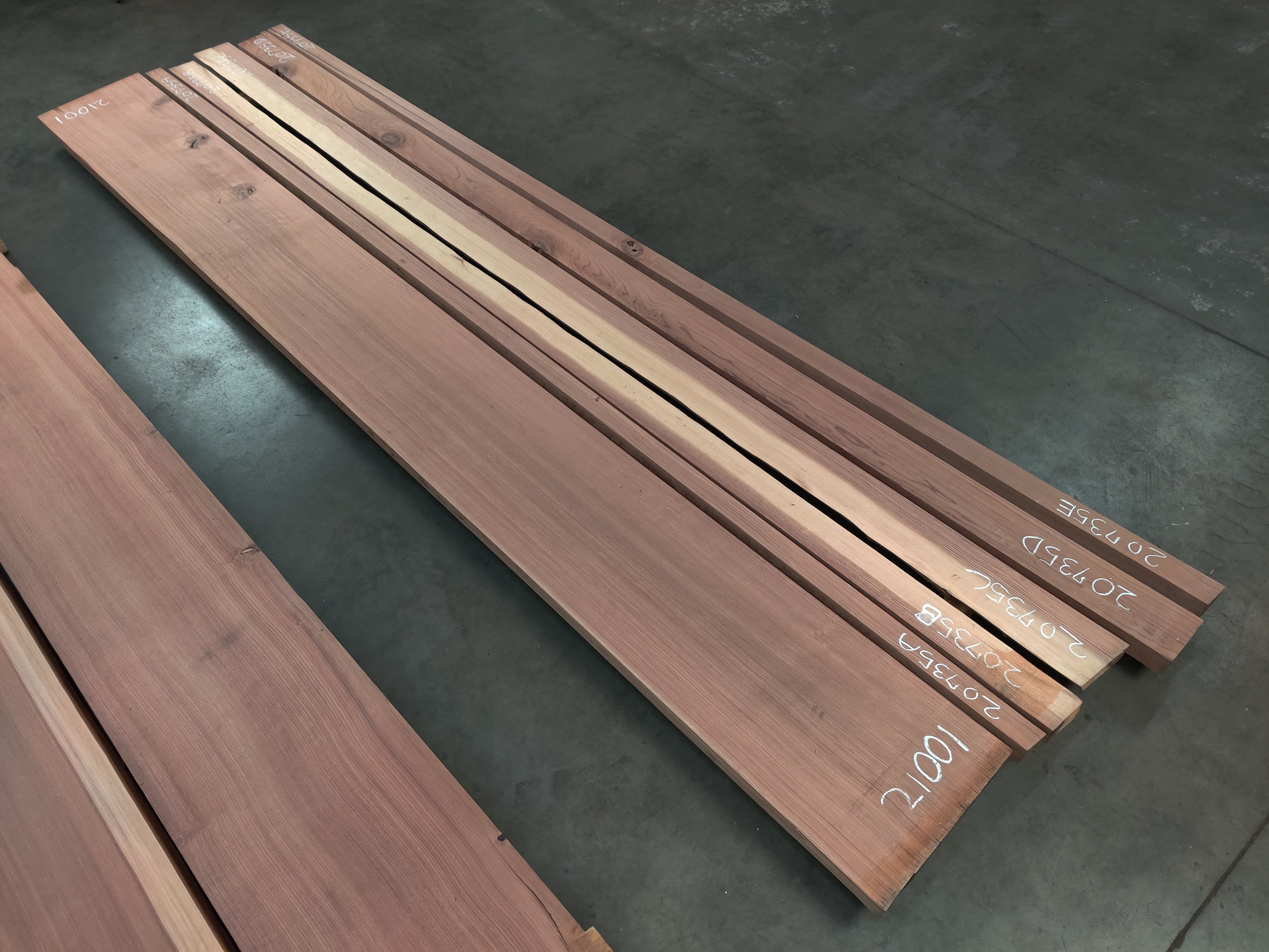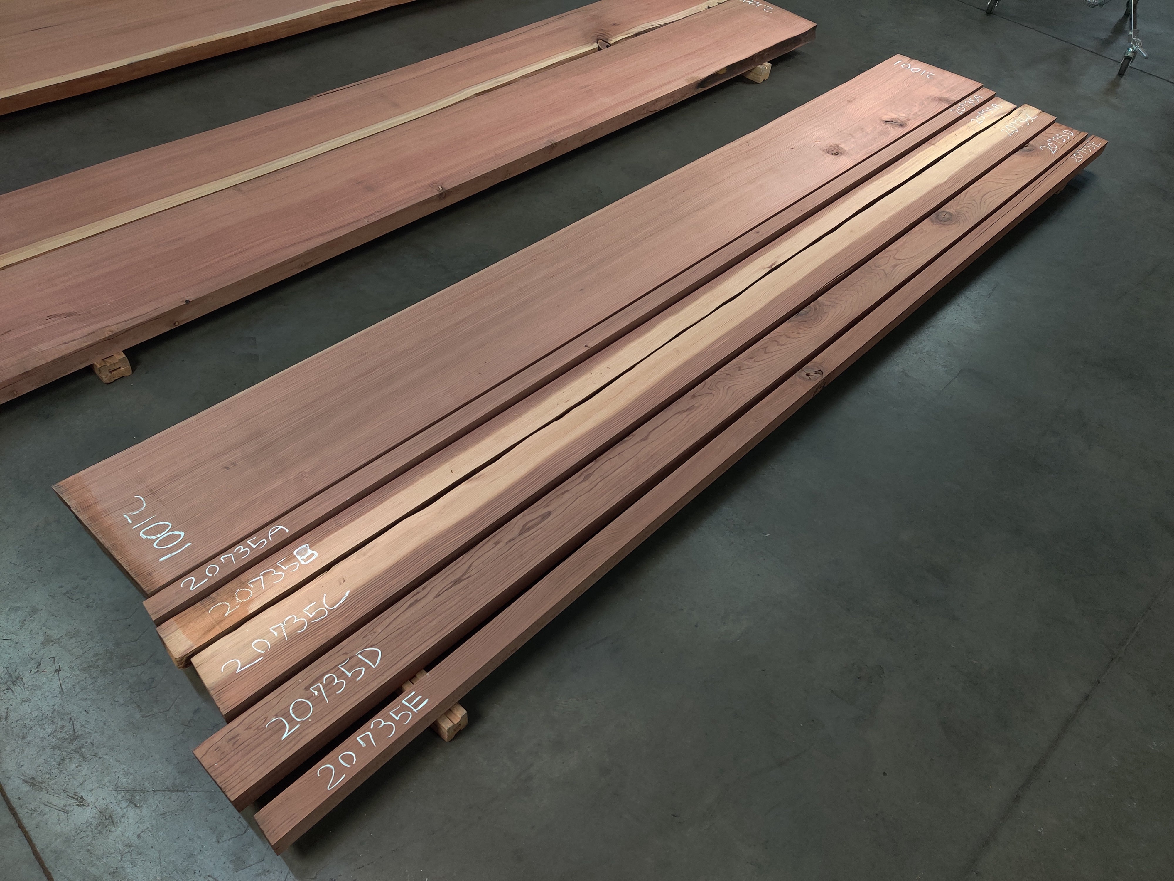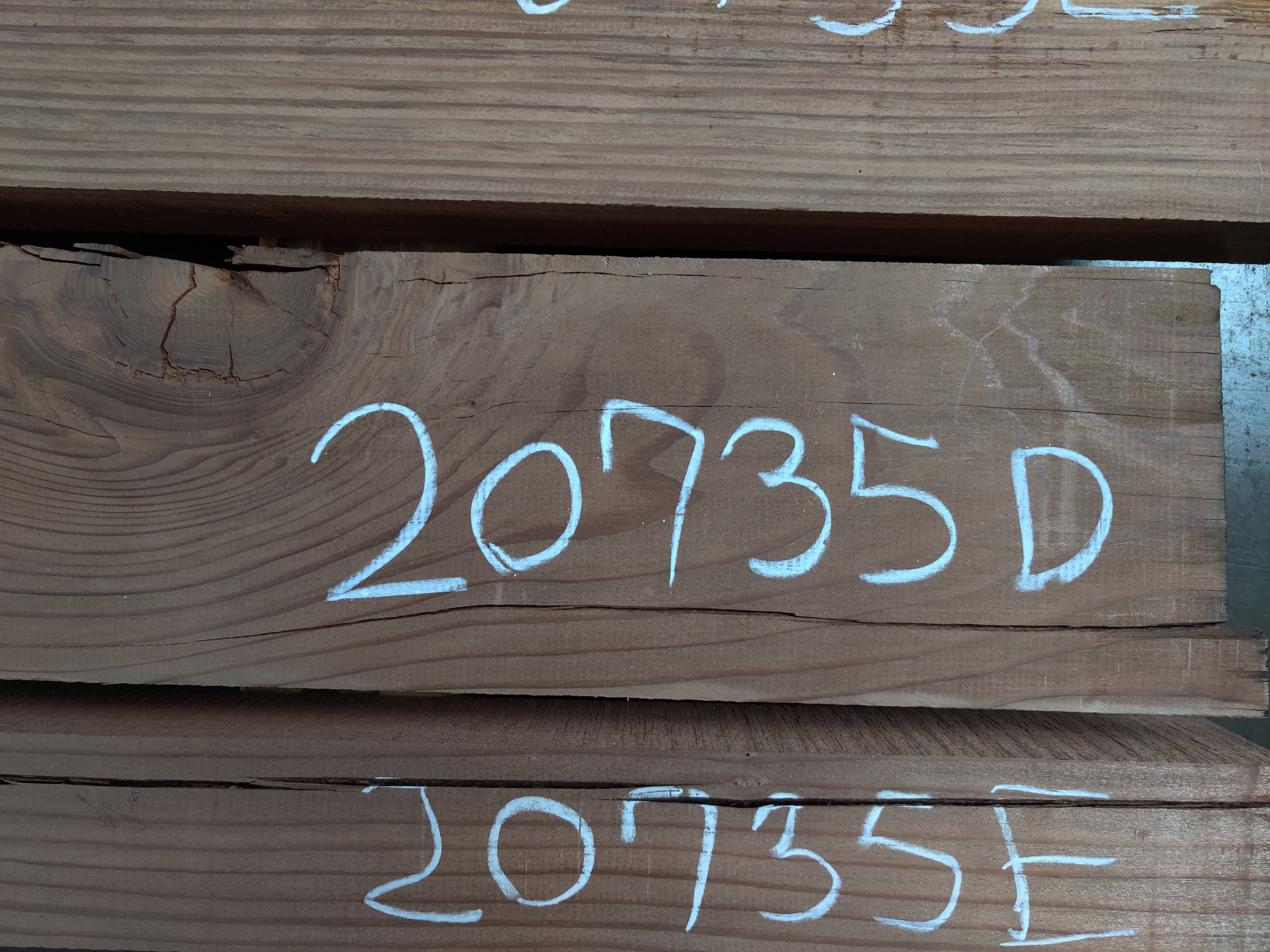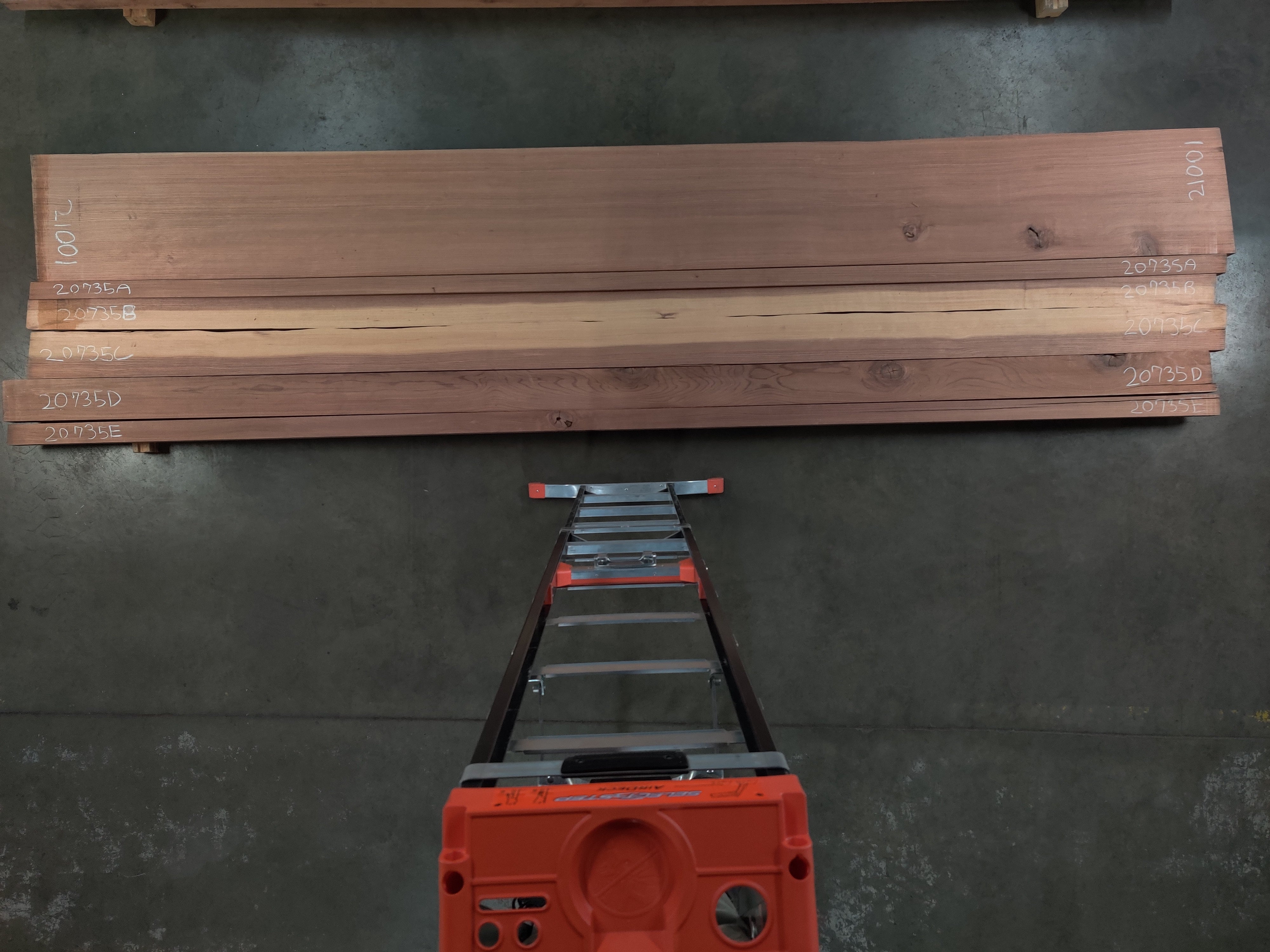 D. 173" x 6" x 2 5/8" - no live edge, end checks, knots (19BF) - E. 173.75" x 3" x 2 5/8" - no live edge, end check, knots (9.5BF)