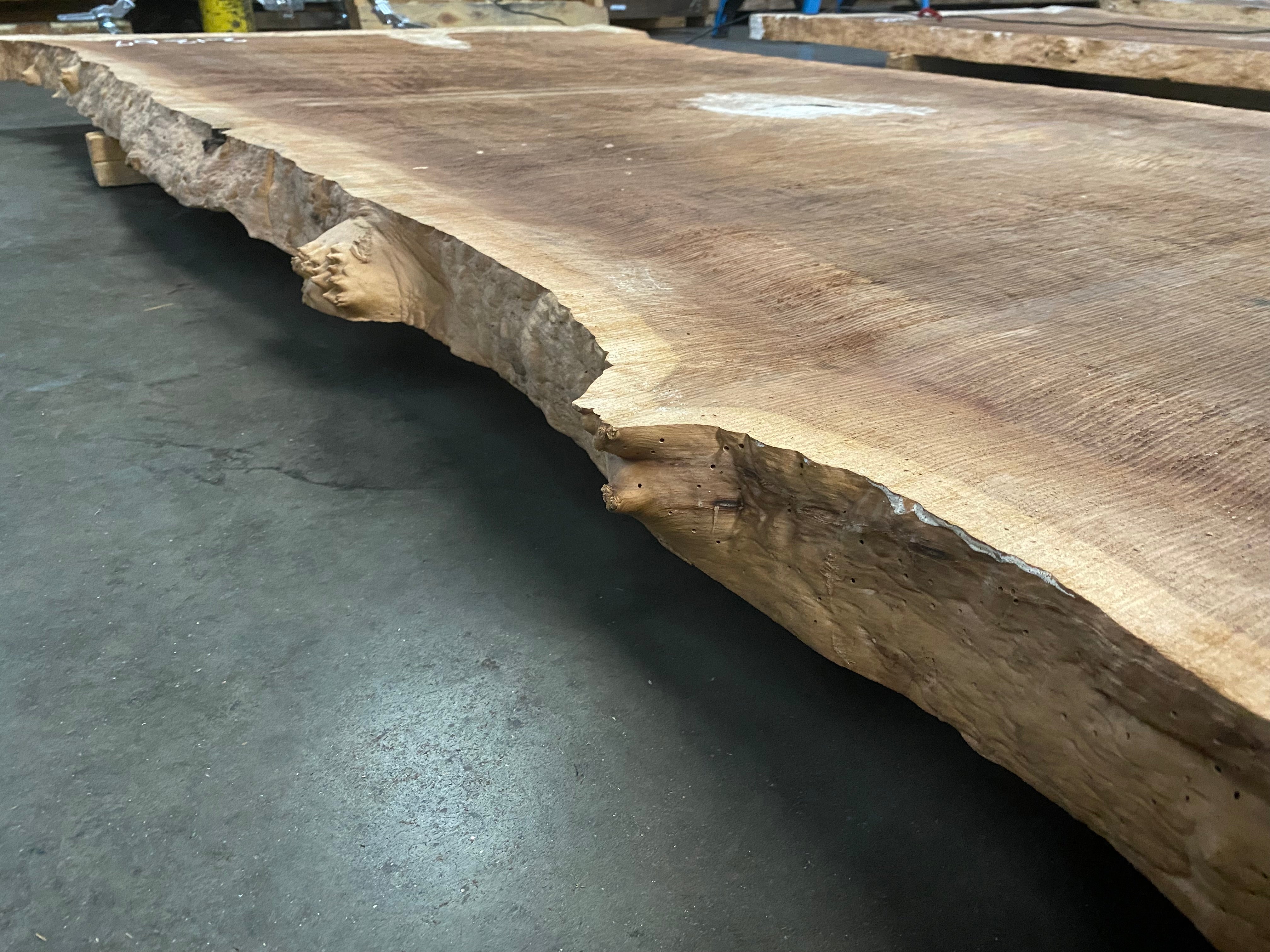 - 144" from crotch, 14" split on butt end, knots, surface voids, 77" split 8" in from live edge, almost 3 live edge, limb trim