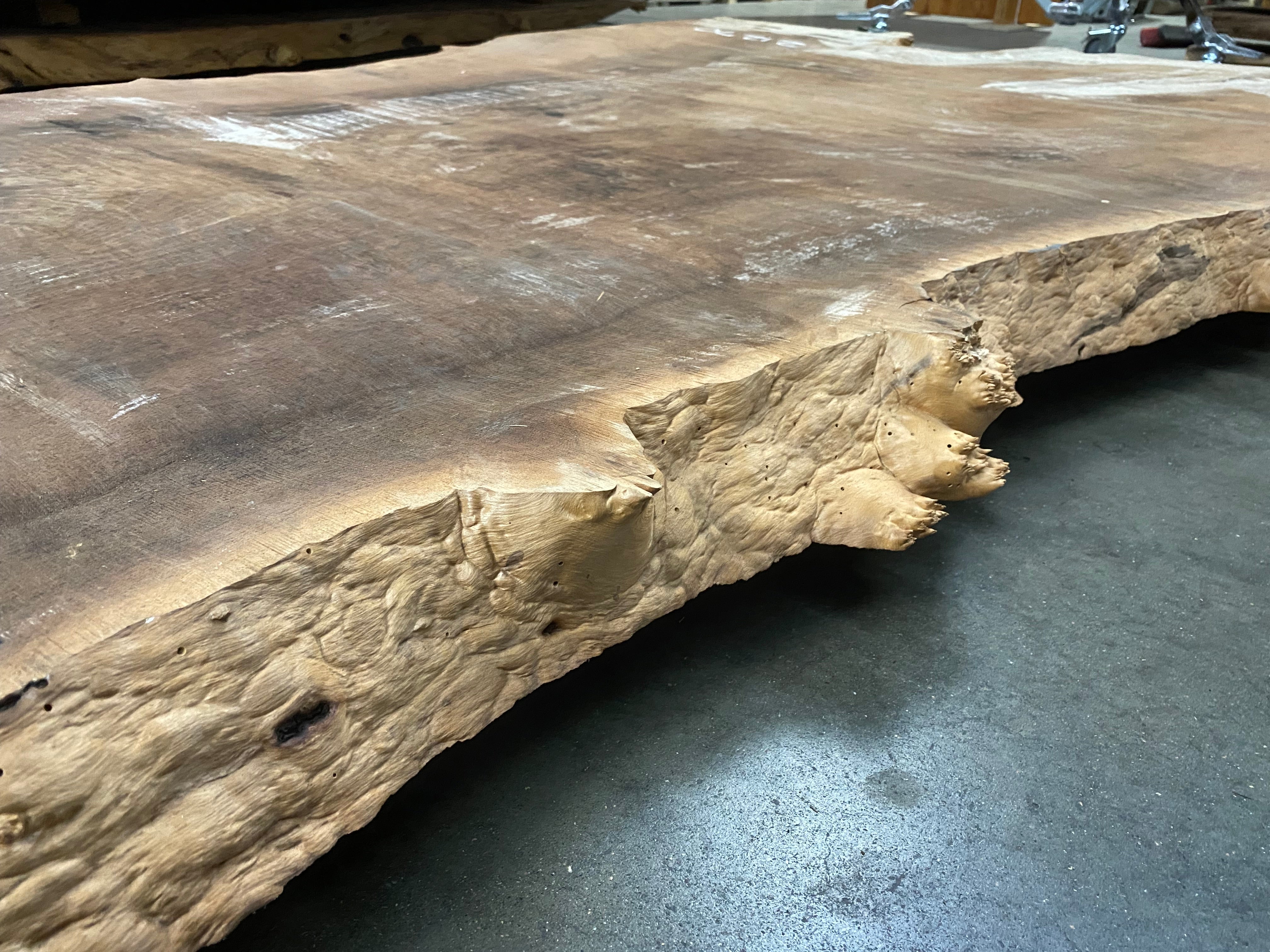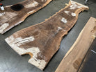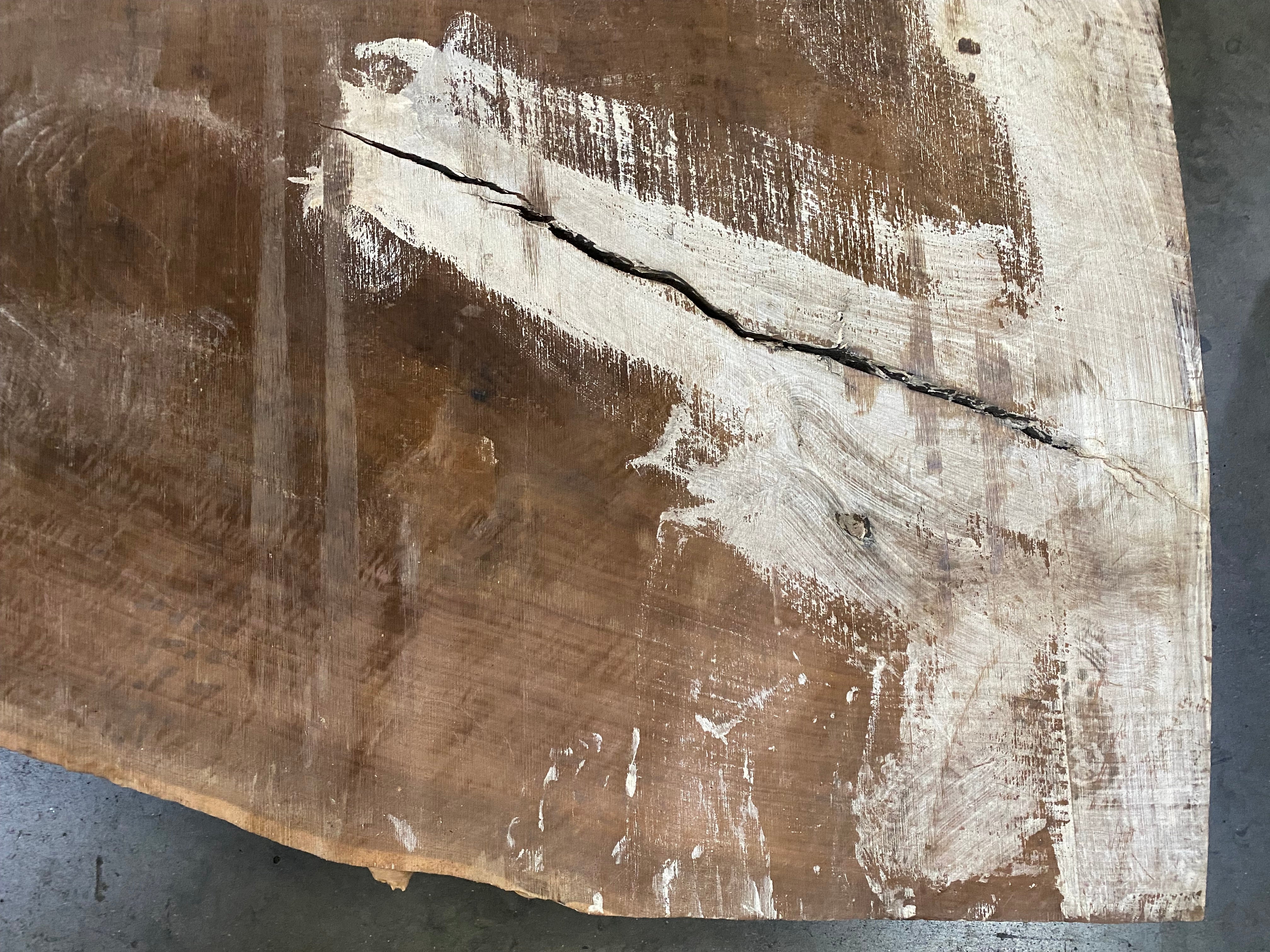 - 148" Length from crotch, cell collapse, visible honeycomb checks on end grain, surface voids and surface checks, large open knot in center of slab, limbs trimmed