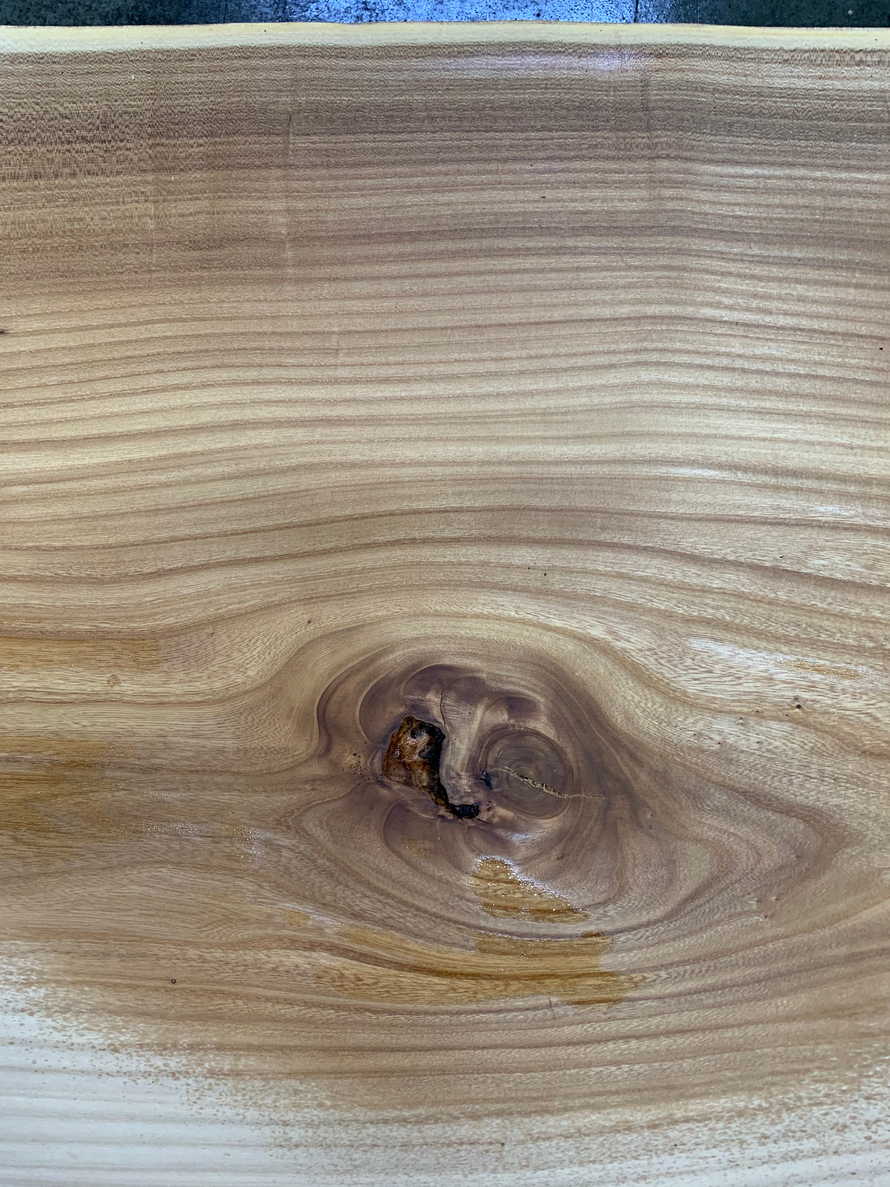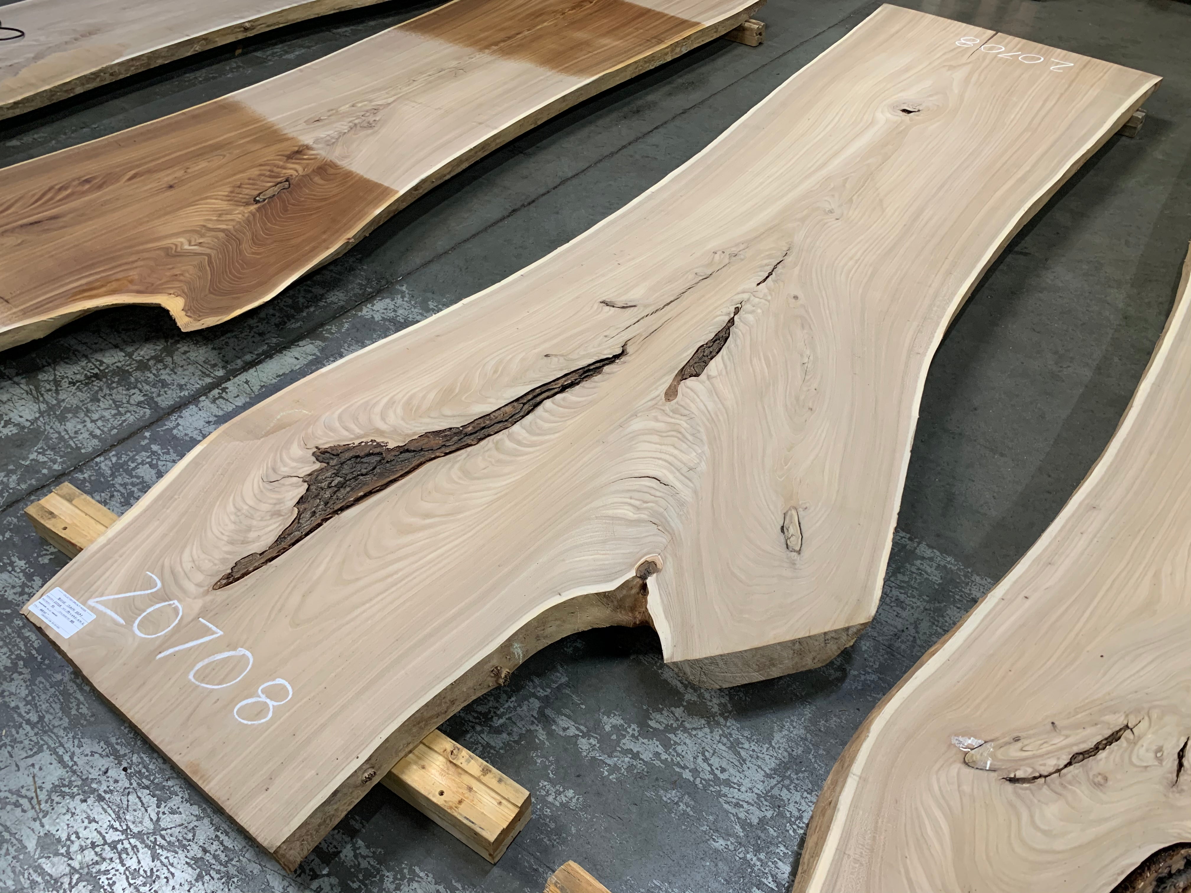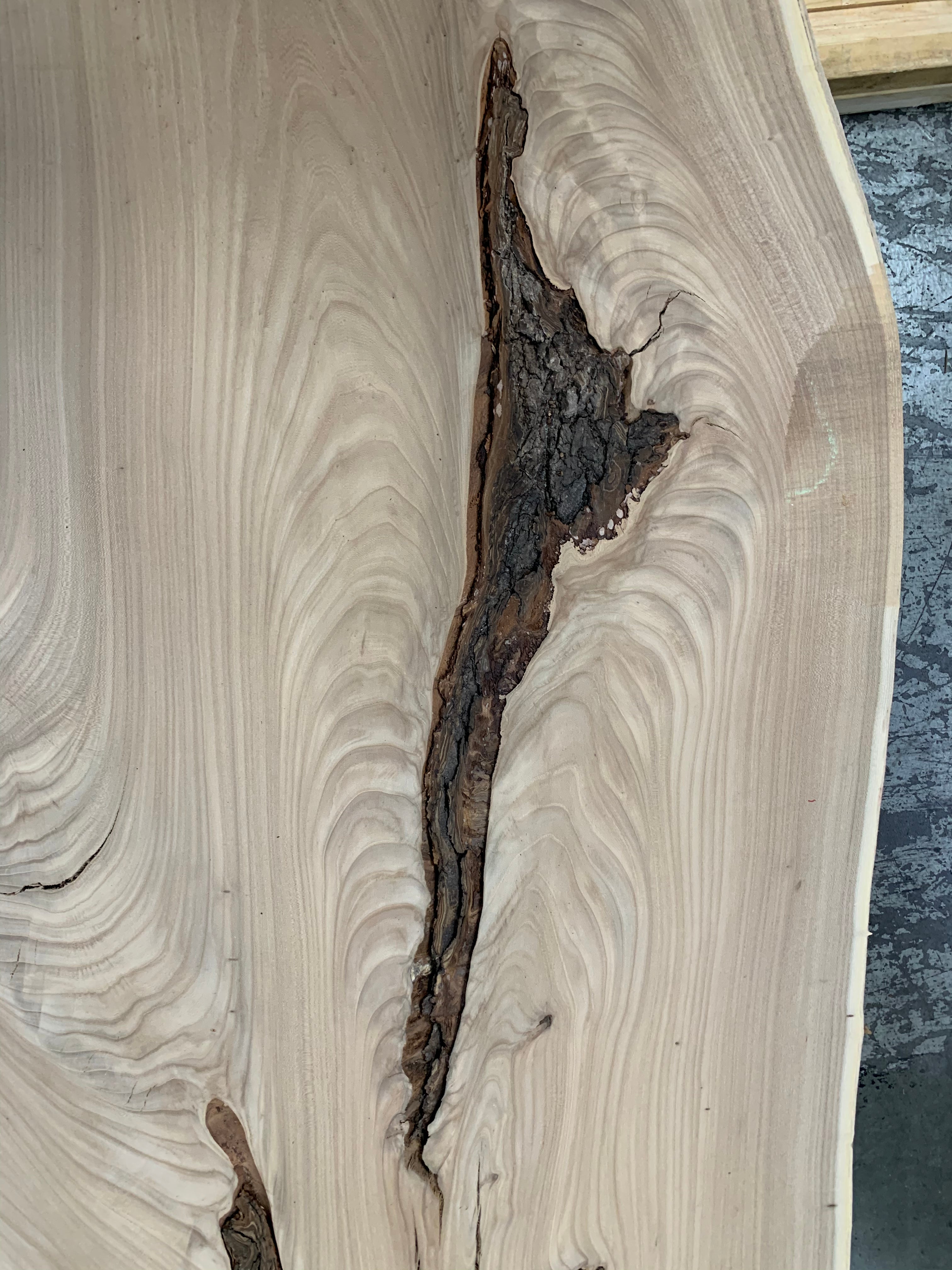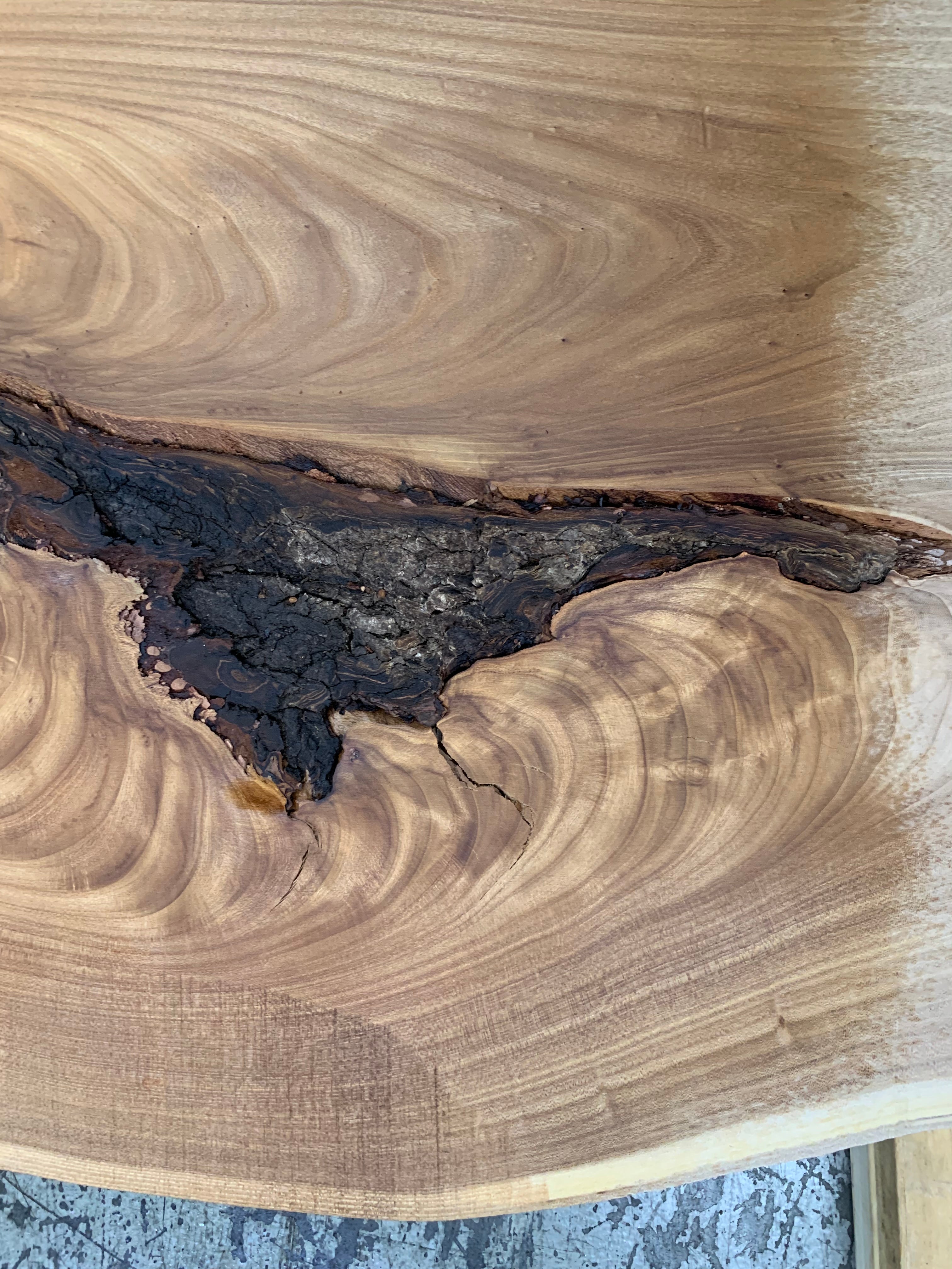 - Crotch figure, bark inclusion, some surface checking, some small tight knots