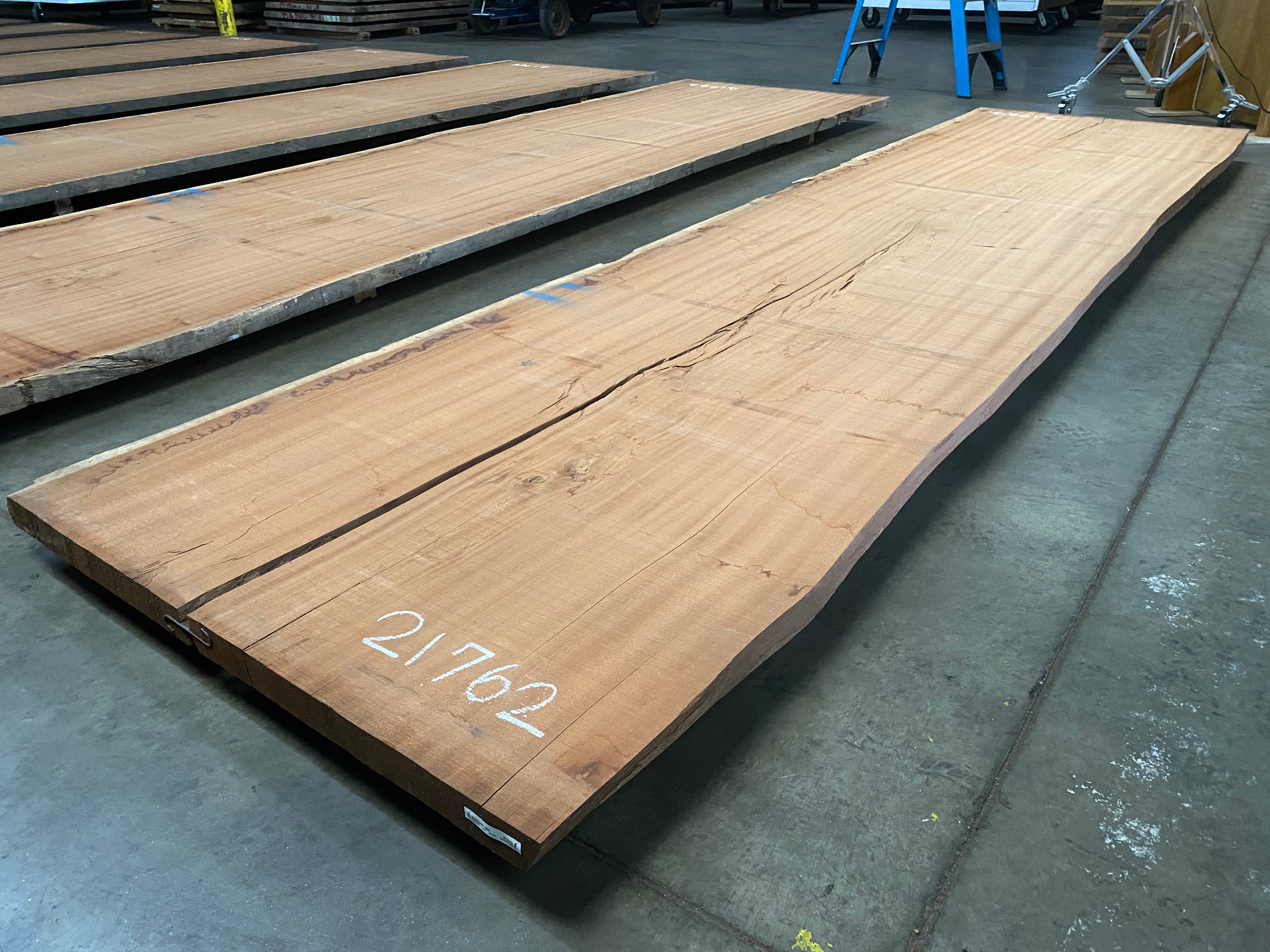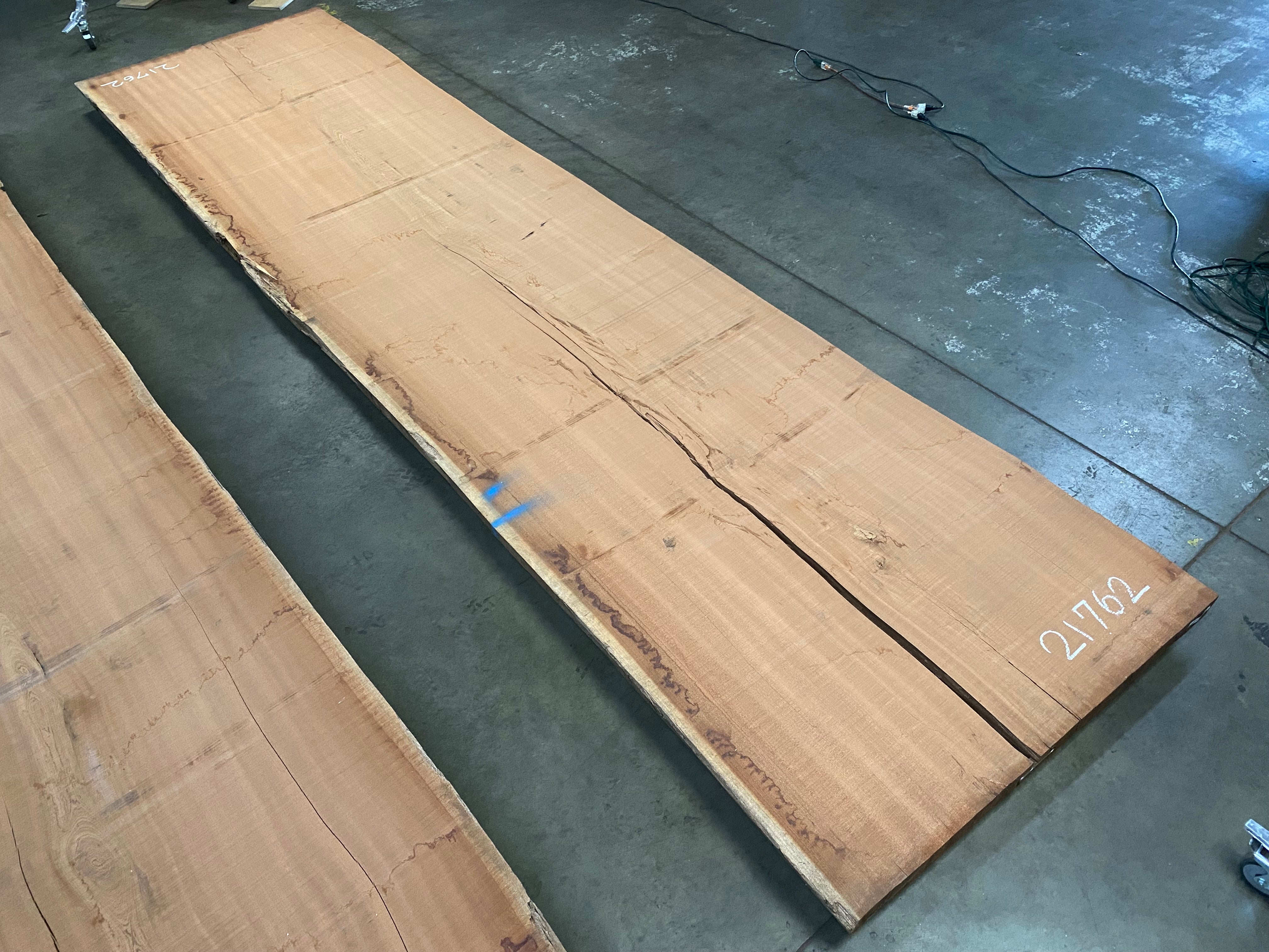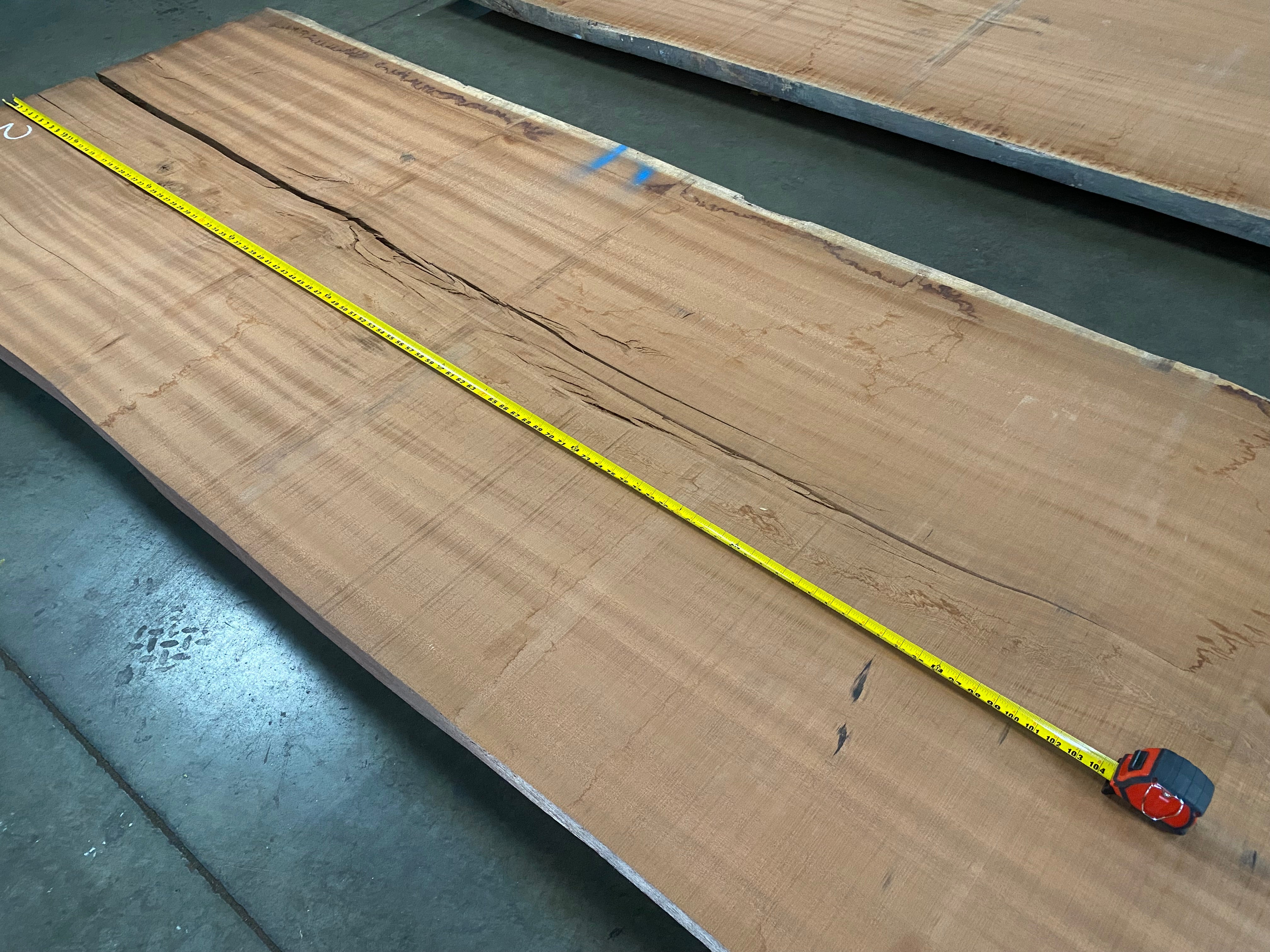 - Rough sawn, single live edge, surface checks,104" & 36" end splits, edge damage, ribbon figure