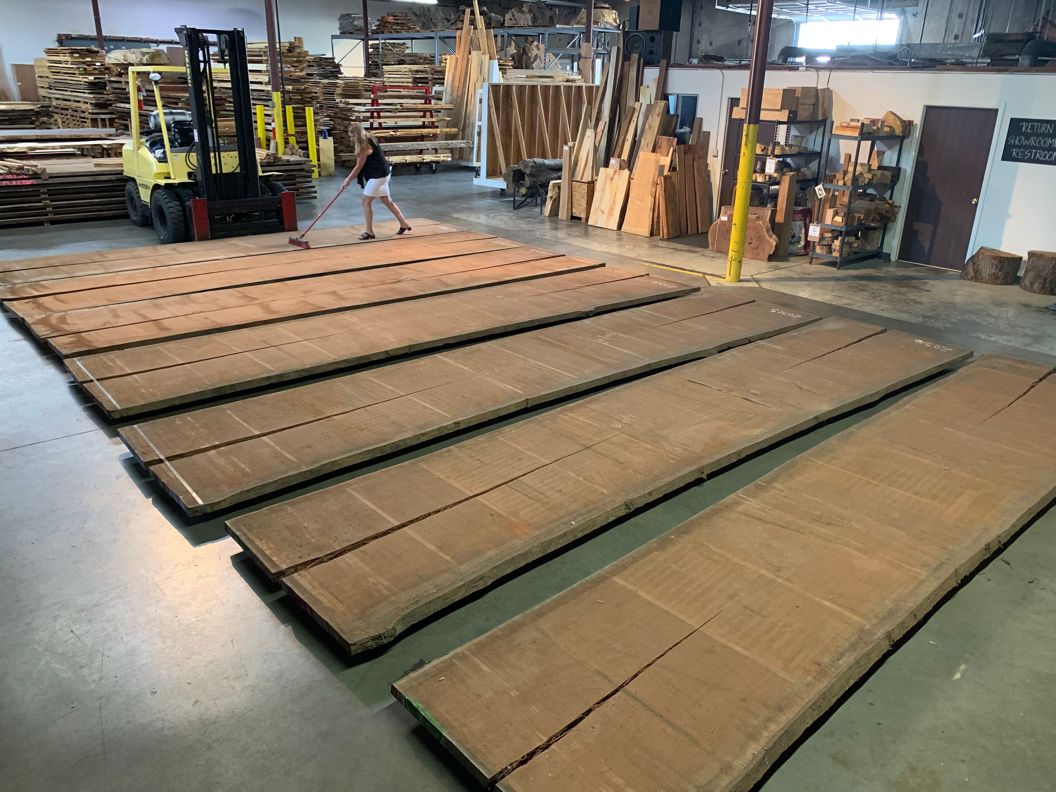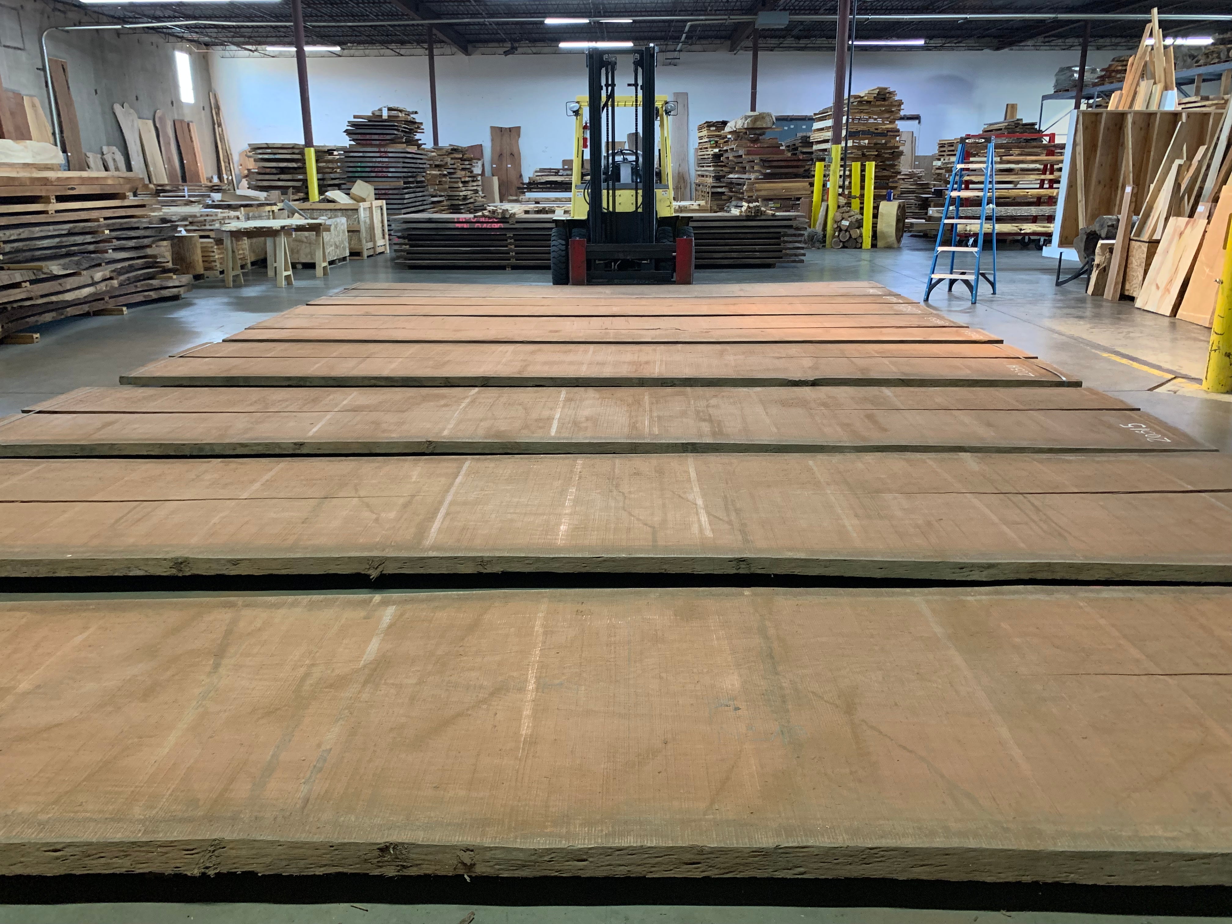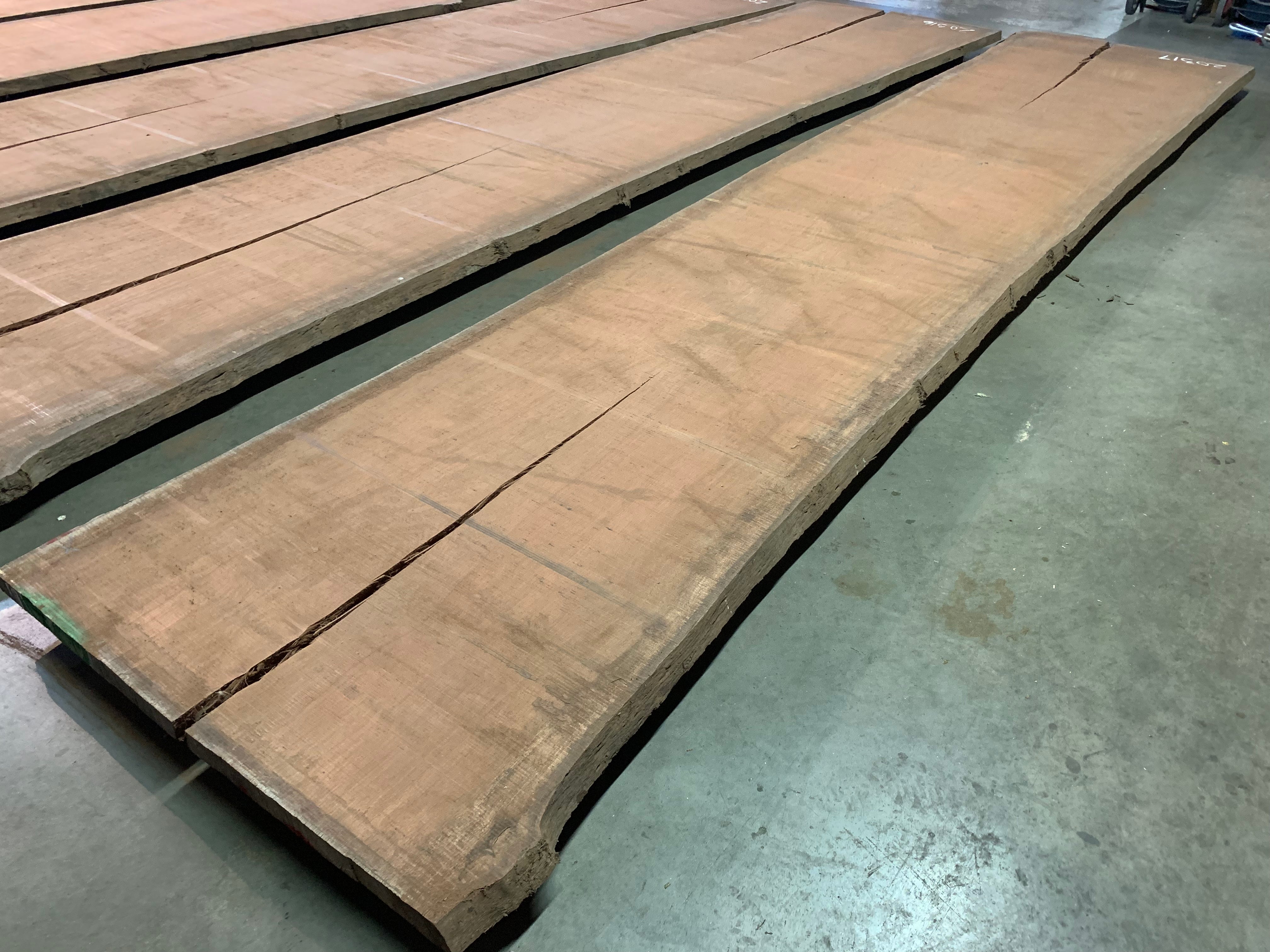 This Bubinga slab is 244" long x 44.5" - 51.5" wide x 2" thick. It has end checking of 72" on one end and 52" on the other. There is light figuring. It is 163 board feet. We are willing to custom cut to length for your project specifications. Kiln dry.