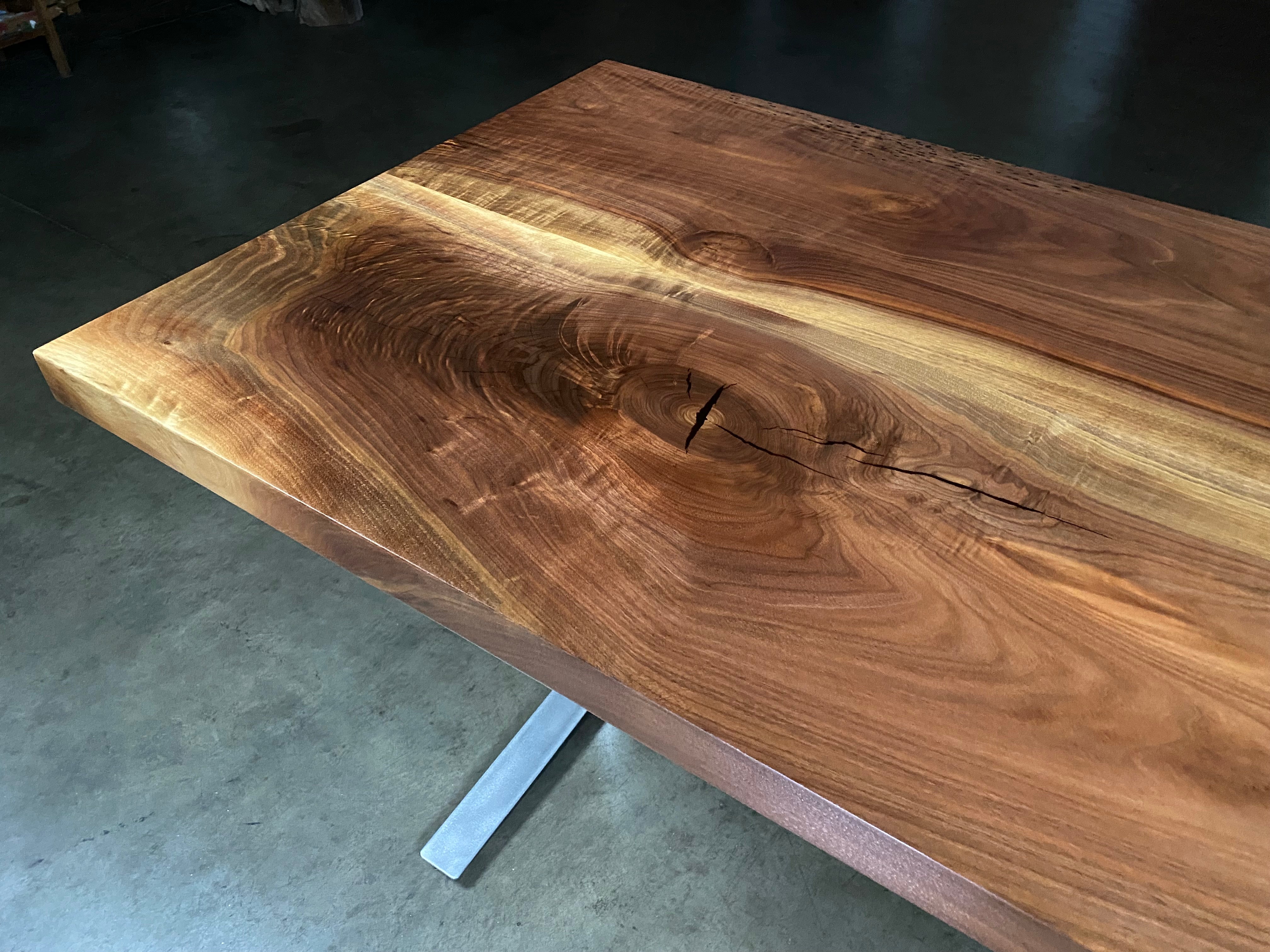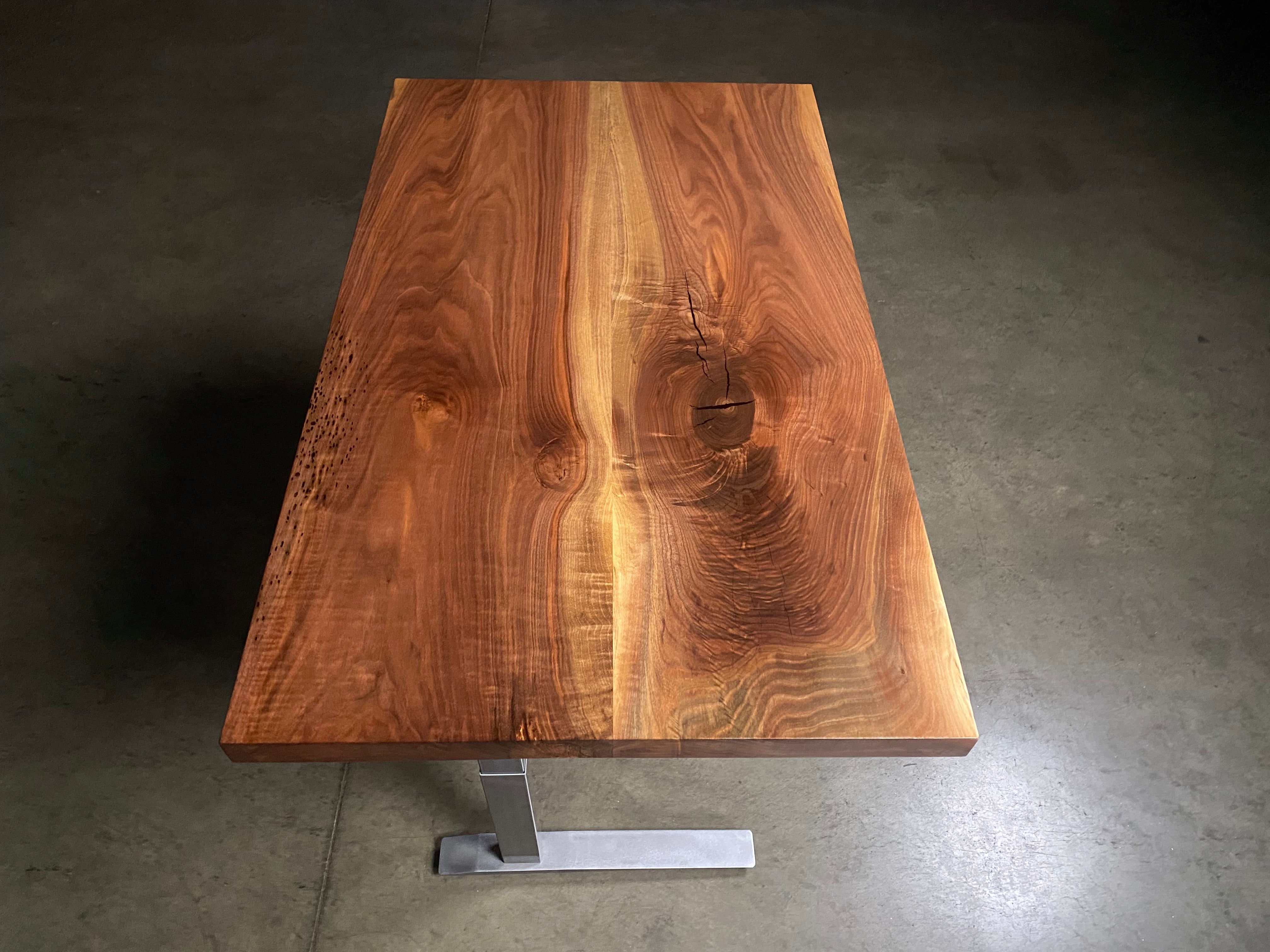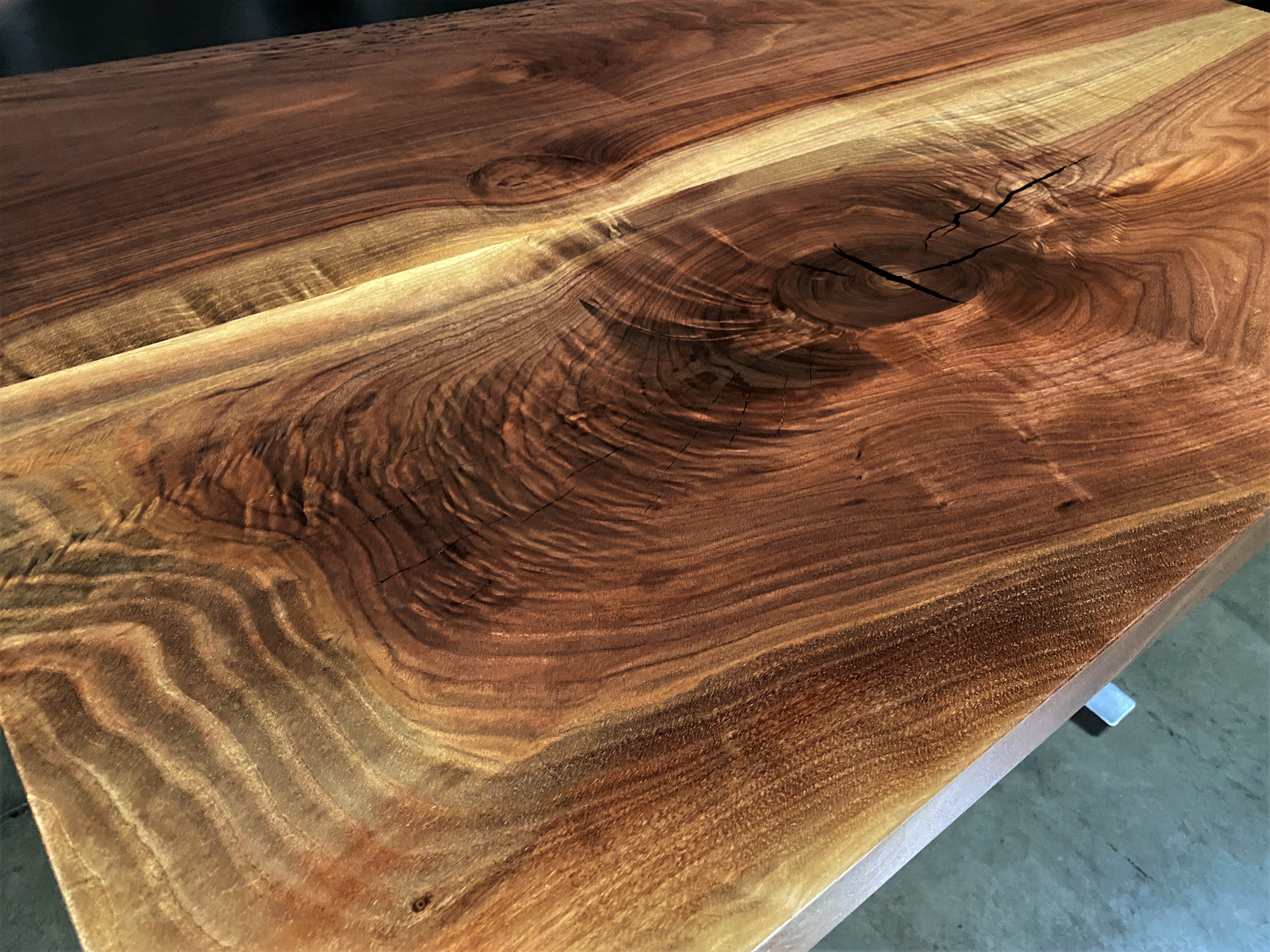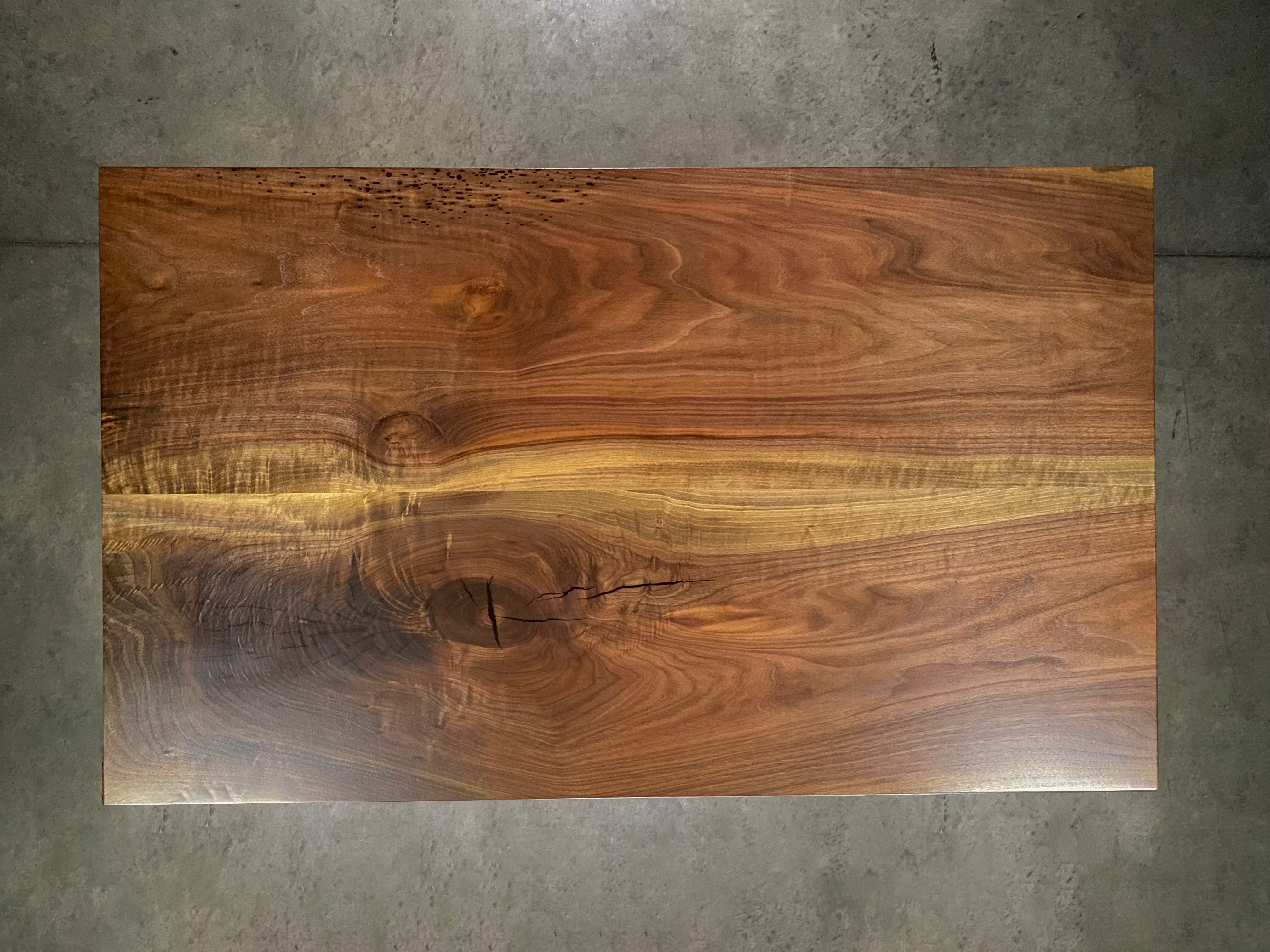 - Description: Slab top, straight lined edges (no live edge), figured, large limb knot.