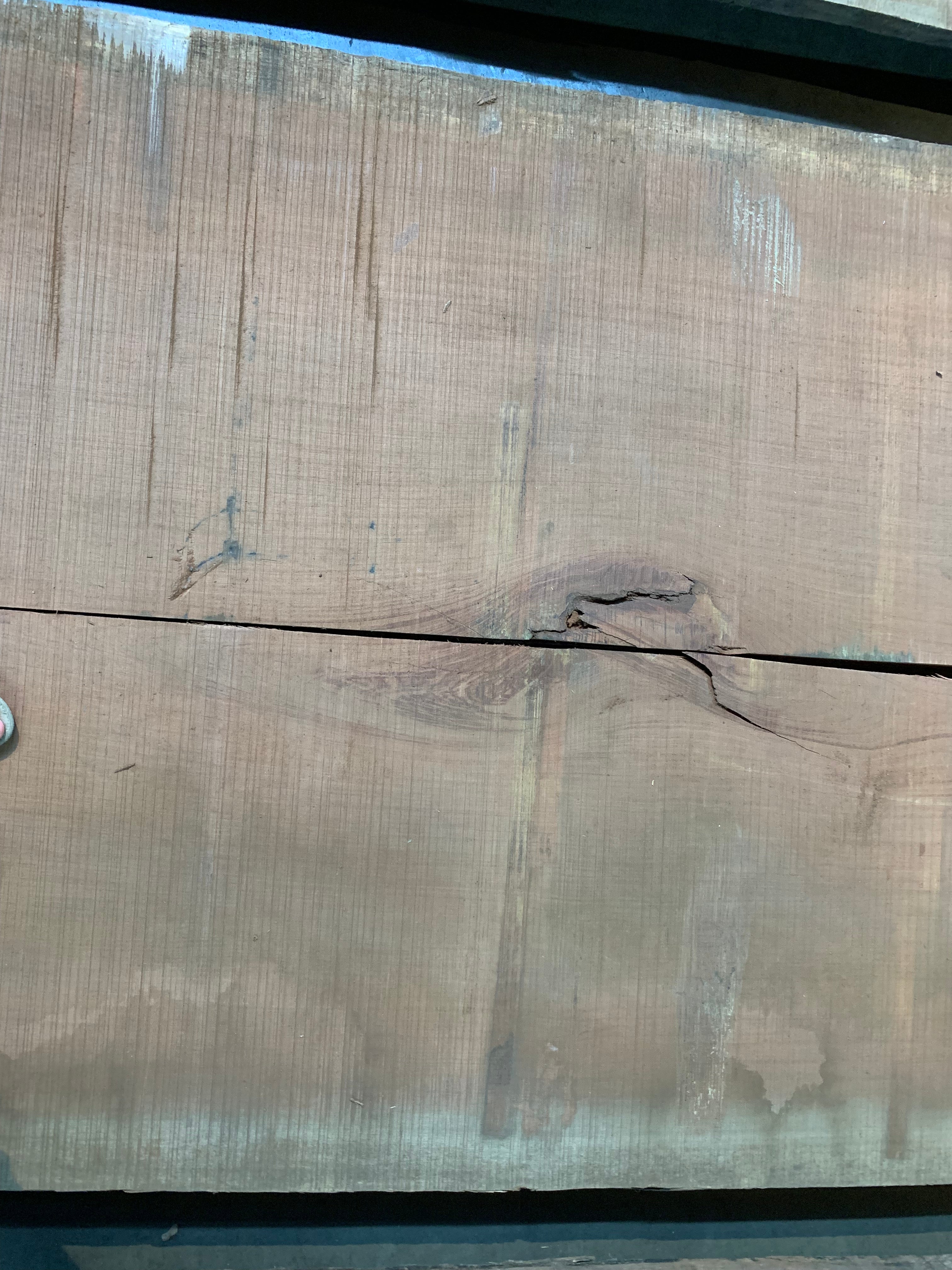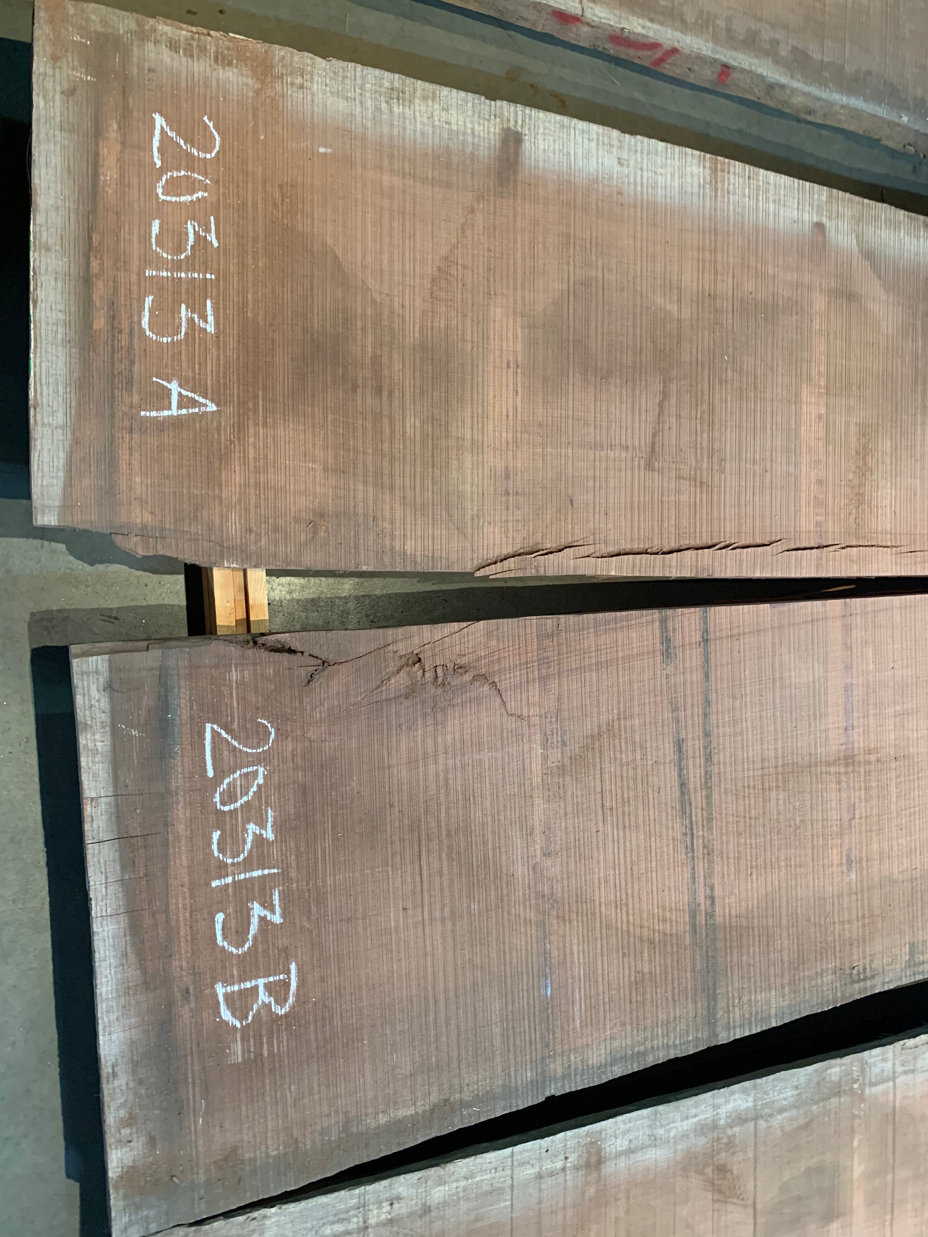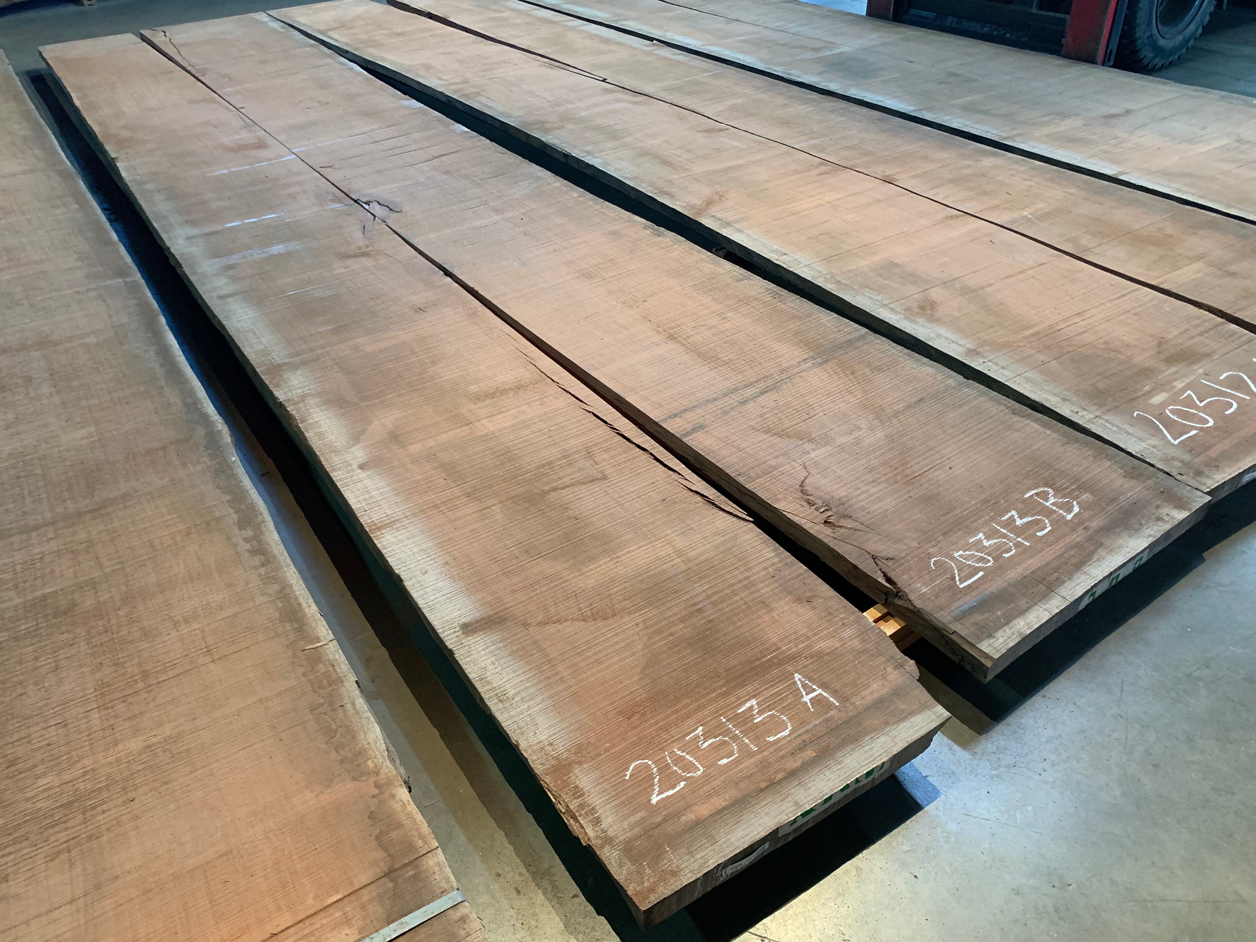 This Bubinga slab is in two pieces. Section A is 244" long x 20" - 24.5" wide x 2" 1/8 thick and is 74.5 board feet. Section B is 244" long x 26.75" - 29" wide x 2 1/8" thick and is 95 board feet. There is some flaking in the check (see photo). We will sell the pieces separately. We are willing to custom cut to length for your project specifications. Kiln dry.