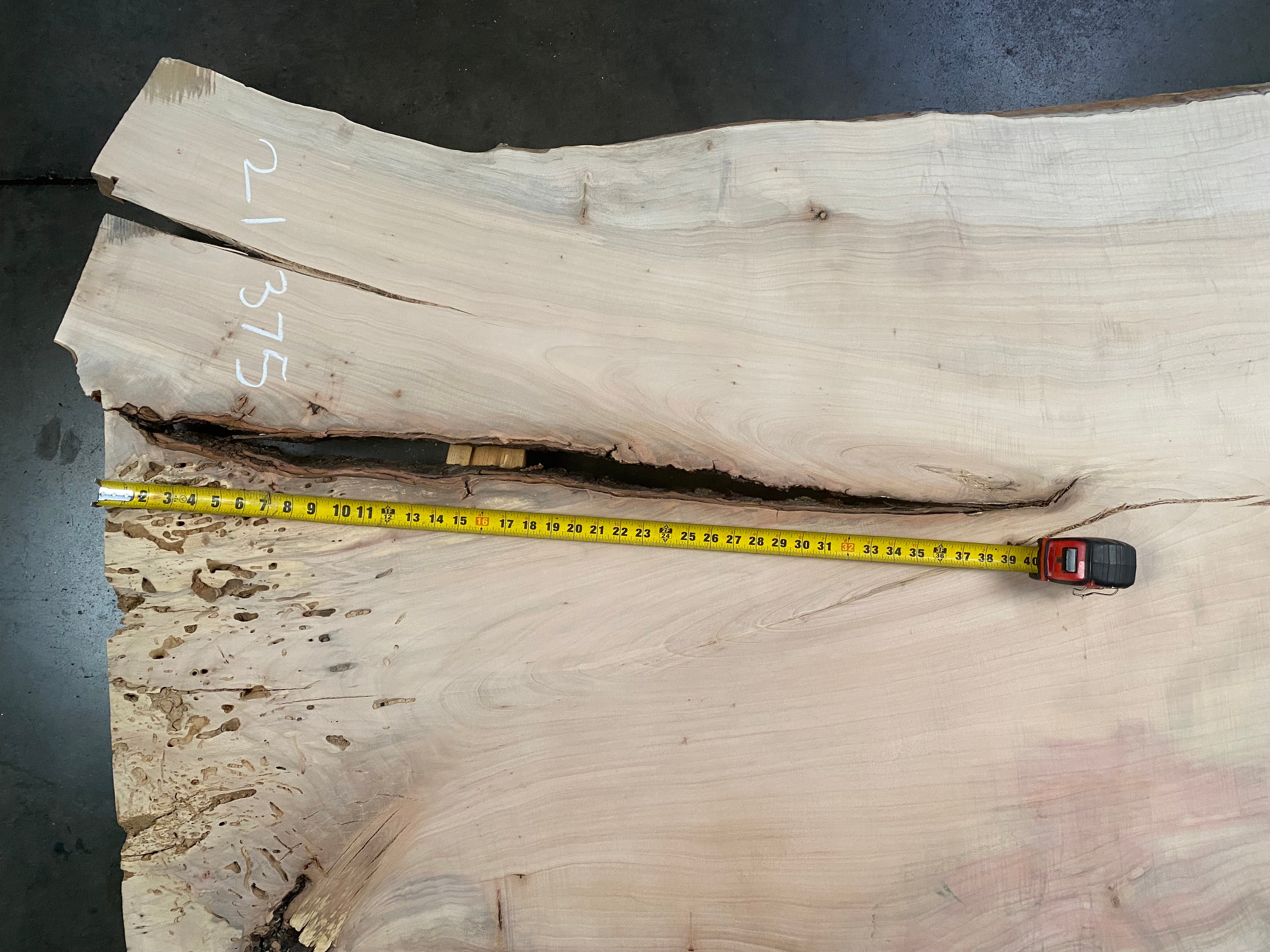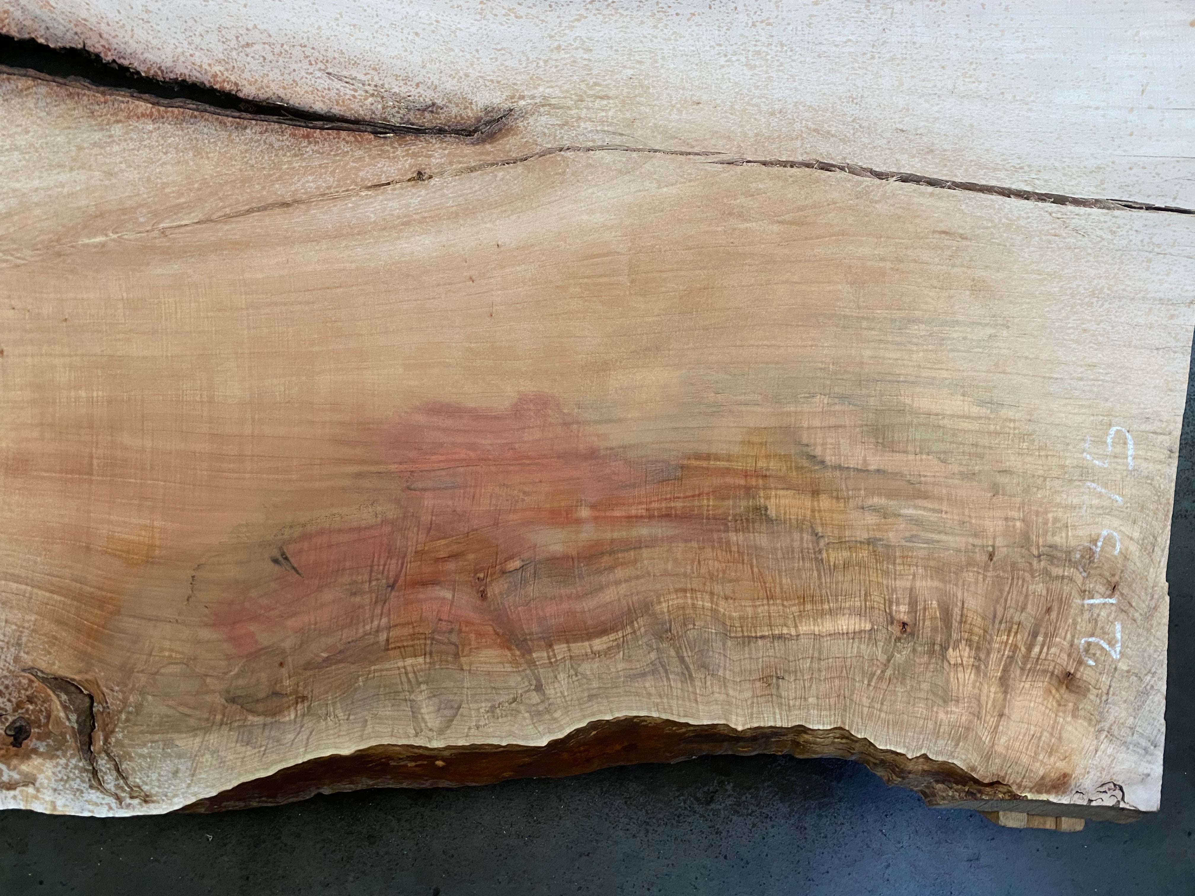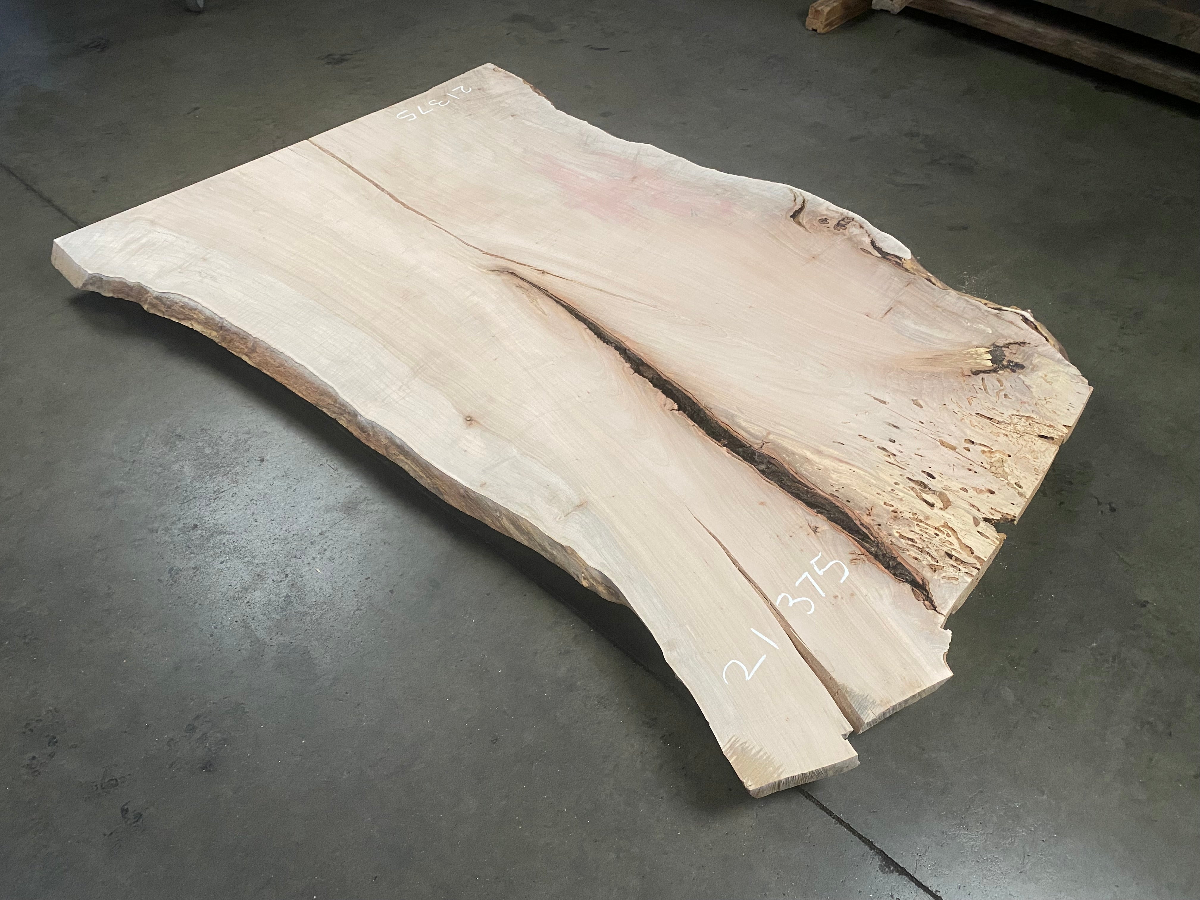 - Leveled & gauged, sanded one side, punky voids on one side, large bark inclusion, mineral staining, light figure