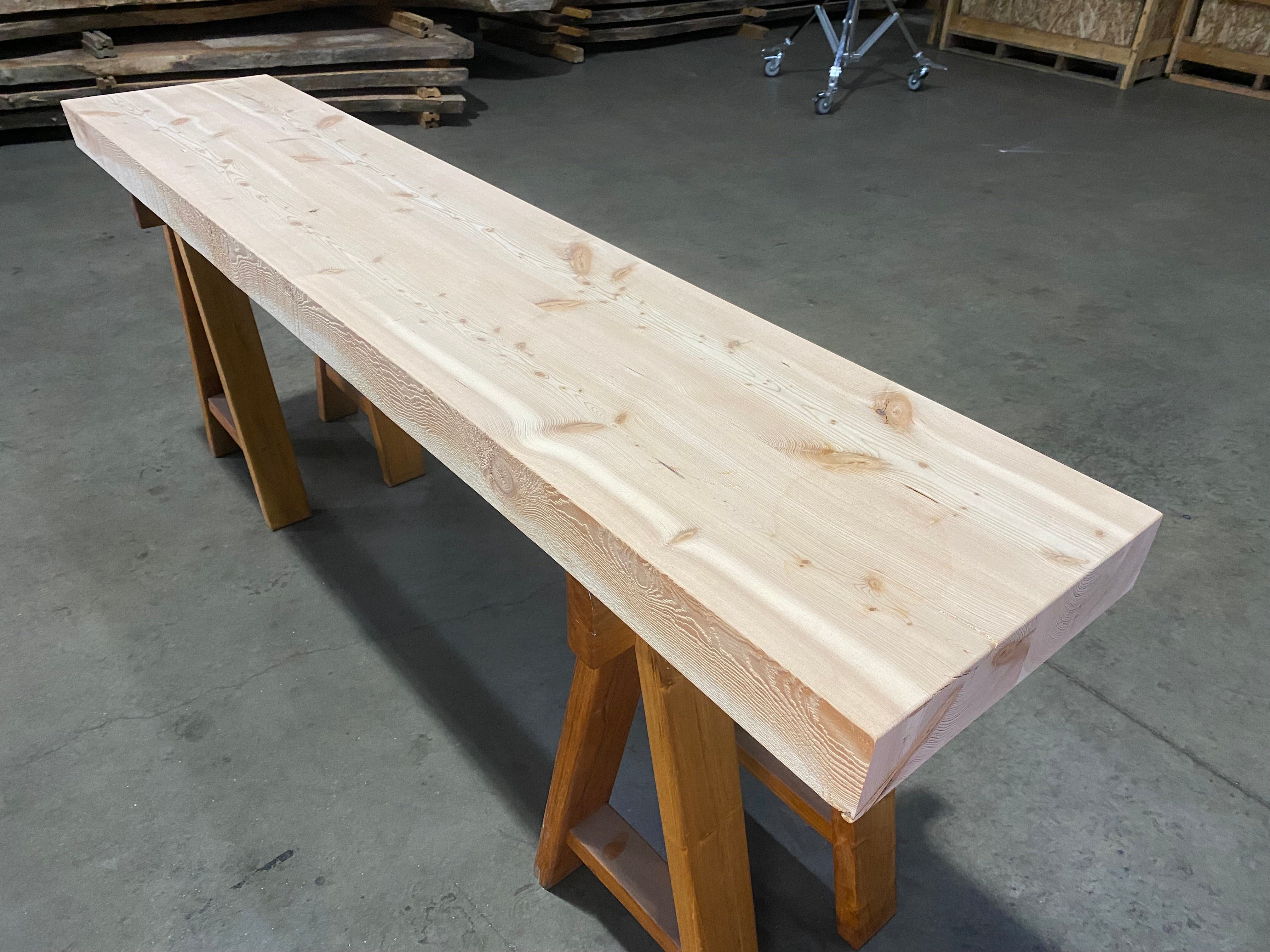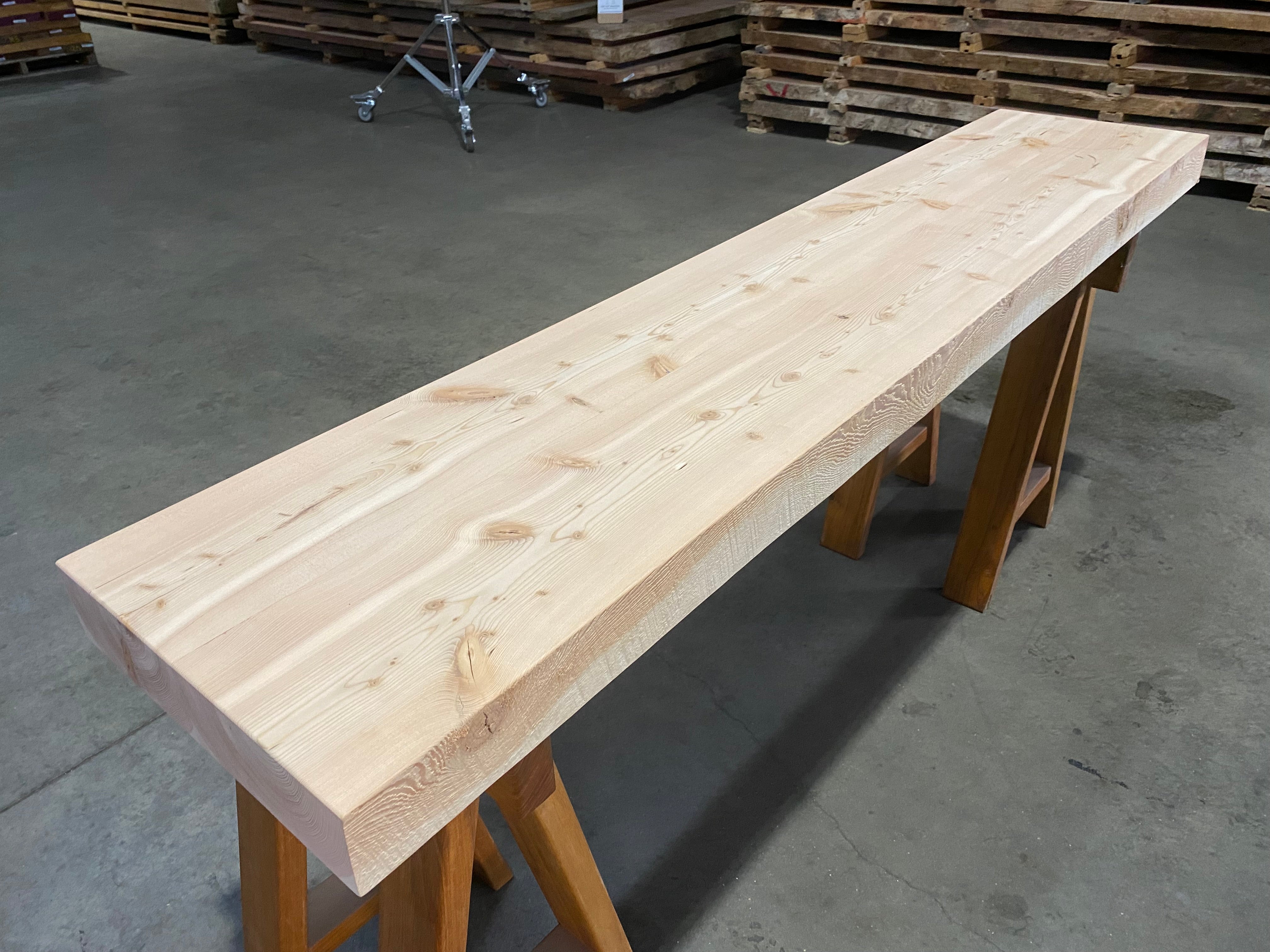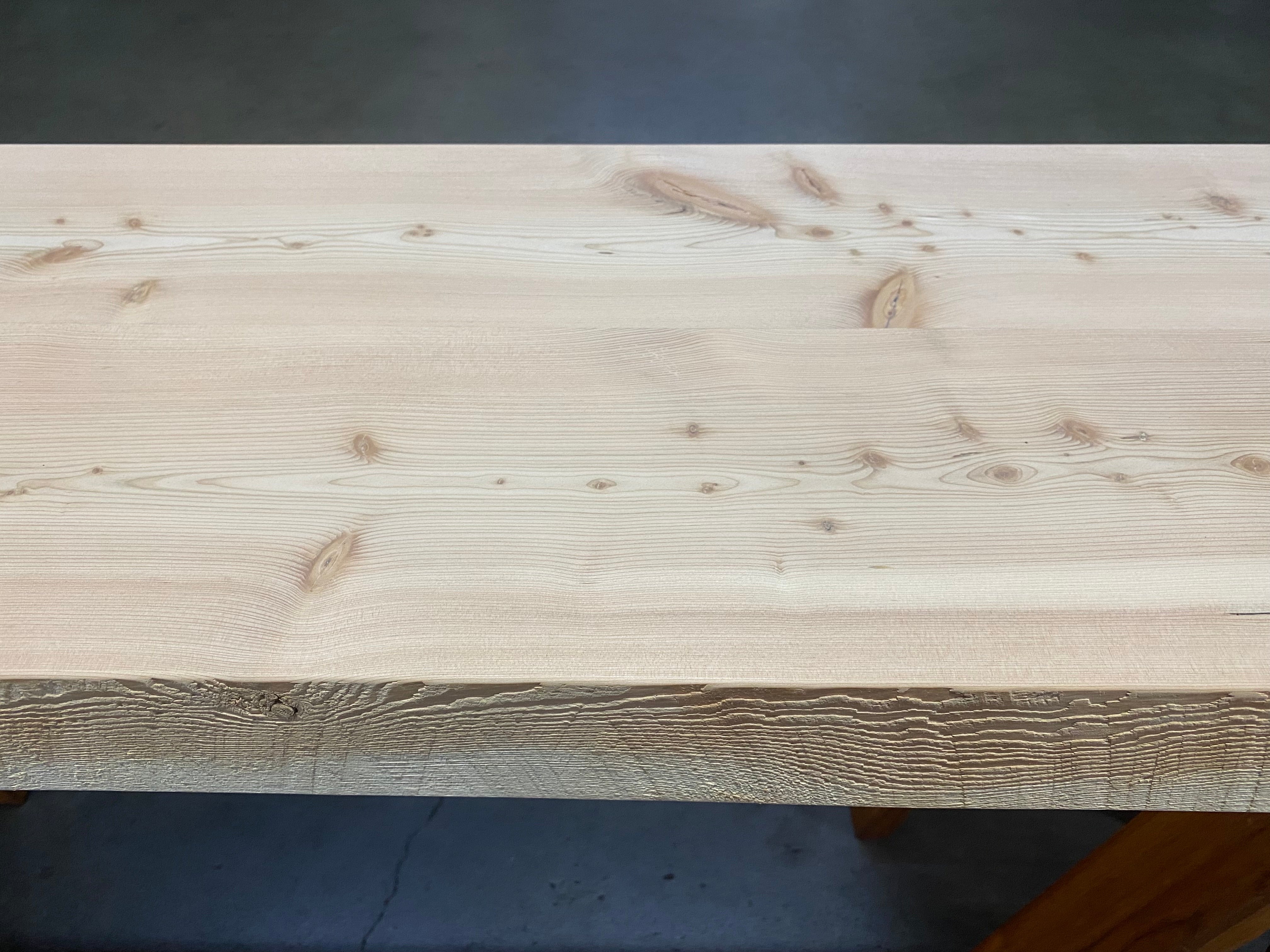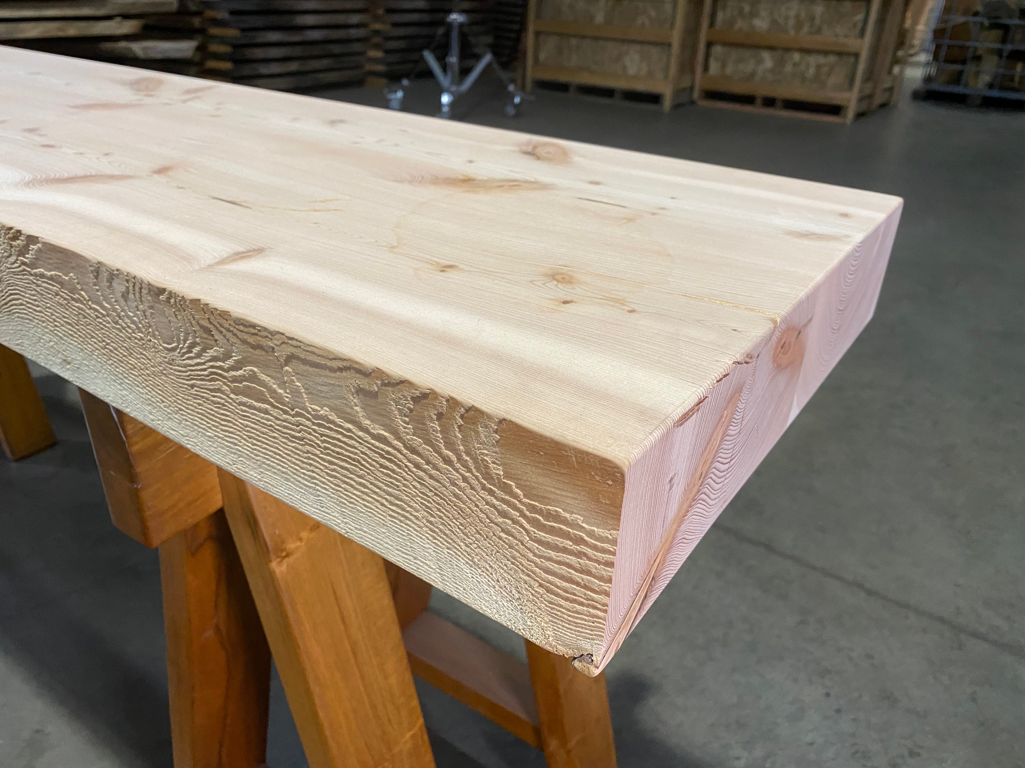- Description: Reclaimed Douglas Fir beam ripped in half and glued together. Straight-lined back edge with sand blasted front edge and square cut ends.