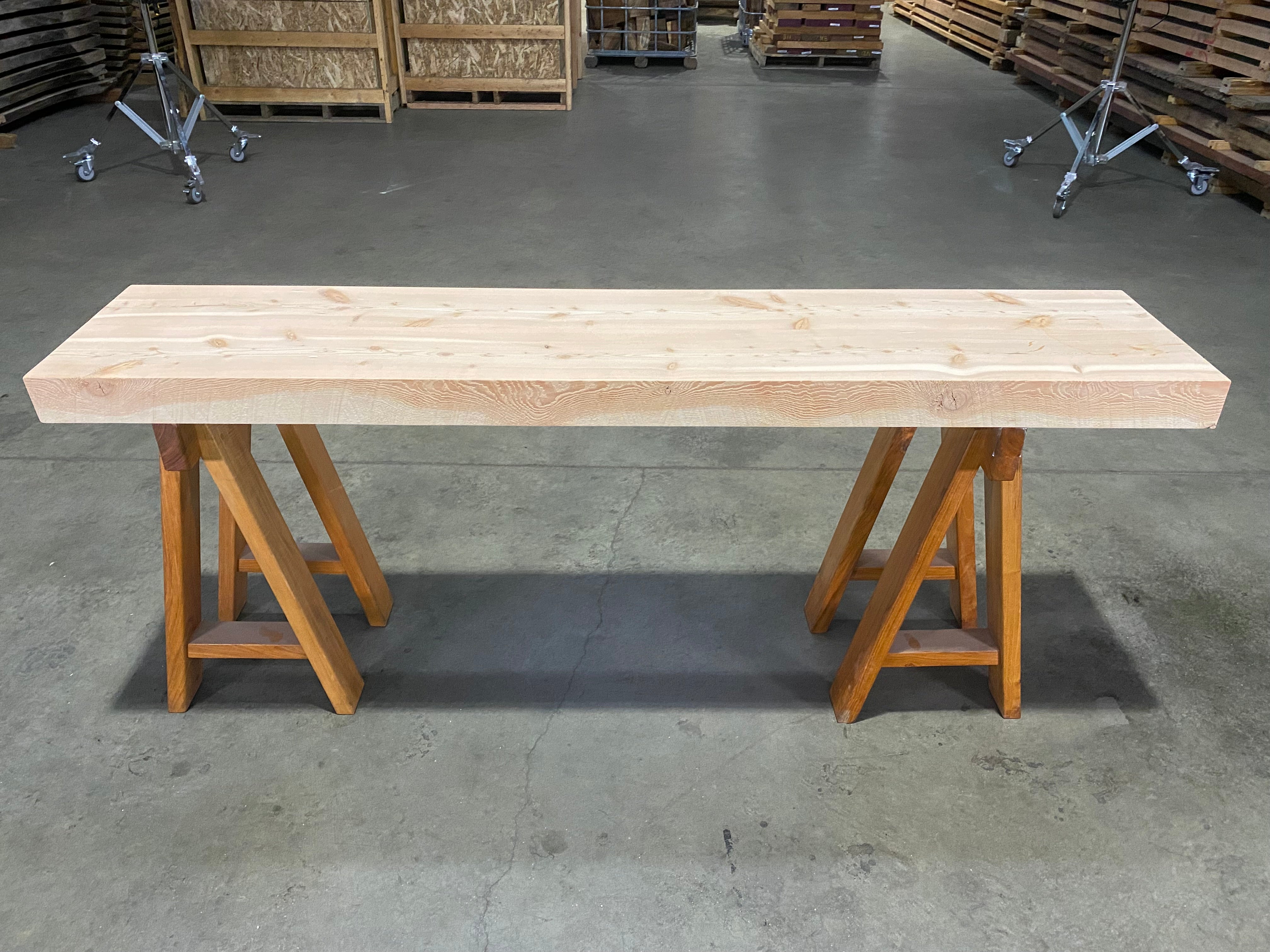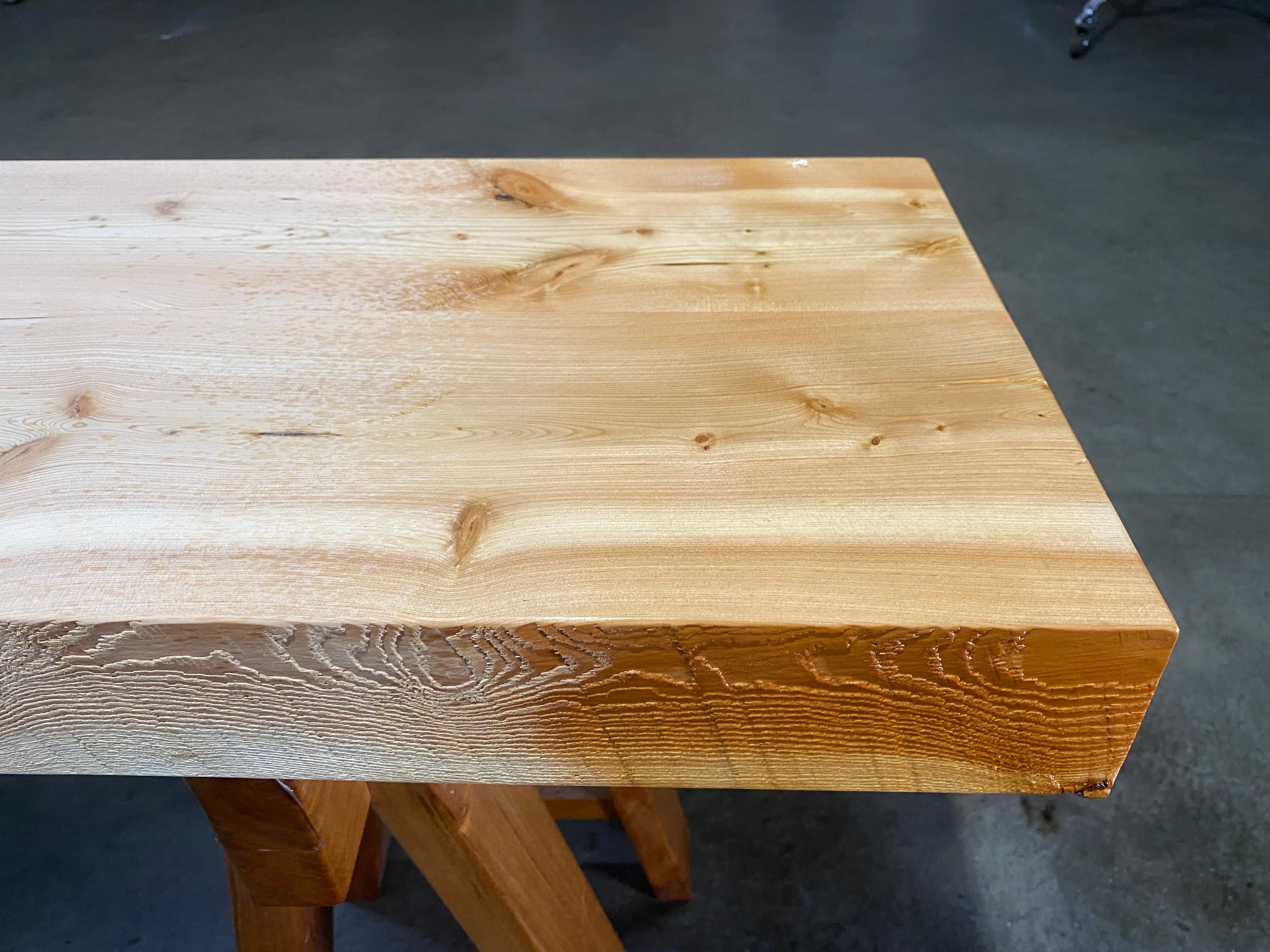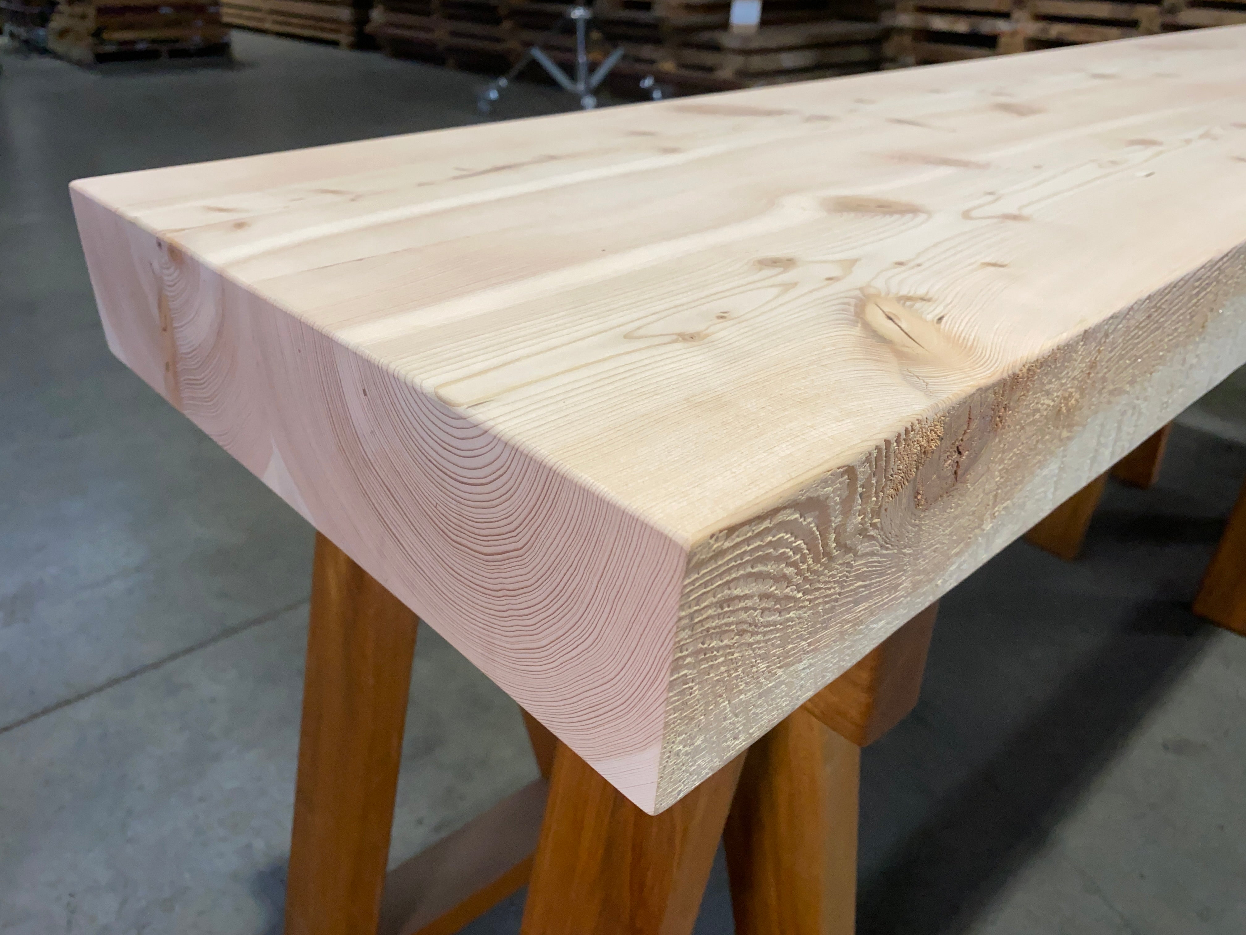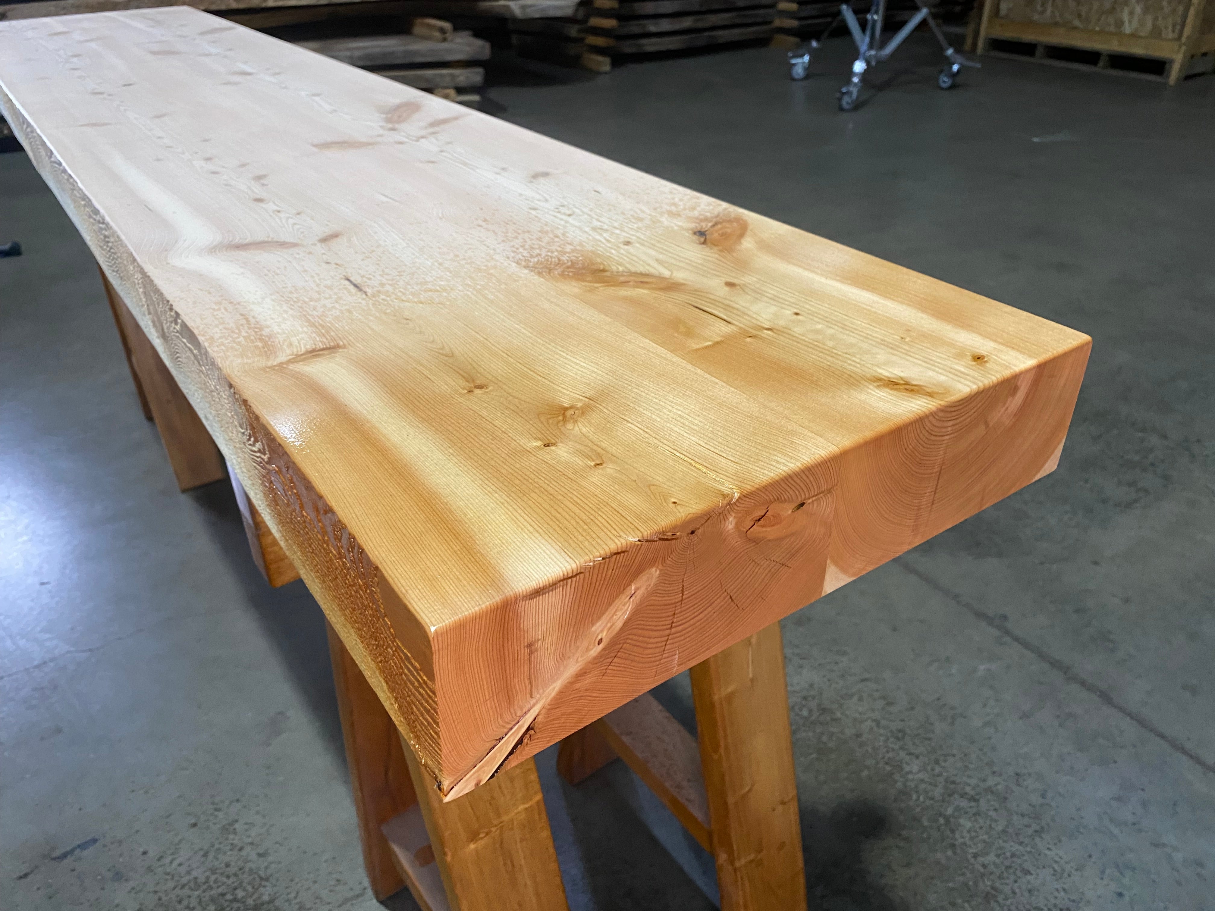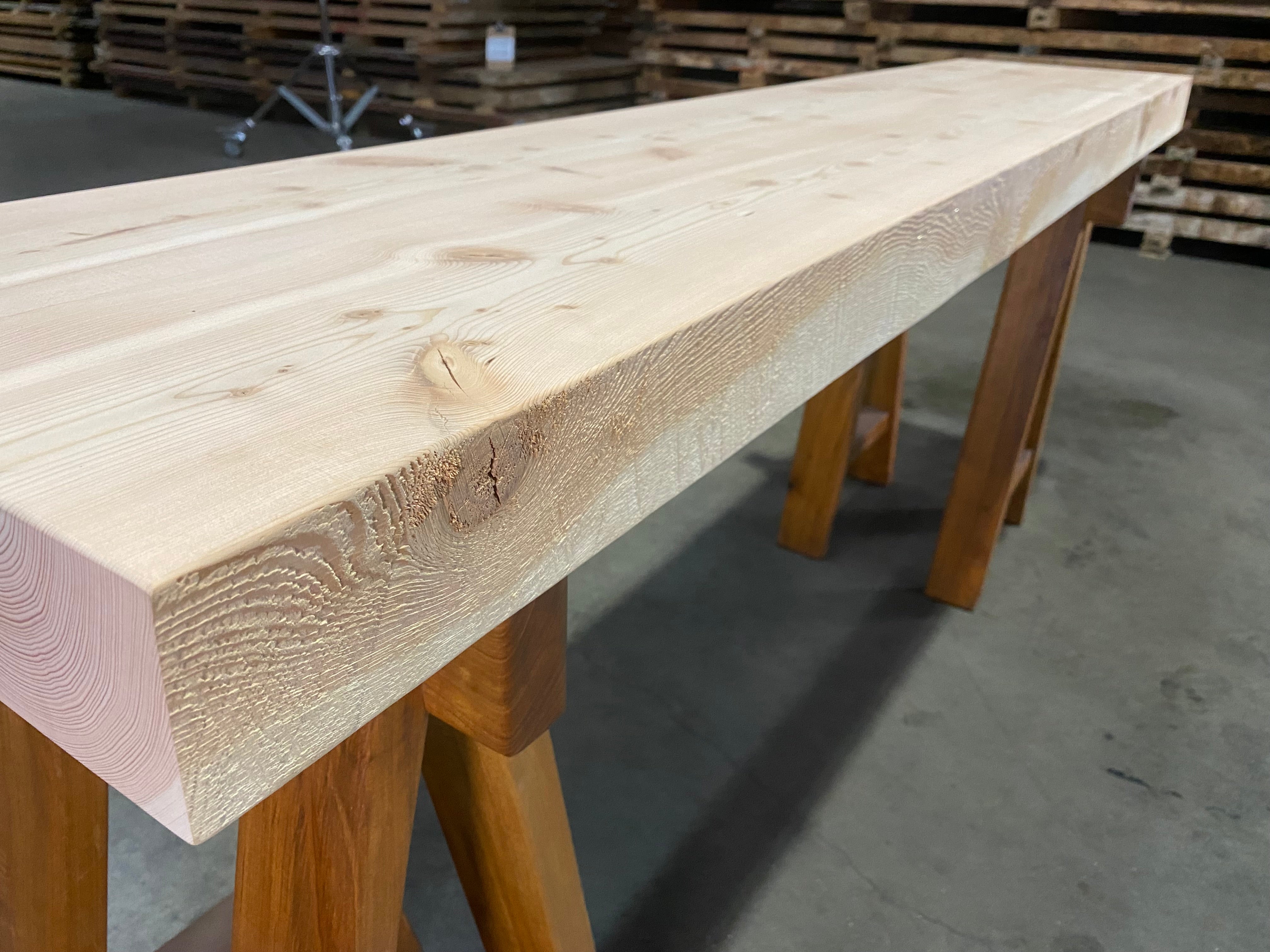 - Description: Reclaimed Douglas Fir beam ripped in half and glued together. Straight-lined back edge with sand blasted front edge and square cut ends.