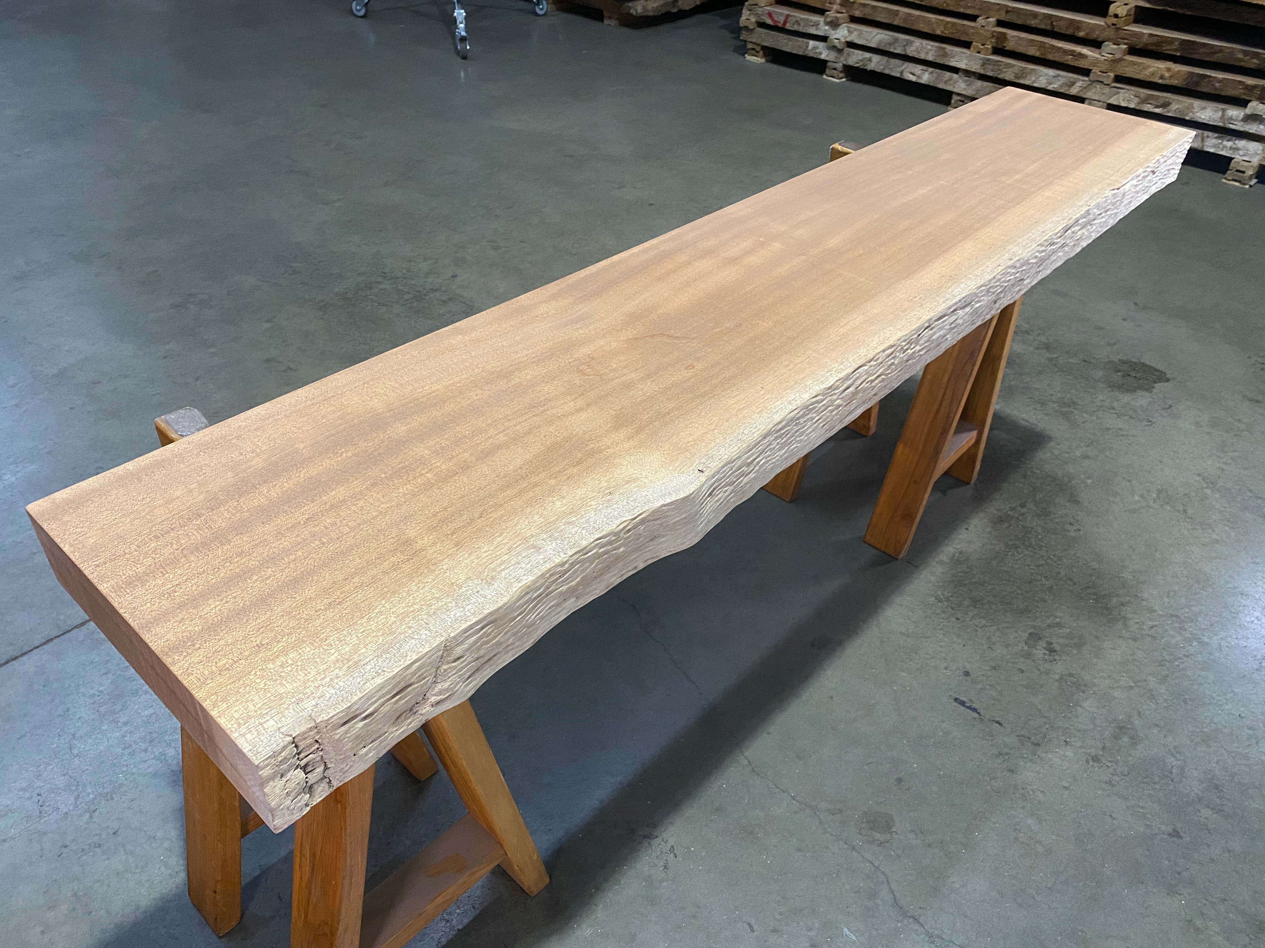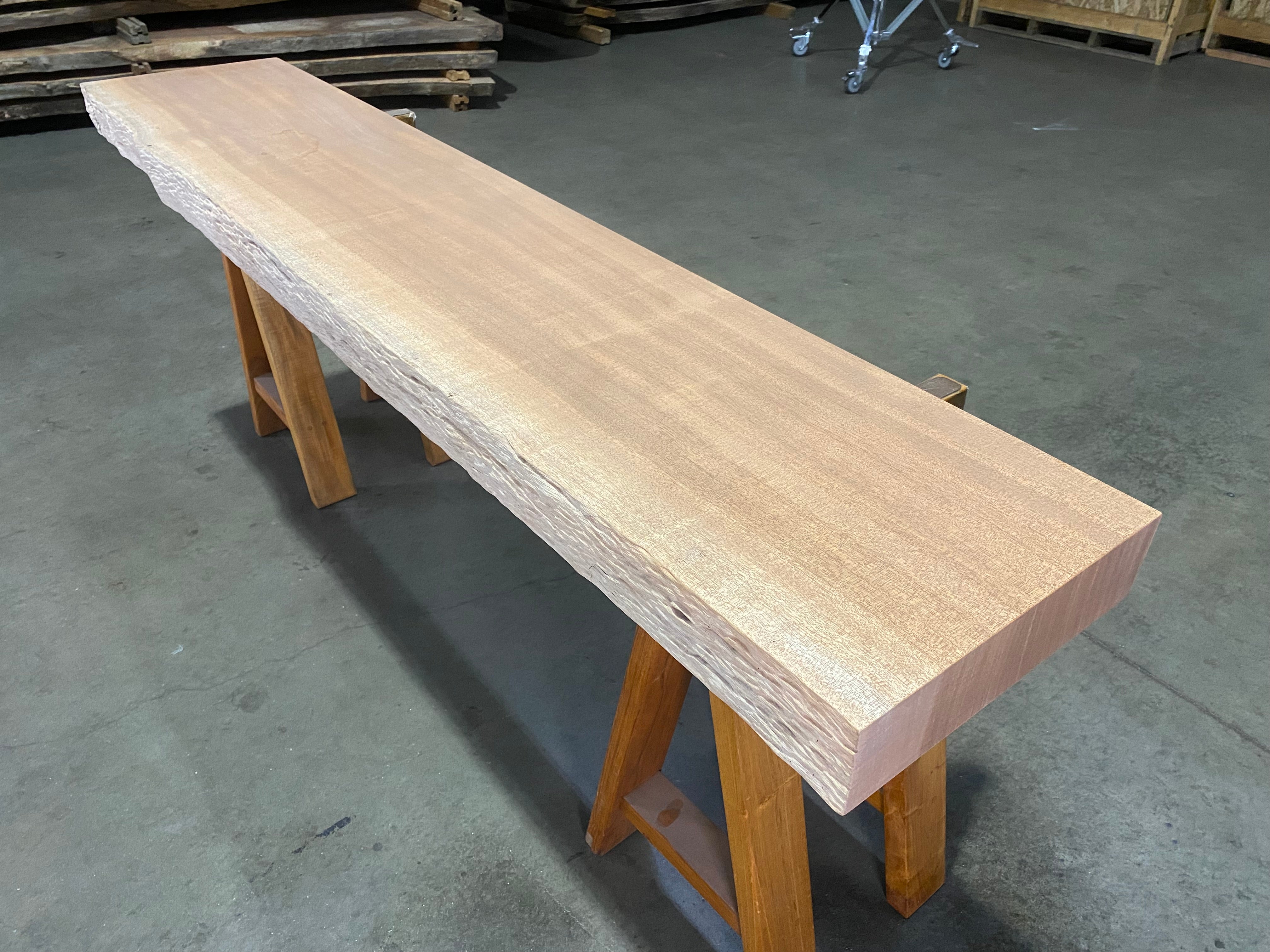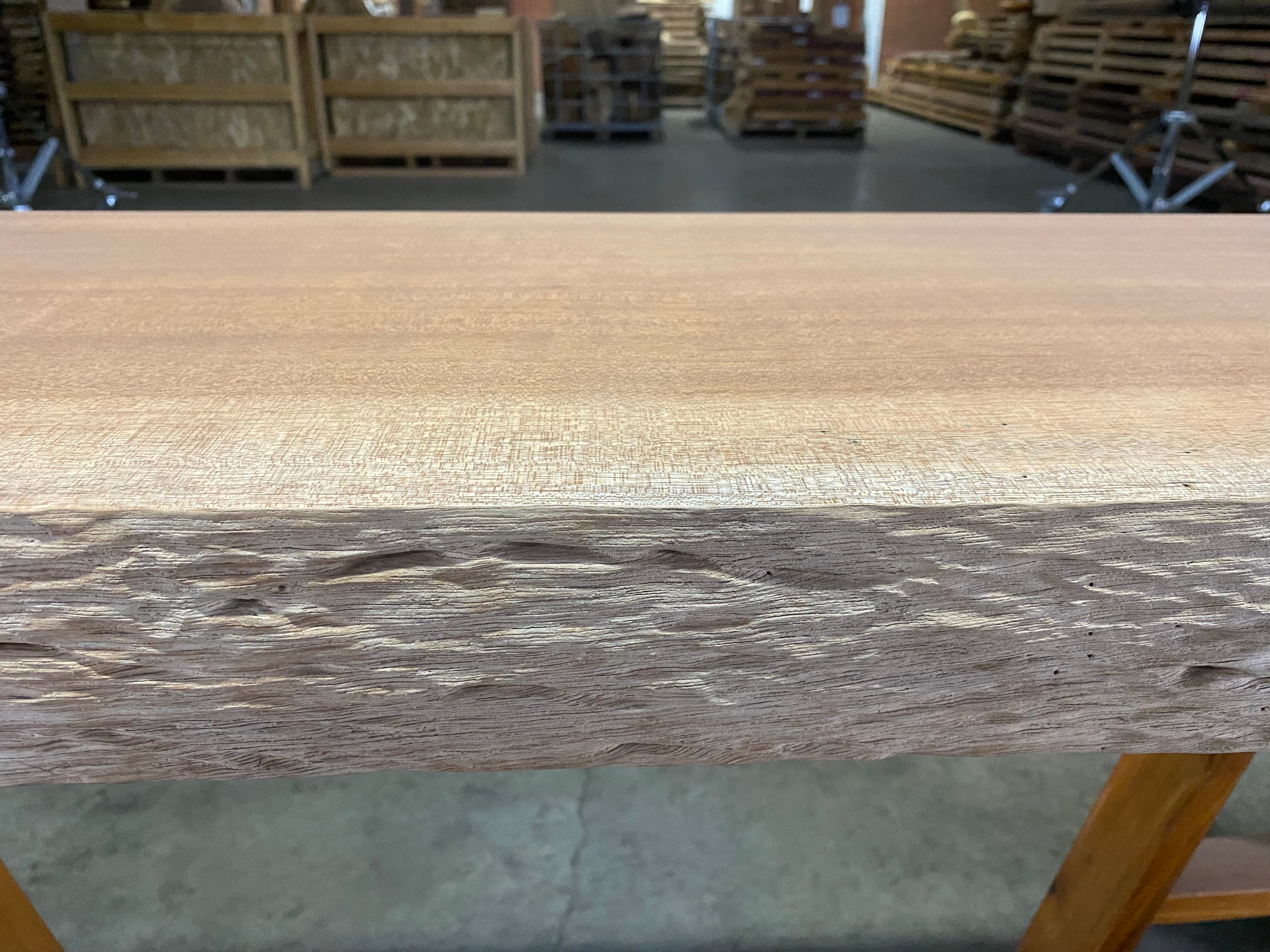 - Description: sand blasted front edge with straight-lined back edge and square cut ends. Dimple textured live edge. Grain has a beautiful light chatoyant ribbon figure.