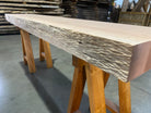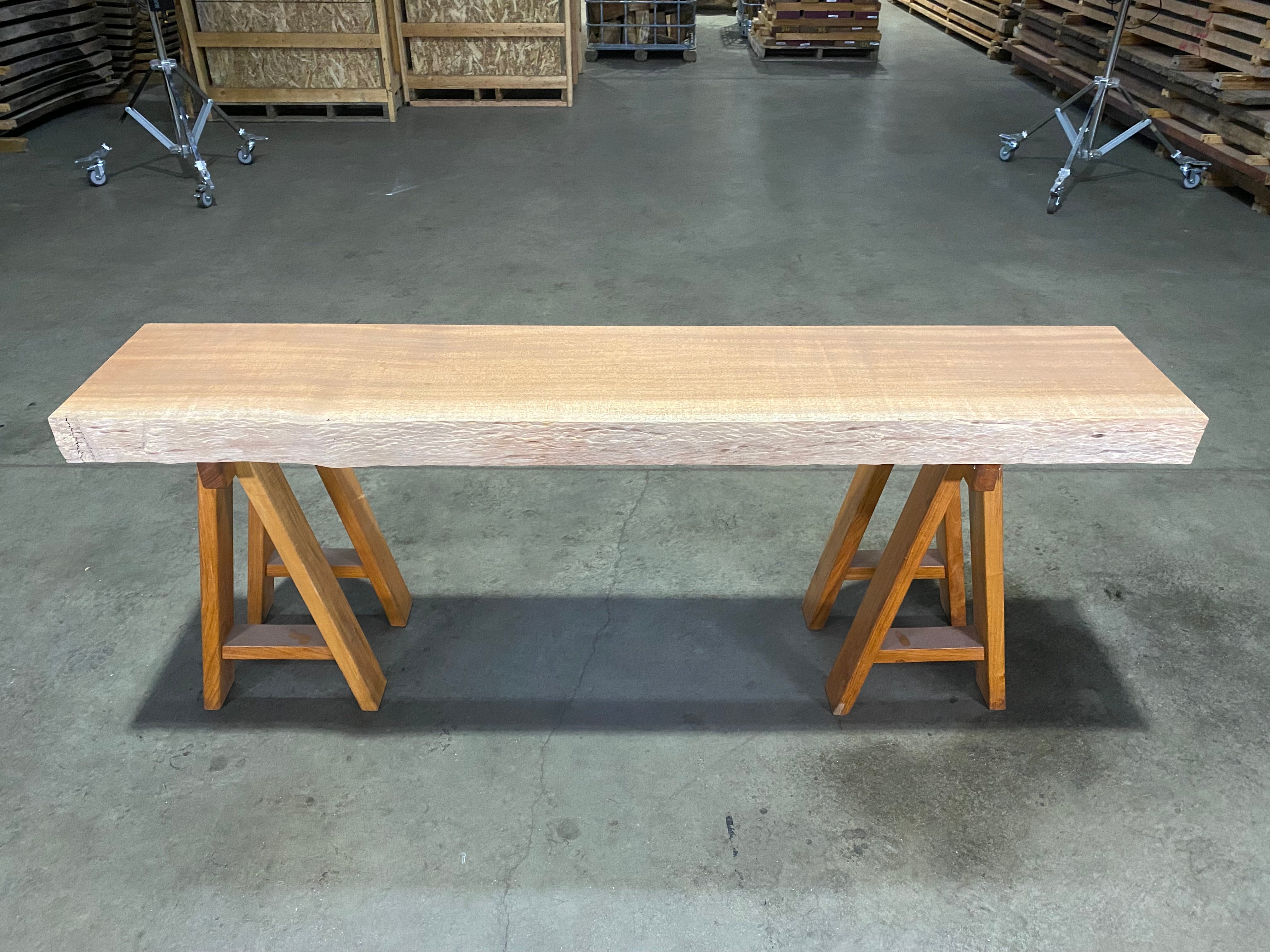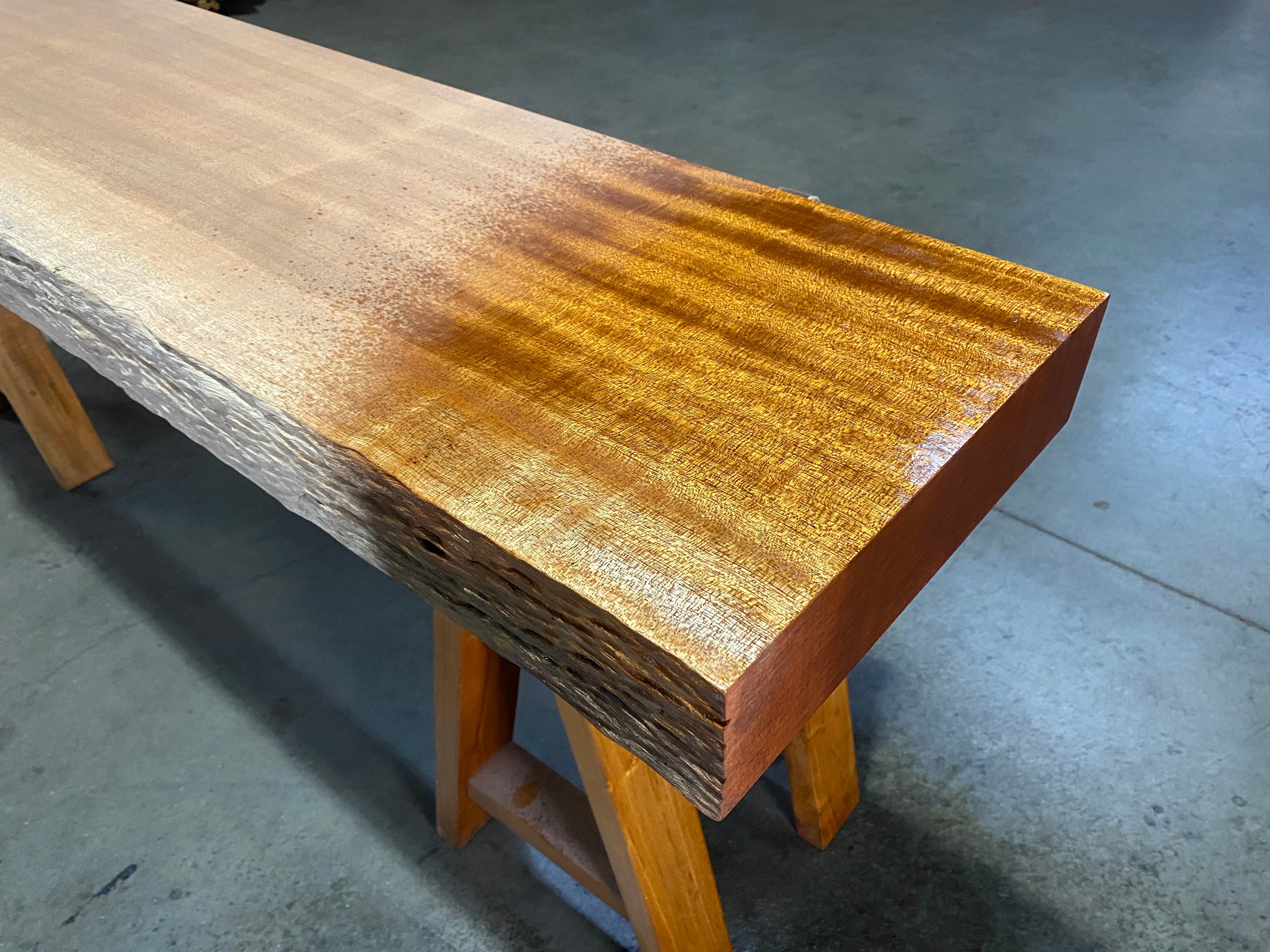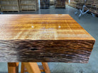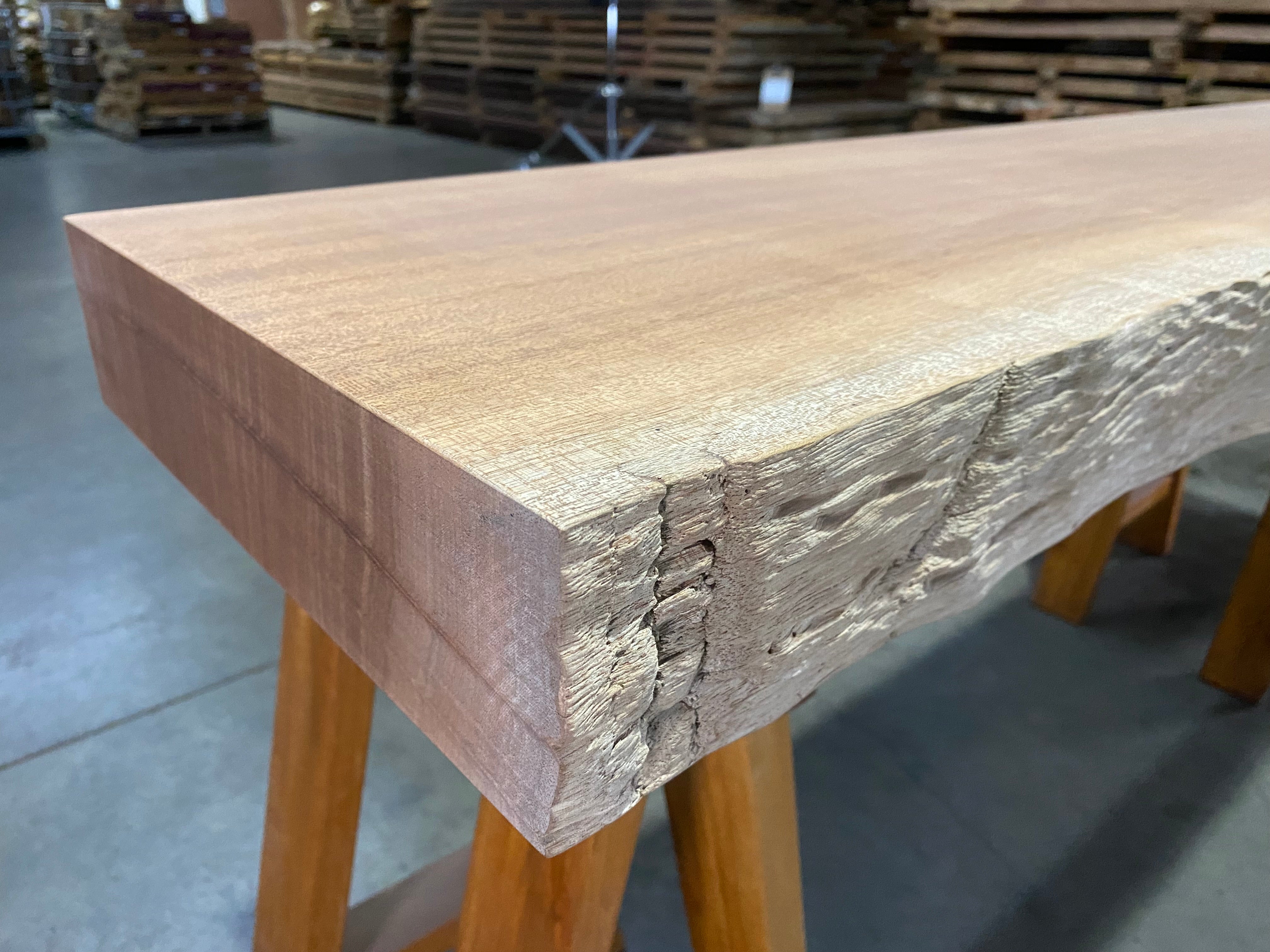 - Description: sand blasted front edge with straight-lined back edge and square cut ends. Dimple textured live edge. Grain has a beautiful light chatoyant ribbon figure.